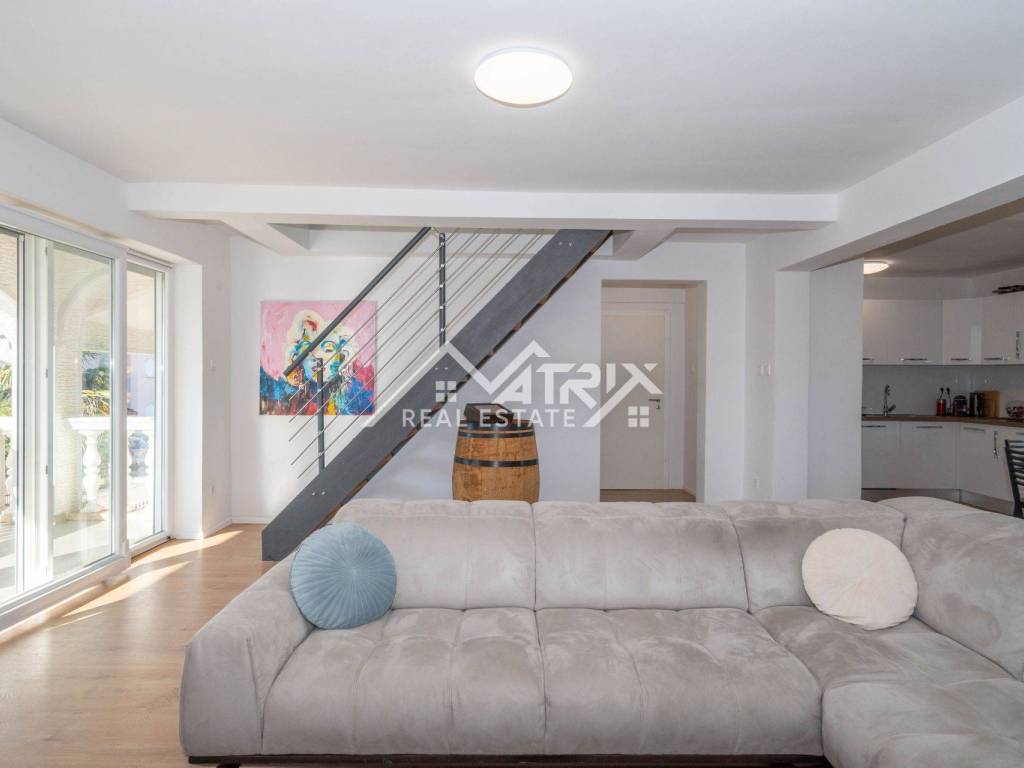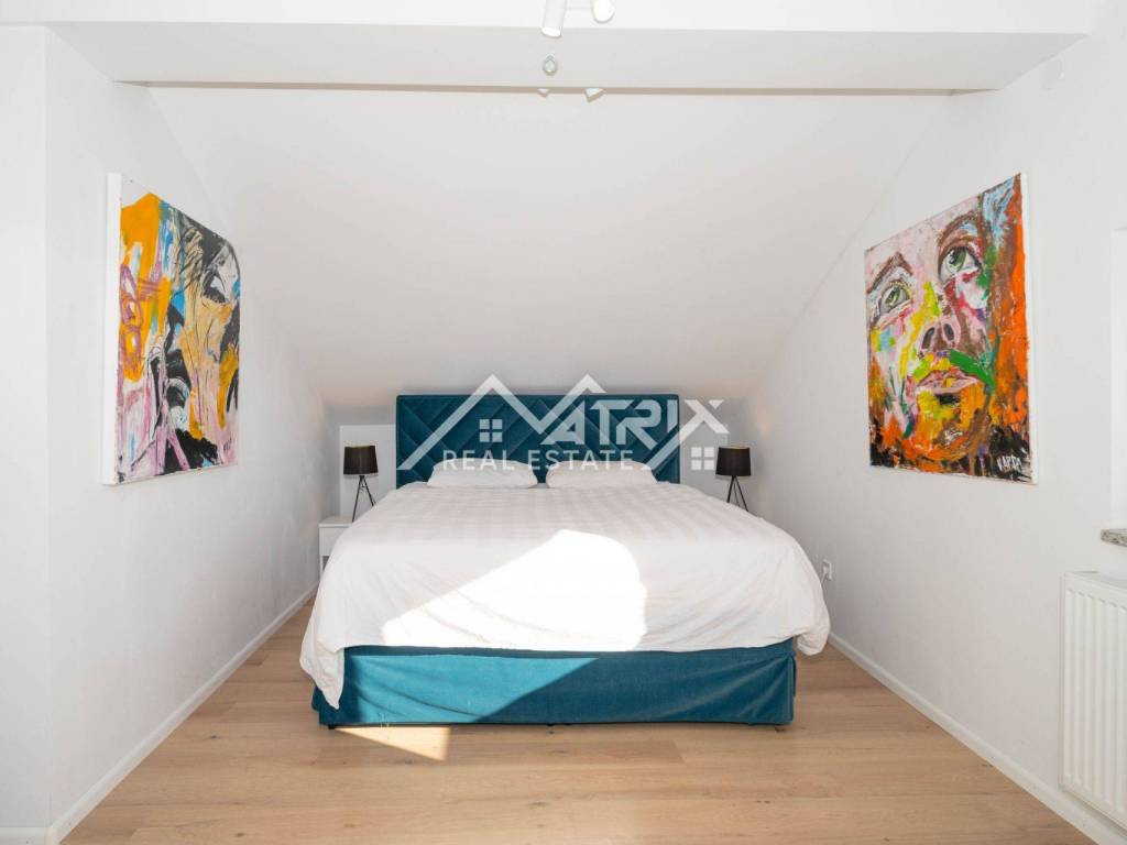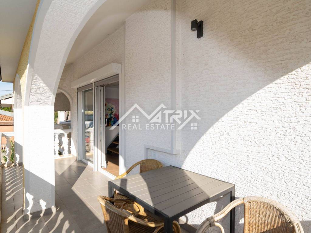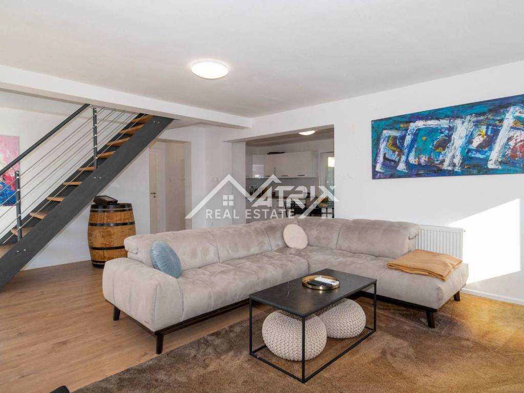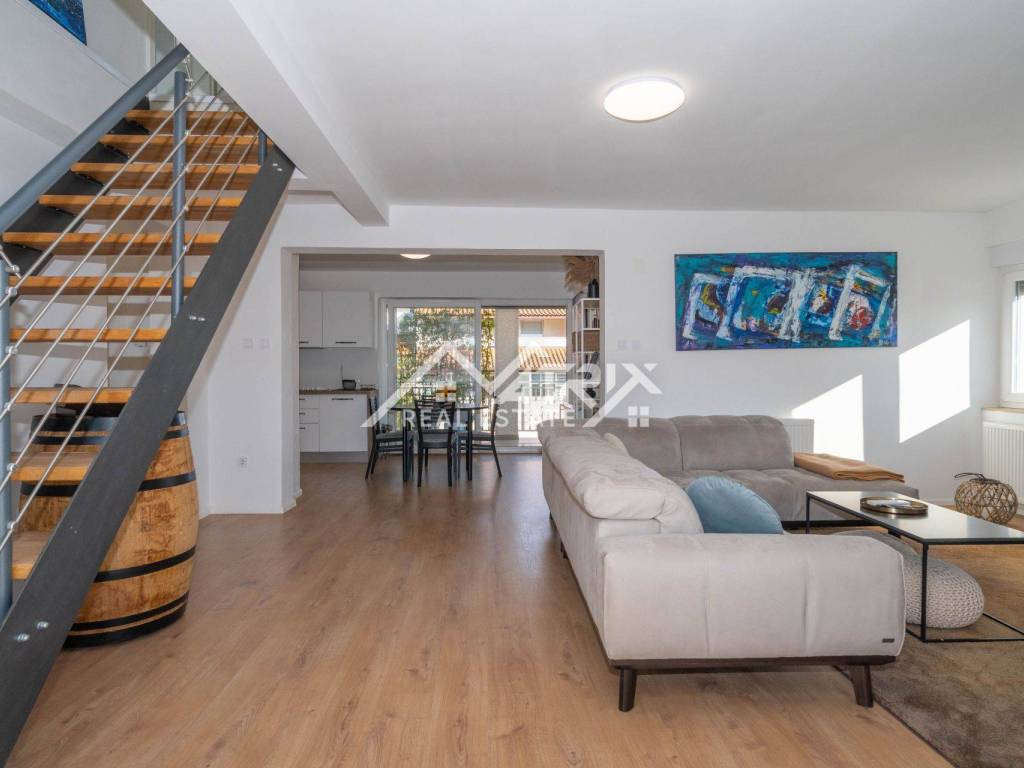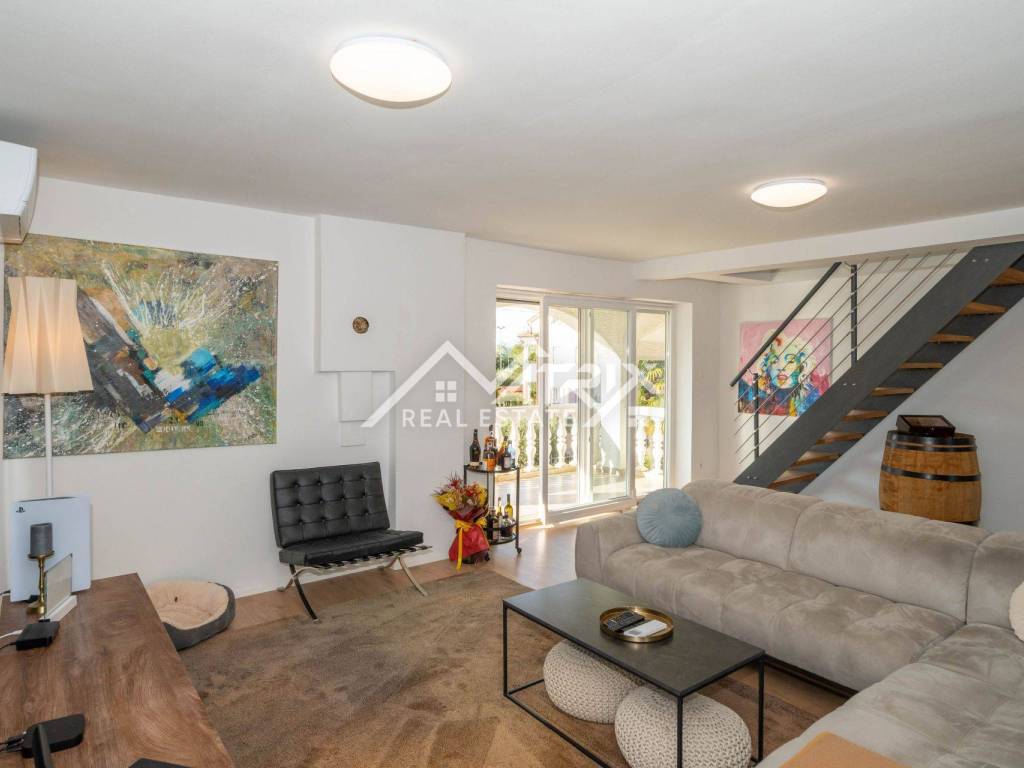 For sale is a two-story apartment located on the first floor of a private house. The apartment has 126 m² and consists of a spacious living room, kitchen, and dining area, all in an open space concept, one bedroom, a bathroom, and two terraces. Stairs lead to the upper floor, where there are two more bedrooms and another bathroom.
