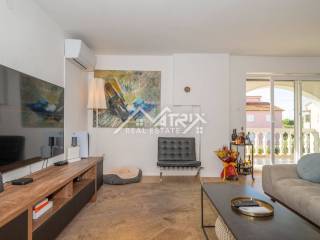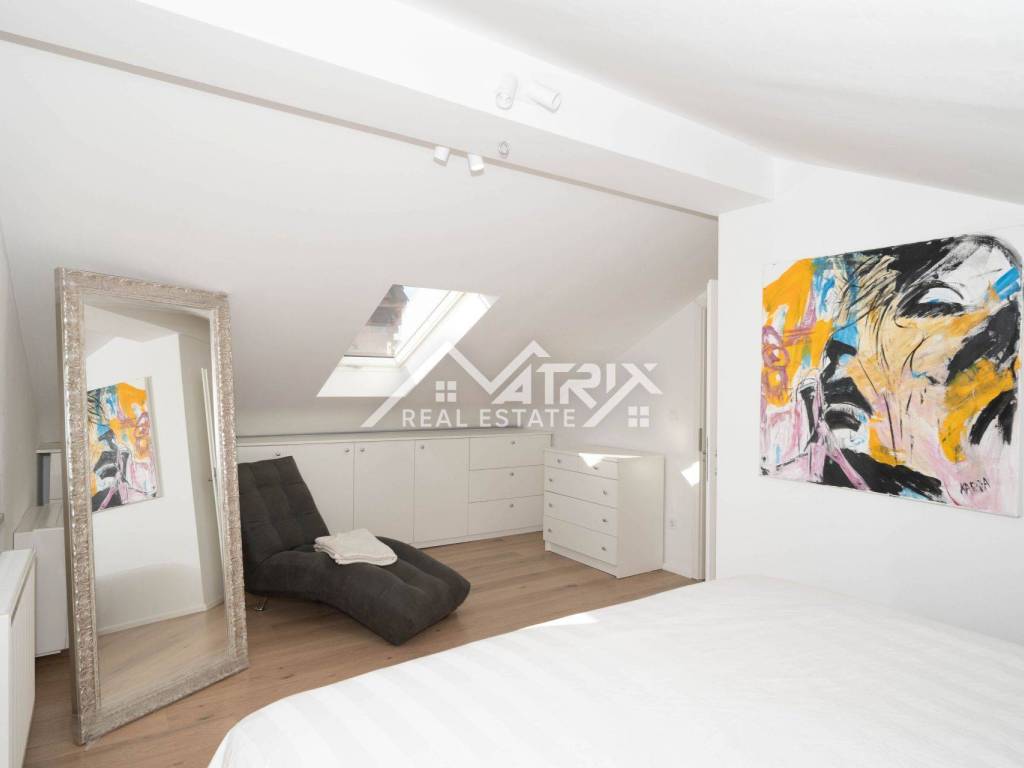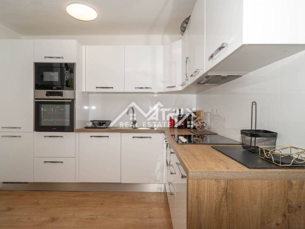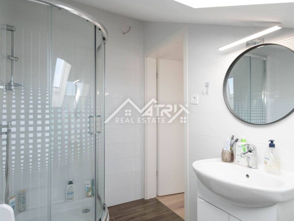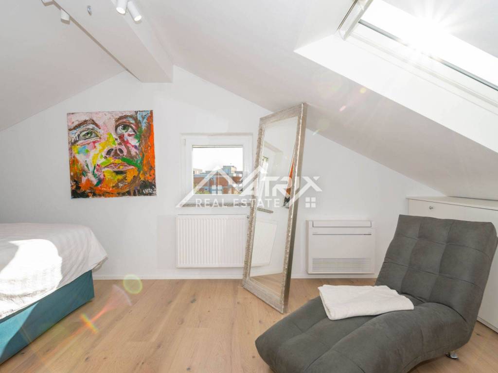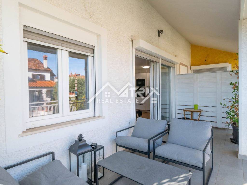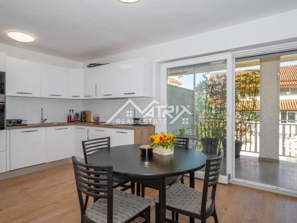 For sale is a two-story apartment located on the first floor of a private house. The apartment has 126 m² and consists of a spacious living room, kitchen, and dining area, all in an open space concept, one bedroom, a bathroom, and two terraces. Stairs lead to the upper floor, where there are two more bedrooms and another bathroom.