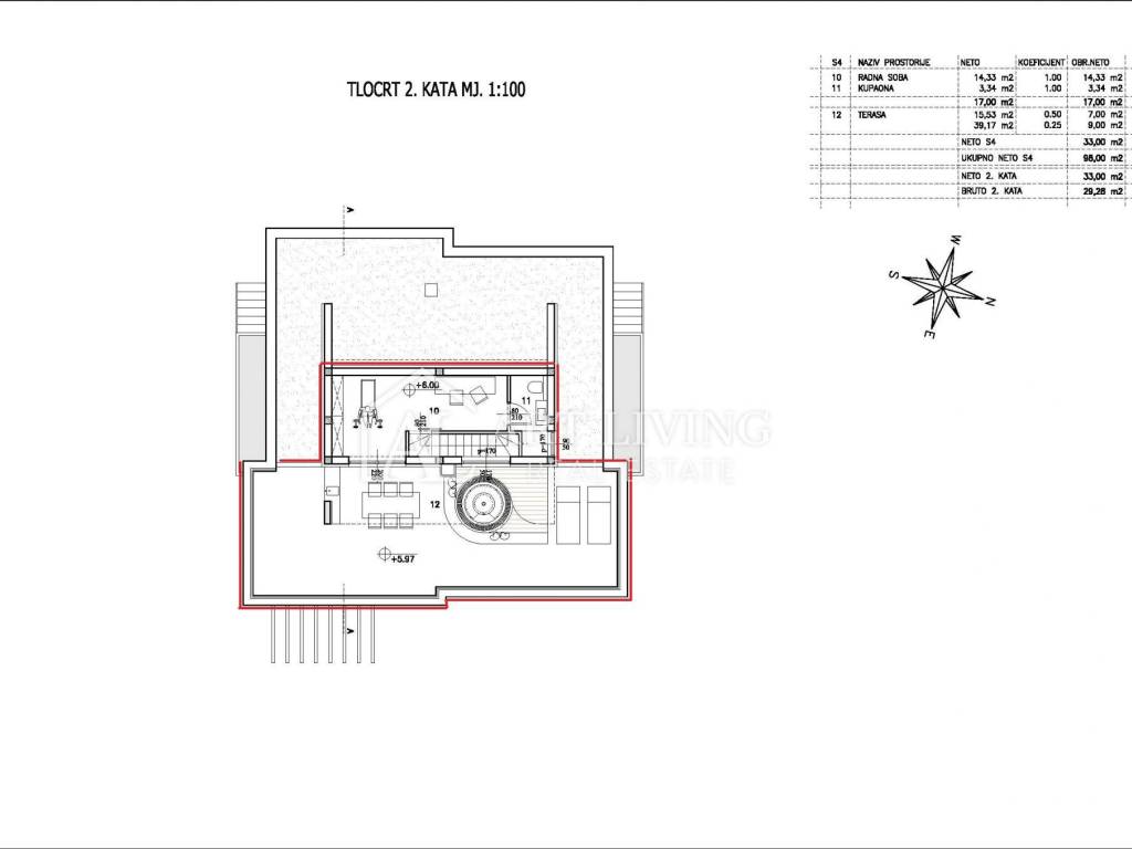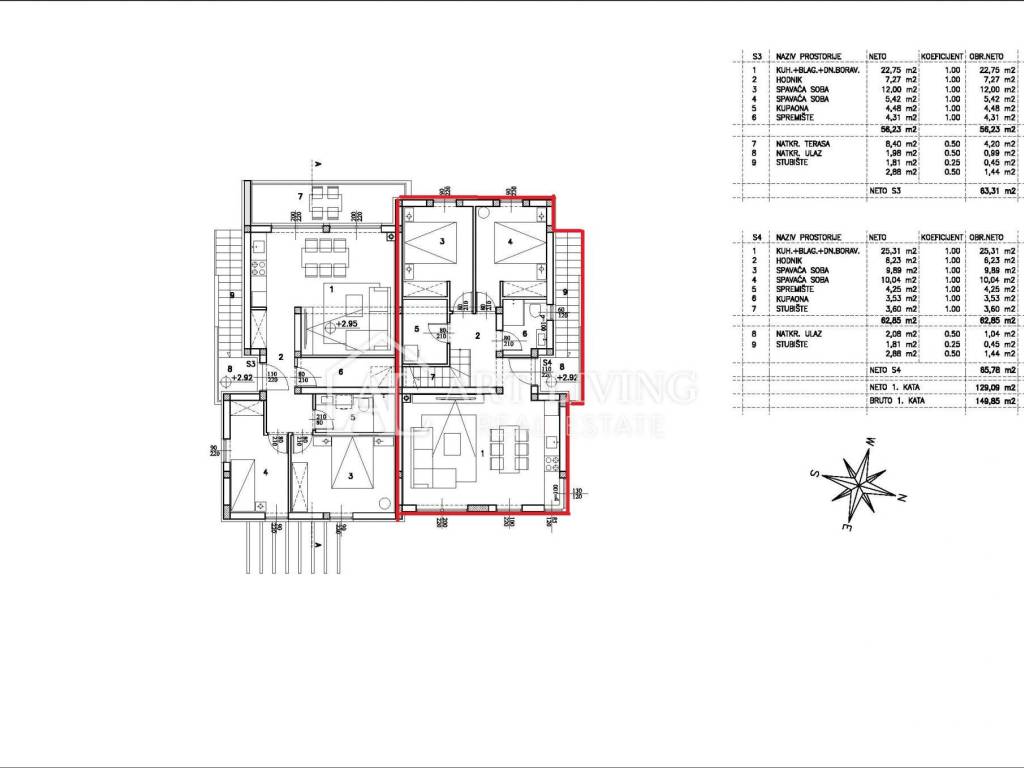 The apartment on the 1st floor with a total area of 90 m2 consists of a hallway, a living room with an open kitchen and dining room, 2 bedrooms, a study that can also be used as a bedroom, 2 bathrooms, a storage room and a large roof terrace of 55 m2 ( partially covered) with a hot tub, a planned summer kitchen and a beautiful view of the sea