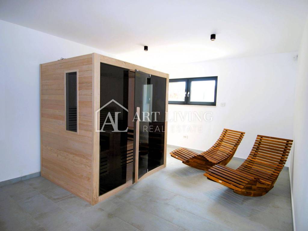 The basement of the villa is extremely functionally decorated with its own wellness and lounge area, an infrared sauna and a room intended for a fitness studio.