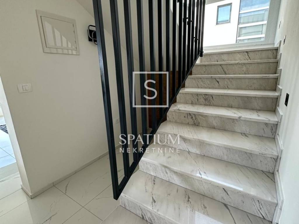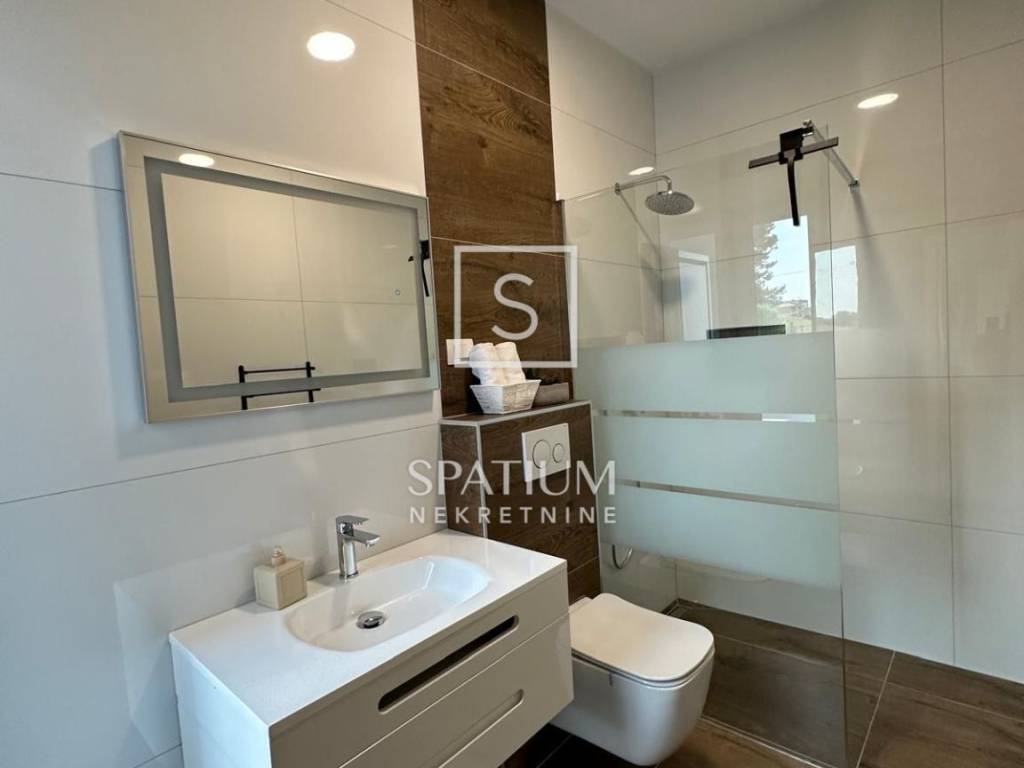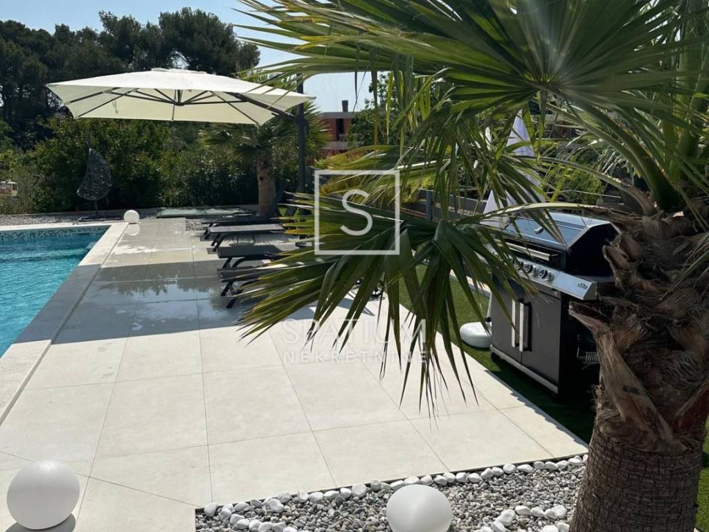 The ground floor of the house consists of an elegant entrance hall with a built-in wardrobe, a spacious kitchen connected to the dining room and living room, from which there is direct access to the covered terrace and swimming pool. On the same floor there are two bedrooms, each with its own bathroom, and an additional guest toilet.