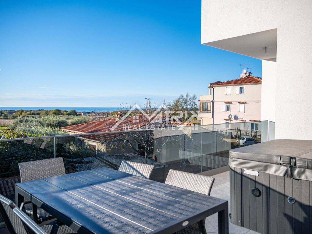 A special highlight is the large 19.14-square-meter terrace featuring a built-in jacuzzi, perfect for unwinding with a glass of wine or socializing under the stars. The terrace offers a stunning view of the sea, making every moment spent there unforgettable.