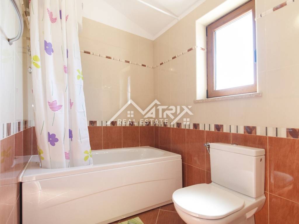 Upstairs, there are two comfortable bedrooms, one of which has a private balcony with a stunning sea view. An elegant bathroom with high-quality fittings is also located on this level.