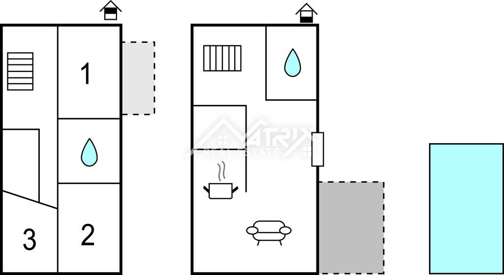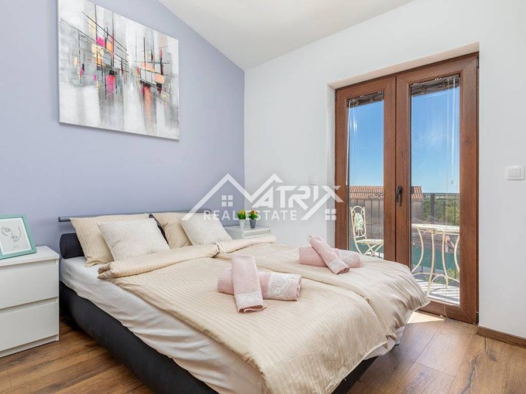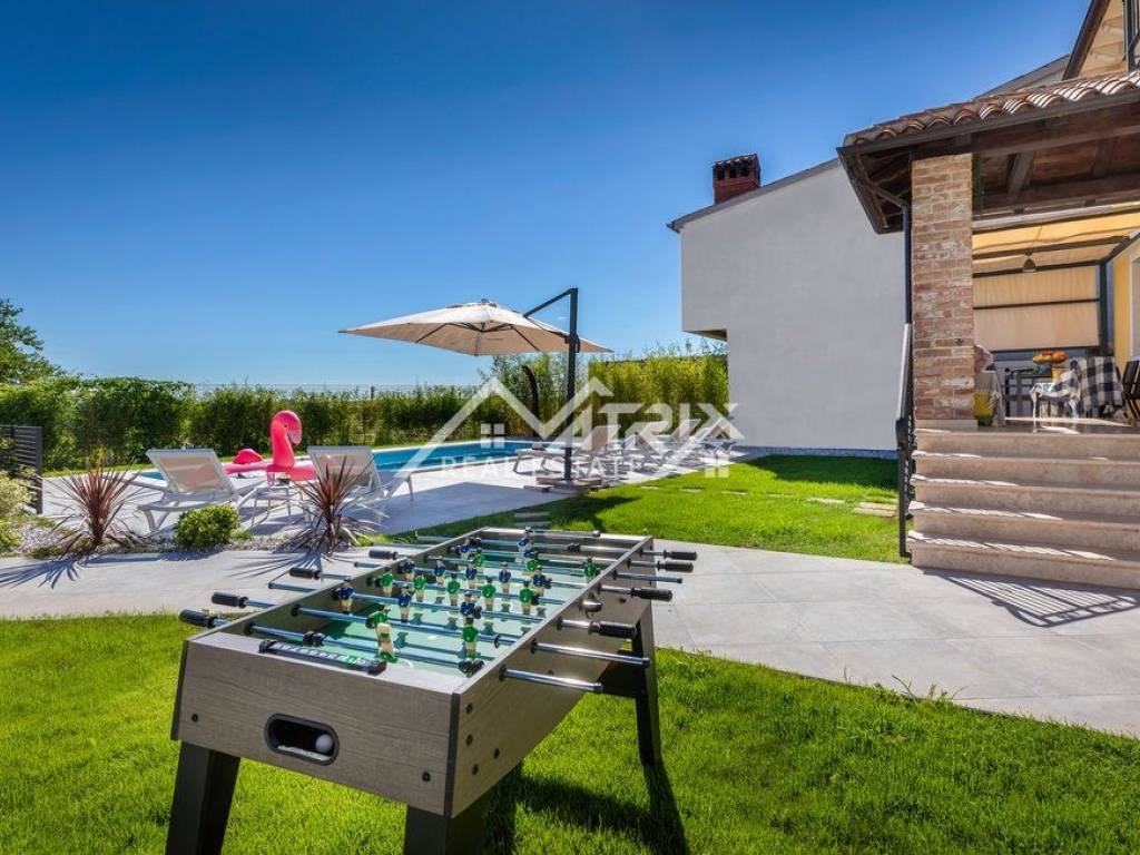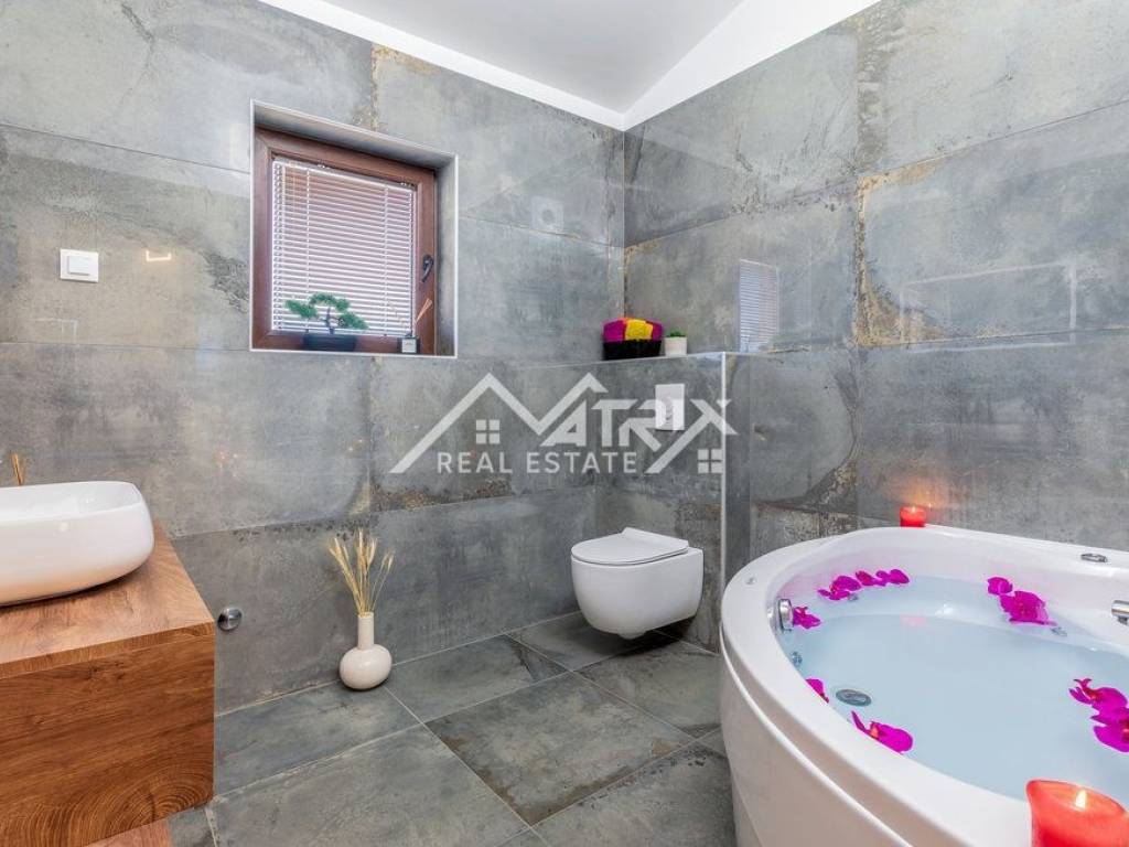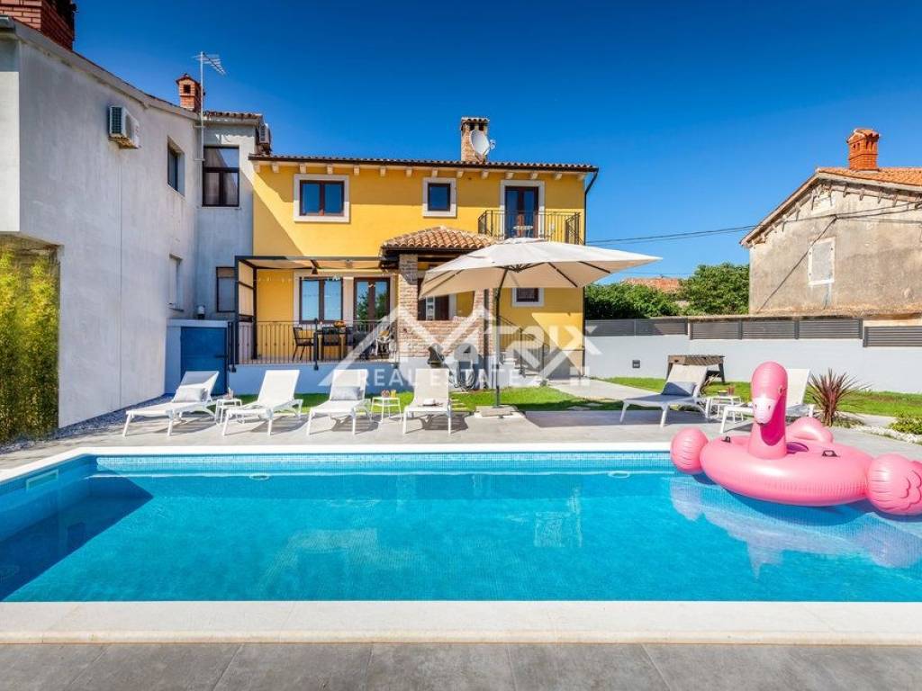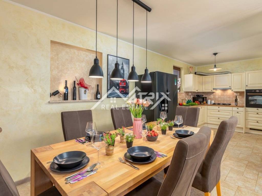 In the peaceful village of Jadreški, just a short distance from Pula and only five kilometers from the sea, a beautifully renovated stone house is for sale, combining Istrian charm with modern comfort. The house has 140 m² of living space spread over two floors. The ground floor features a spacious open-plan living room with a modern kitchen and dining area, a bathroom, and a storage room. From the living area, you can access a covered terrace with views of the landscaped garden and swimming pool. The upper floor offers three comfortable bedrooms, a bathroom, a wardrobe, and a terrace that provides extra privacy and relaxation space.