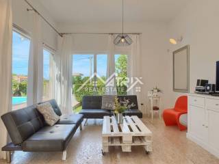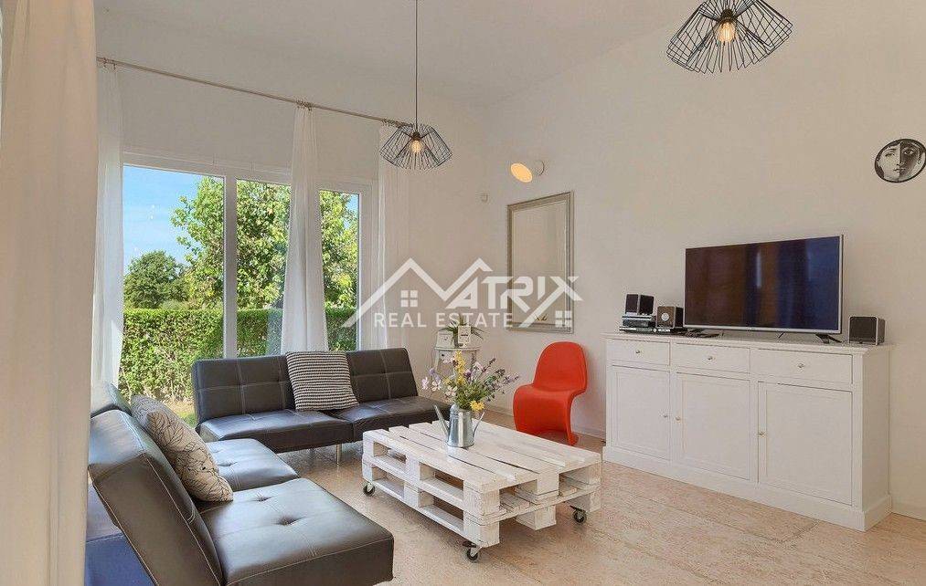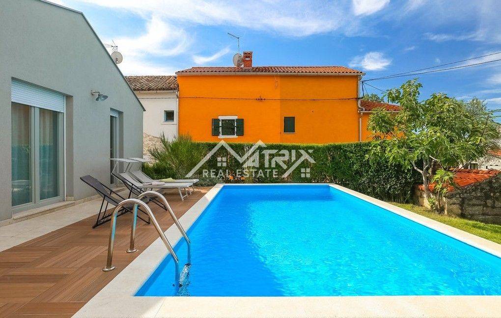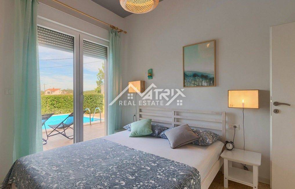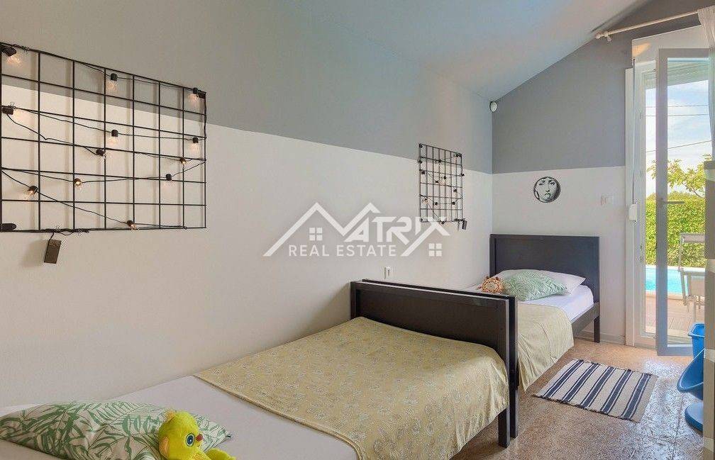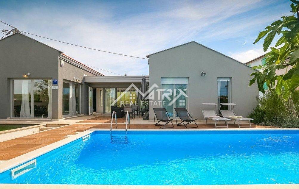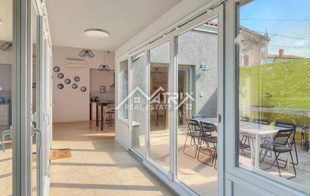 Modern single-storey house of 147 m² in the peaceful surroundings of Poreč, just approx. 5 km from the town and well-kept beaches, offering a smart layout and comfortable step-free living. The open-plan living area—kitchen, dining and lounge—flows seamlessly, while the sleeping quarters are discreetly separated and comprise three bedrooms, with the principal bedroom featuring an en-suite bathroom. A distinctive glass corridor designed as sliding glass walls can be fully opened in summer to connect both sides of the plot, bringing in abundant natural light and a sense of airiness. In front of the house are a spacious sun deck and a pool for relaxing in the warmer months, while at the heart of the layout sits a practical summer kitchen—ideal for laid-back gatherings and outdoor dining. Functional, bright and comfortable, the house is equipped with air-conditioning units and radiators, and thanks to its proximity to town and amenities it also represents a very good investment for tourist rental.