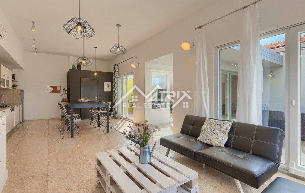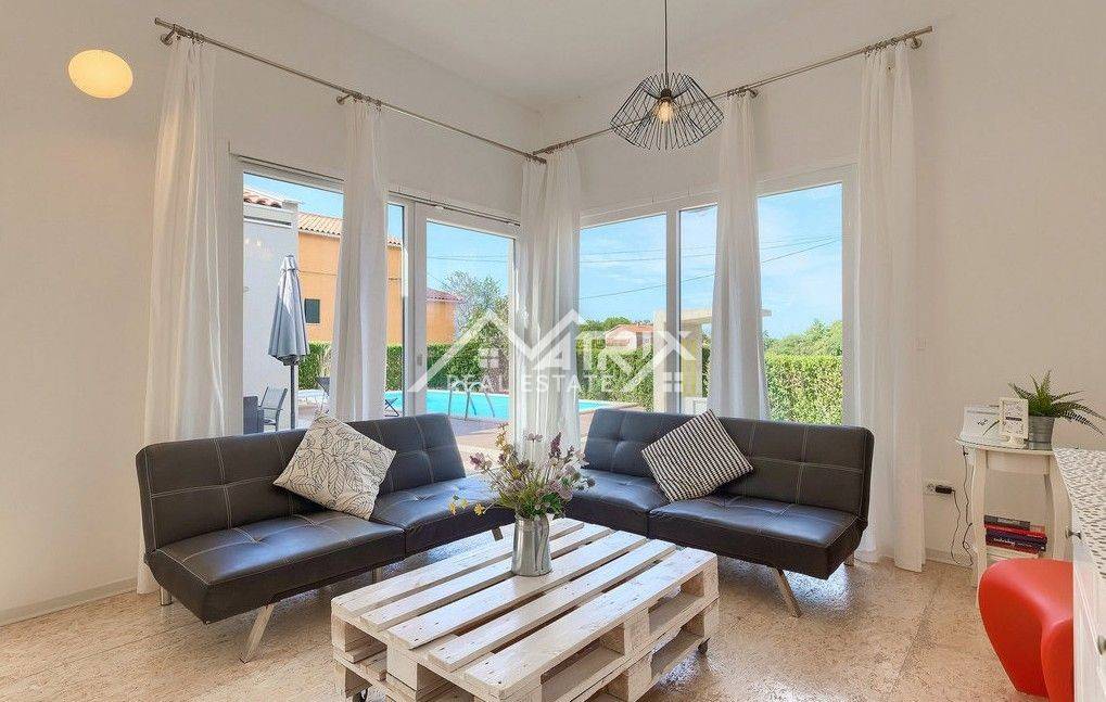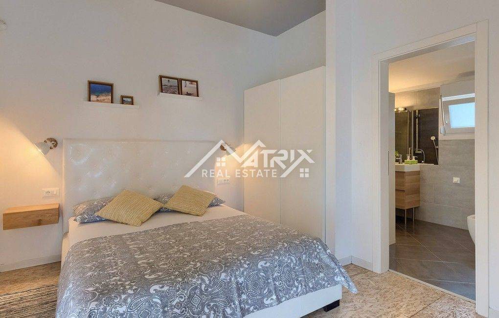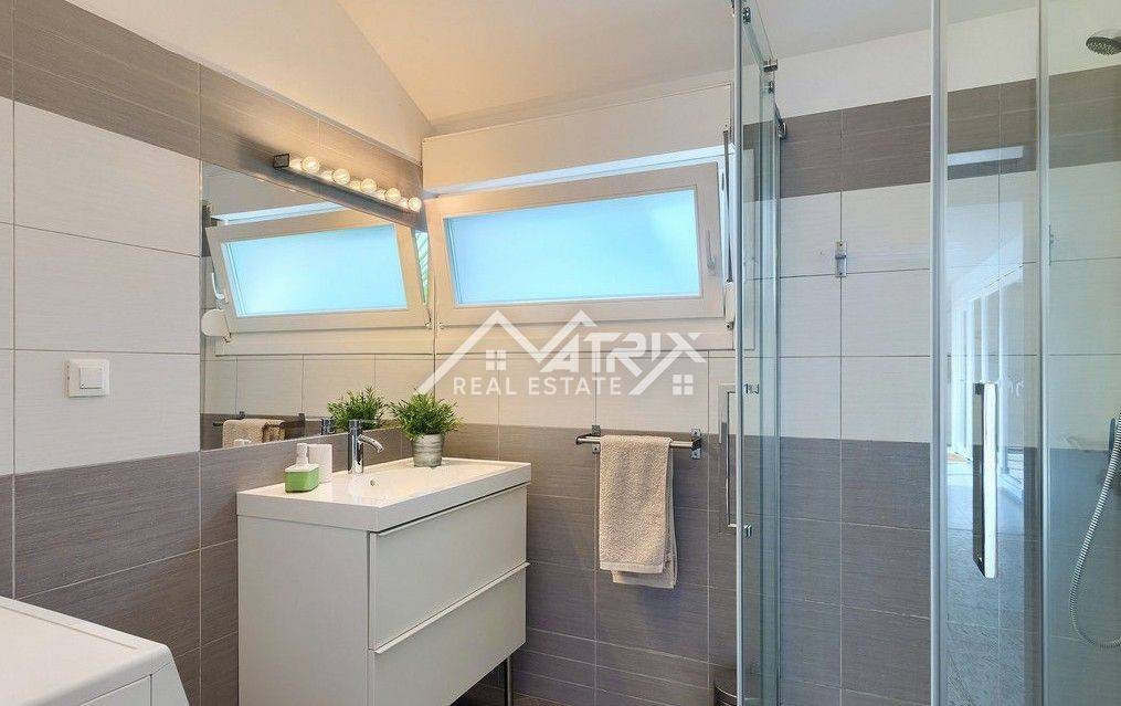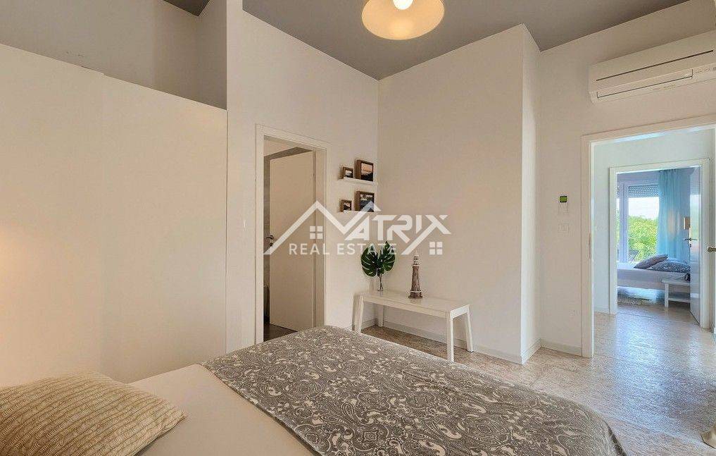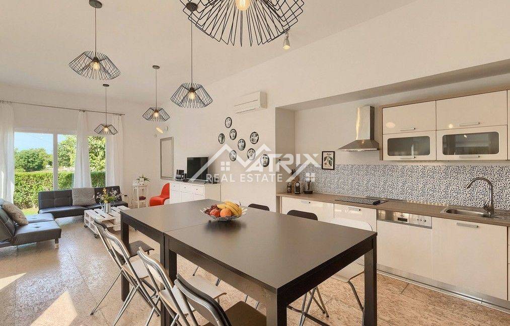 Modern single-storey house of 147 m² in the peaceful surroundings of Poreč, just approx. 5 km from the town and well-kept beaches, offering a smart layout and comfortable step-free living. The open-plan living area—kitchen, dining and lounge—flows seamlessly, while the sleeping quarters are discreetly separated and comprise three bedrooms, with the principal bedroom featuring an en-suite bathroom. A distinctive glass corridor designed as sliding glass walls can be fully opened in summer to connect both sides of the plot, bringing in abundant natural light and a sense of airiness. In front of the house are a spacious sun deck and a pool for relaxing in the warmer months, while at the heart of the layout sits a practical summer kitchen—ideal for laid-back gatherings and outdoor dining. Functional, bright and comfortable, the house is equipped with air-conditioning units and radiators, and thanks to its proximity to town and amenities it also represents a very good investment for tourist rental.