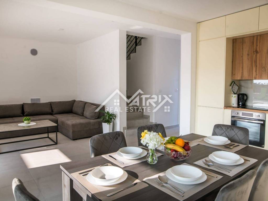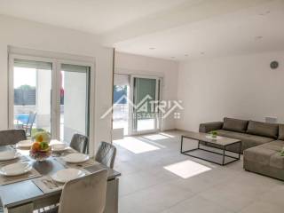 The central part of the ground floor is a spacious living room with kitchen and dining room, guest toilet, storage room, and a terrace leading to the swimming pool sunbathing area. On the first floor there are three bedrooms, two of which have access to a terrace with a stunning sea view, and two modern bathrooms. The second floor hides a real oasis - a spacious roof terrace of 41 m2, an ideal place for a jacuzzi and enjoying panoramic sunsets.