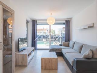 The apartment covers 75 m² and features a practical layout. Upon entering the hallway, the first bedroom is on the left, while the spacious living room is on the right. The bathroom is conveniently located next to the corridor. The living room is semi-separated from the kitchen and dining area by a partial partition wall, and both spaces have direct access to the front side of the building, where a heated swimming pool with a sun deck awaits. The second bedroom is located next to the kitchen, and both bedrooms have access to the back patio, which is partially covered and paved—ideal for morning coffee or evening relaxation.