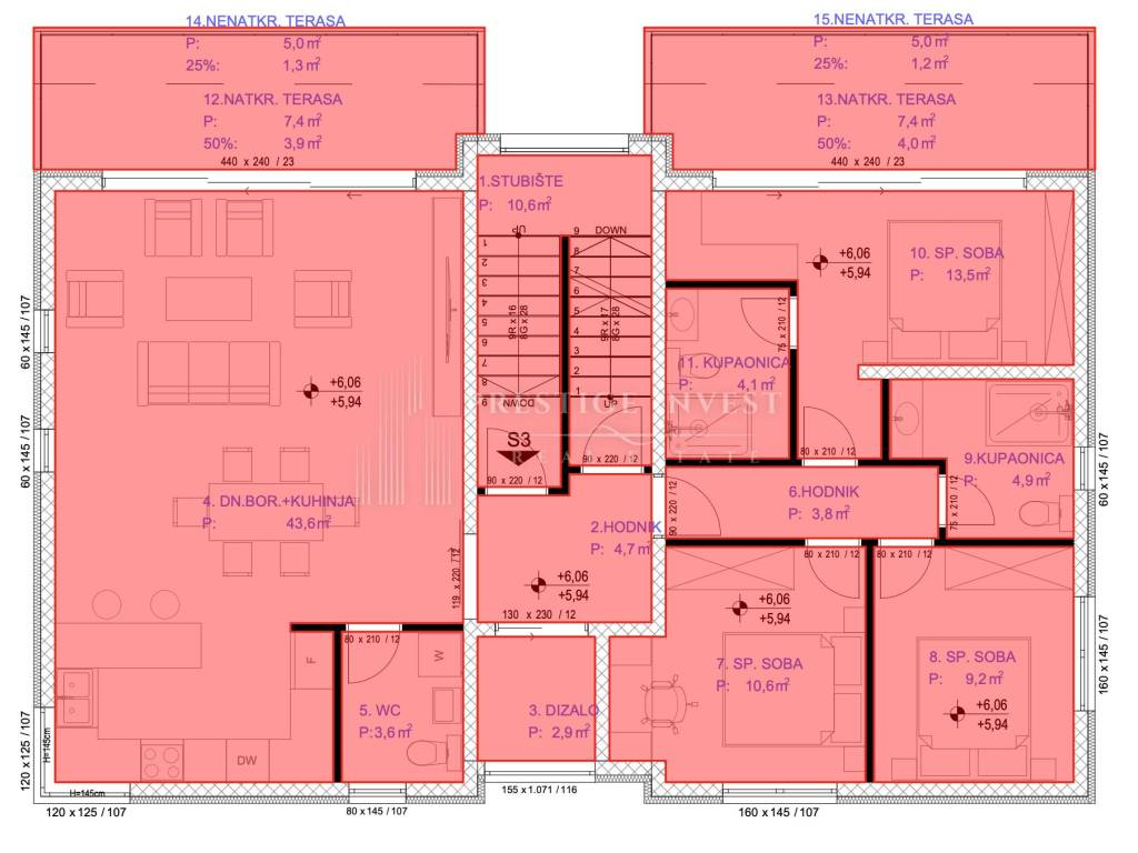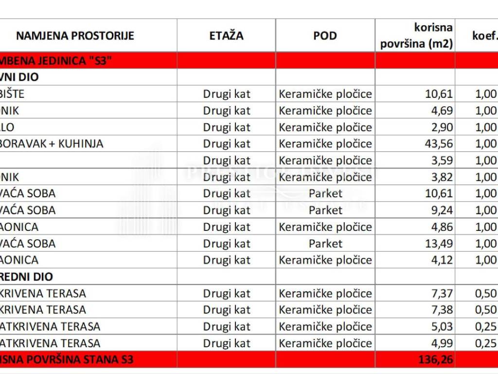 The apartment is located on the second floor, next to the roof terrace and has its own elevator that leads all the way to the roof terrace. The apartment consists of three bedrooms, two bathrooms, a toilet, two terraces, each with an area of 12.4m2.