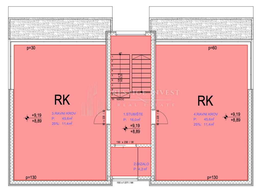 Roof terrace: 91.2m2 * 0.25 = 22.8m2 Elevator on the roof terrace: 16m2 Staircase to the roof terrace: 4.2m2