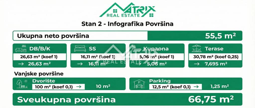 The layout includes an open-concept living room with kitchen and dining area (26.63 m²), one bedroom (16.11 m²), and a bathroom (5.06 m²). The net interior area is 55.5 m², while the total calculated area including the terrace, garden and parking reaches 66.75 m².