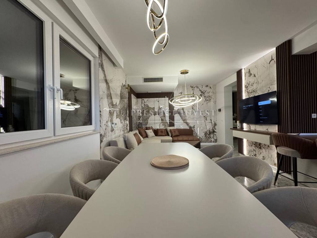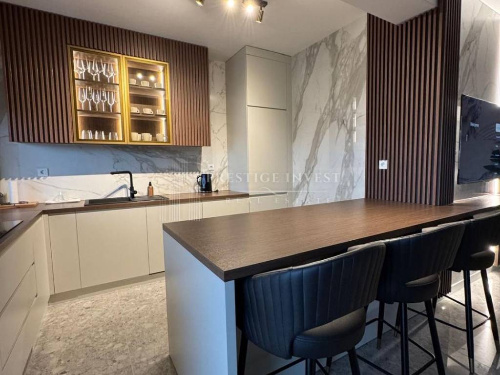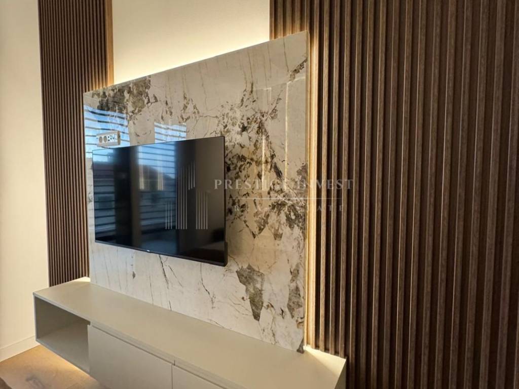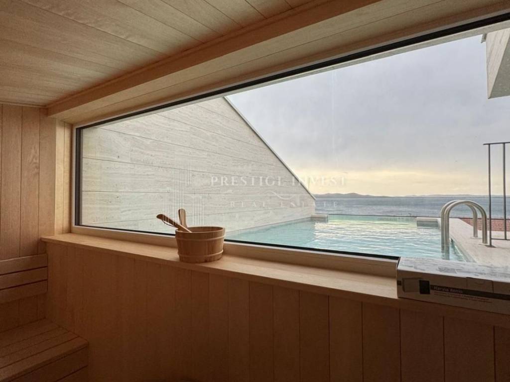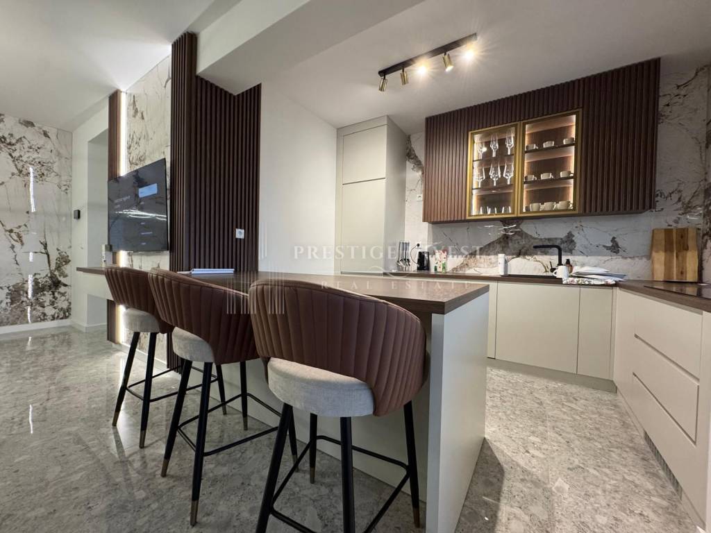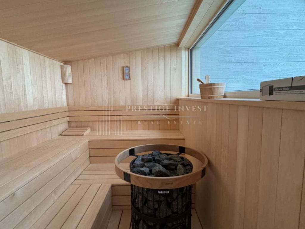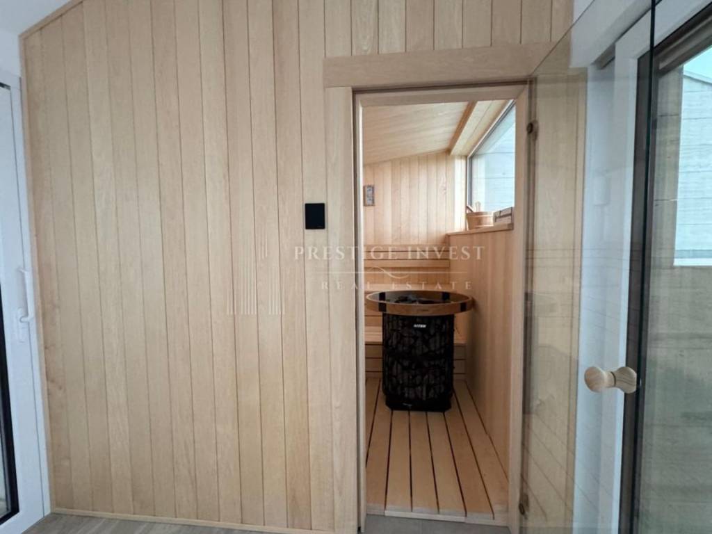 1. The penthouse is two-storey - 120.98 m2 - has a roof terrace with a sundeck and sauna - additional toilet, heated roof pool of 19m2, preparation for an outdoor kitchen, storage in the basement and two outdoor parking spaces.