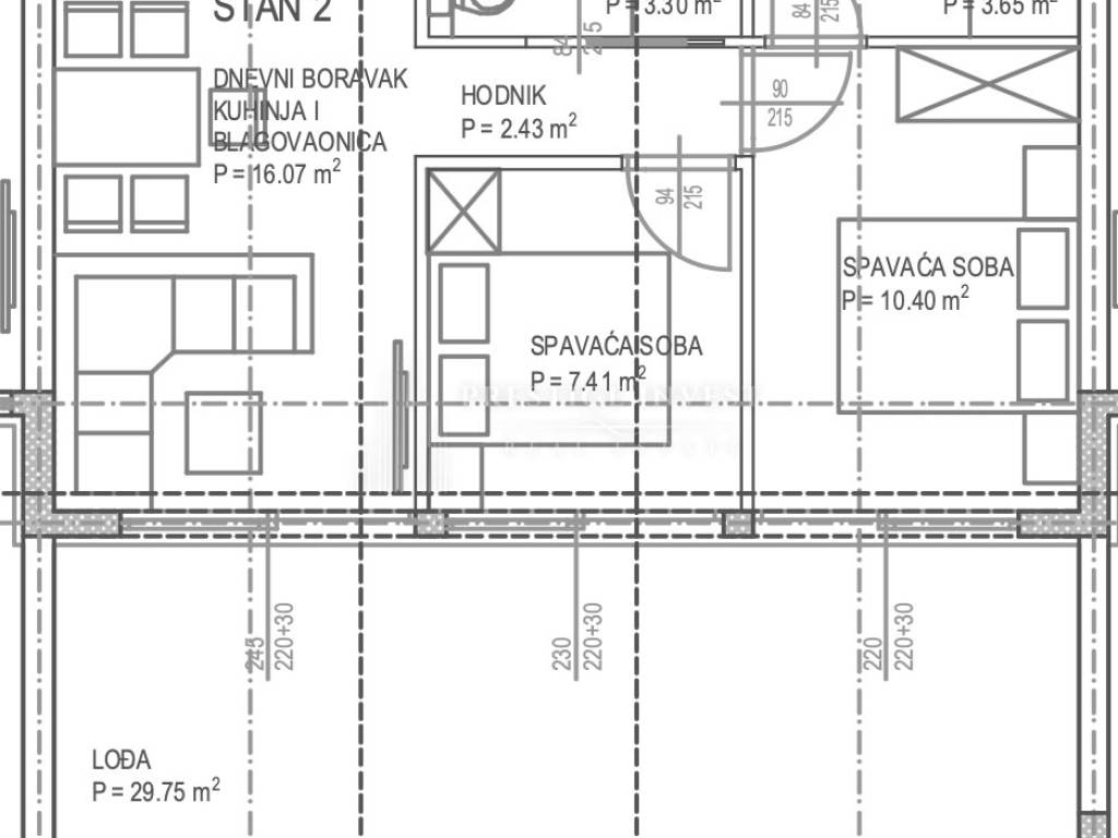 Living room, kitchen and dining room – 16.07 m² Bedroom 1 – 7.41 m² Bedroom 2 – 10.40 m² Bathroom 1 – 3.30 m² Bathroom 2 – 3.65 m² Hallway – 2.43 m² Loggia – 29.75 m² Uncovered terrace – 5.10 m²