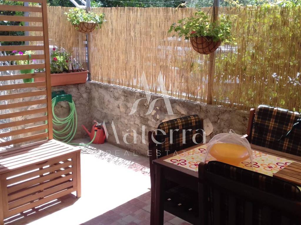 The living area of approx. 71 m² is spread over two floors connected by an external staircase, with a landscaped plot of approx. 100 m².