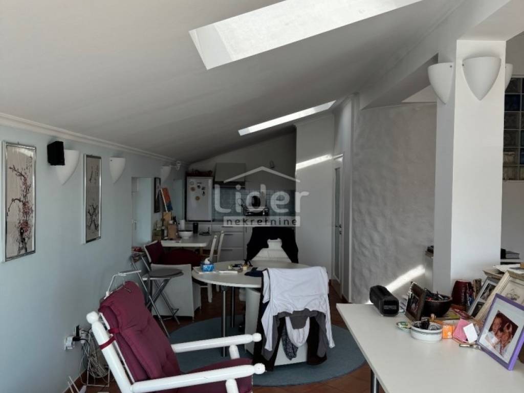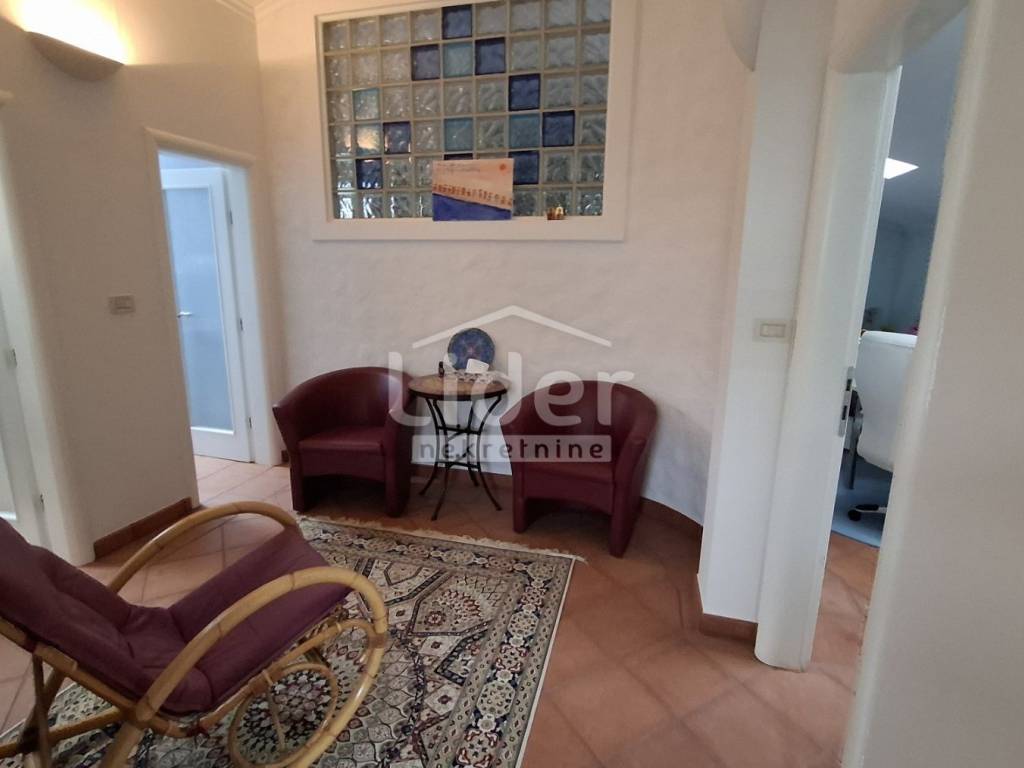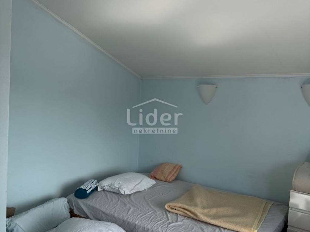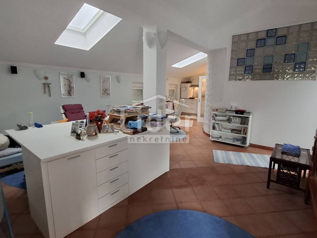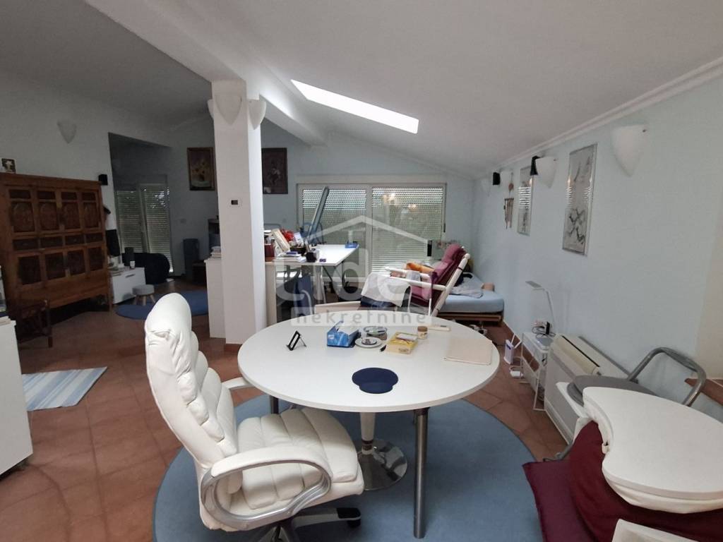 We are selling the floor of a family house built in 2009. Total area of 109 m2 + 16 m2 terrace with awning and view of Učka. Three bedrooms and 50 m2 living room, underfloor heating, terracotta and African coffin floor, sauna, double toilets, woodshed, pantry. Air conditioning with two units, alarm system and remote control of heating and water heater.