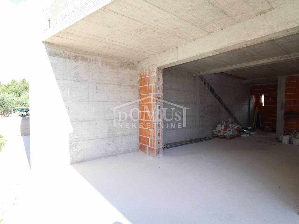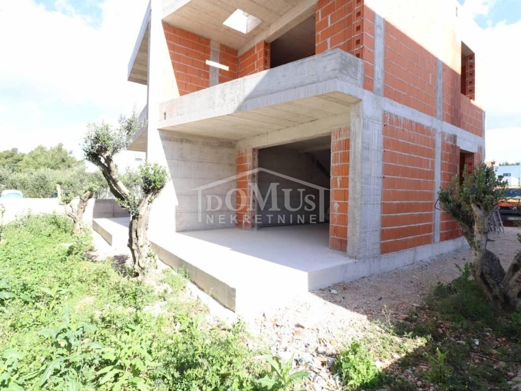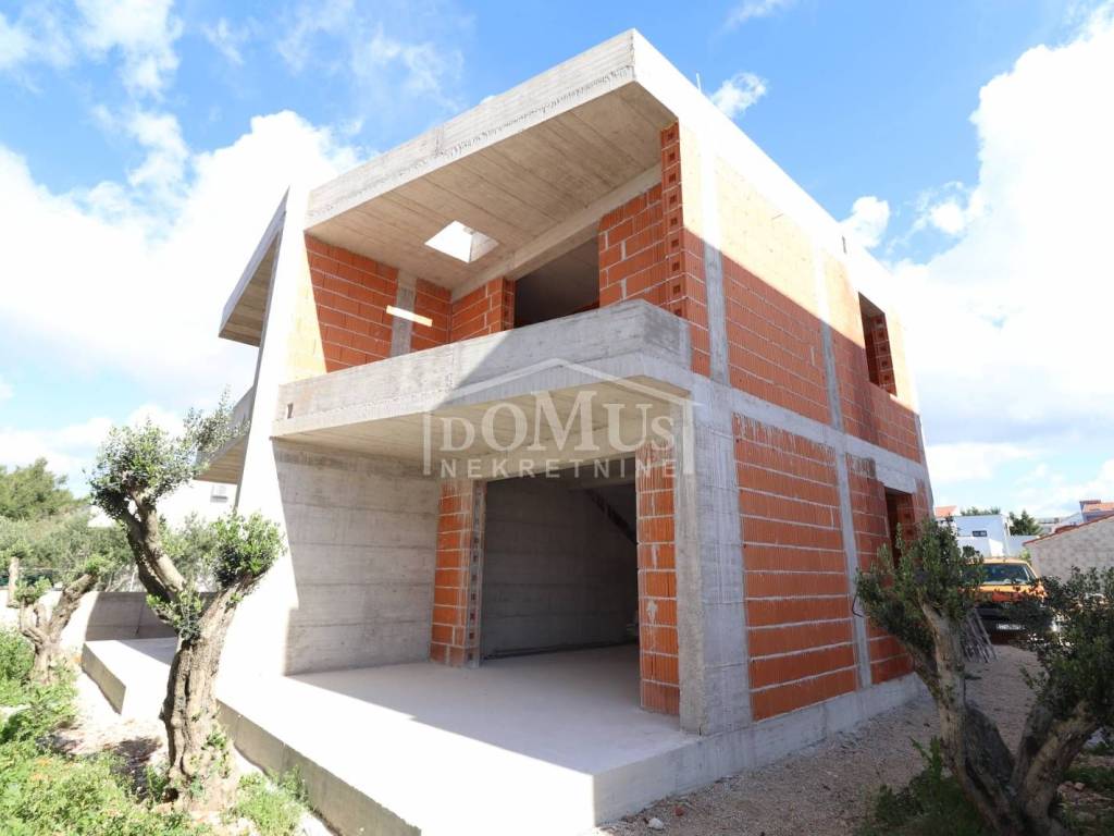 New construction, a beautiful family house with modern architecture and excellent layout. The house is a semi-detached house (ground floor + 1st floor) with 93.92 m2 of total usable area with a beautiful garden of approx. 120 m2, covered terrace and parking space for 2 cars. The ground floor consists of a covered entrance, a staircase, a storage room, a bathroom, a large living room with a kitchen and a dining room with access to a covered terrace and garden. Internal stairs lead to the 1st floor, where there is a hallway, three bedrooms, one of which has a covered terrace and a separate bathroom. The house is equipped with burglar-proof doors, PVC carpentry with electric shutter lifters, high-quality ceramic floor covering, heat pump with underfloor water heating installation throughout the house, air conditioning in the living room and in all bedrooms, telephone and Internet installations, satellite TV. The house is 650m from the Hangar beach and 850m from the town center. Completion of the works is expected by the end of 2025.