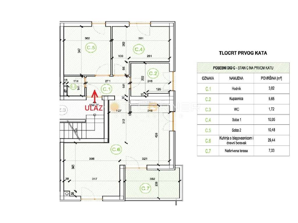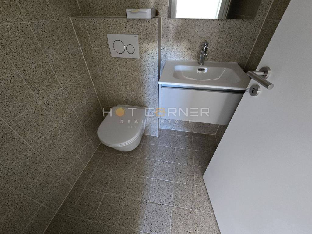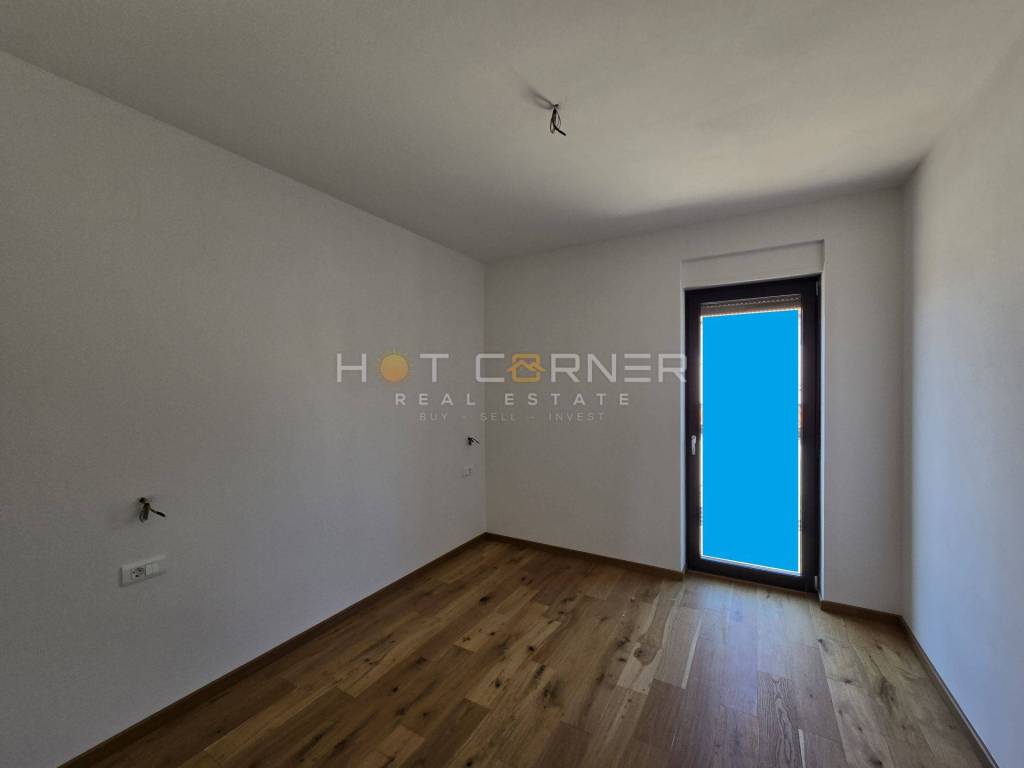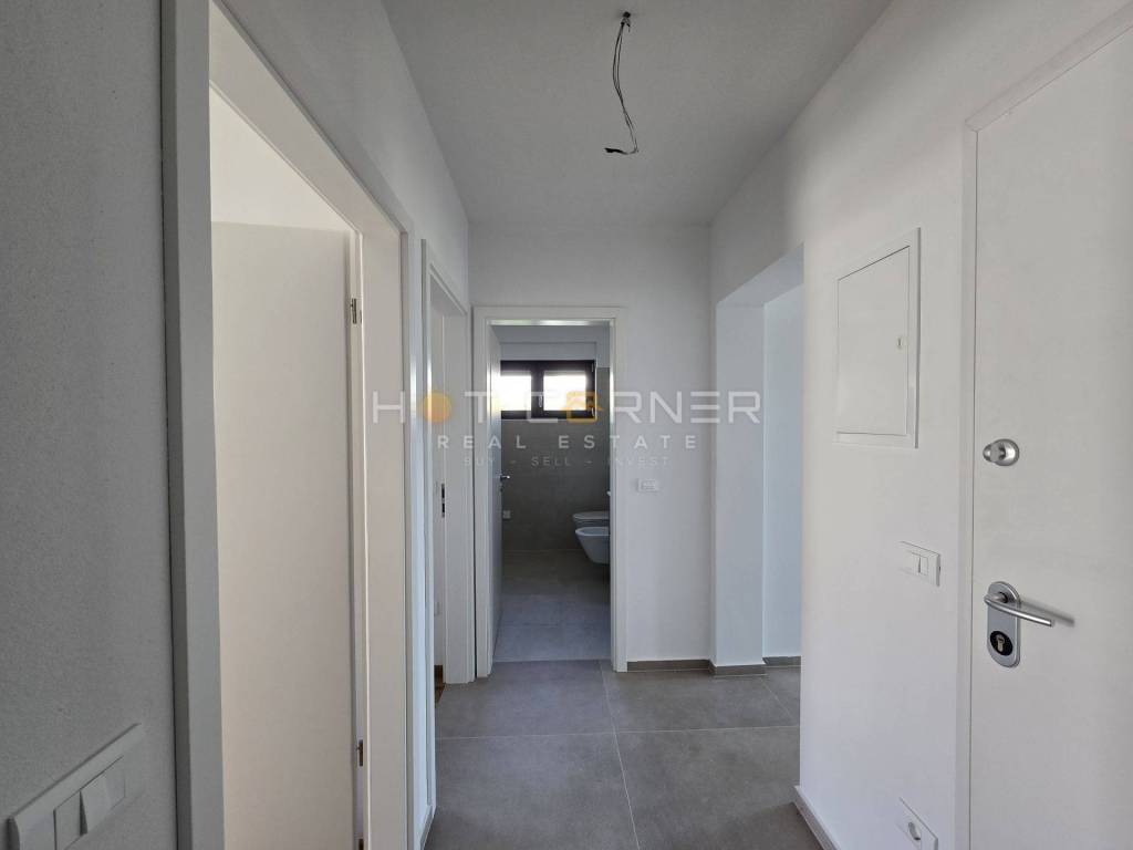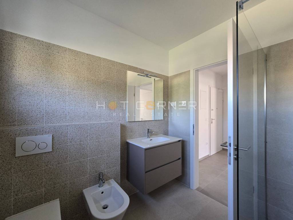 The apartment itself is 65 m2 in size, and consists of an entrance hall, 2 bedrooms, bathroom, guest toilet, and an "open space" area with a living room with kitchen and access to a terrace overlooking the sea.