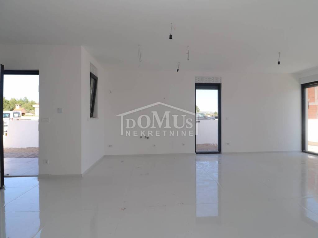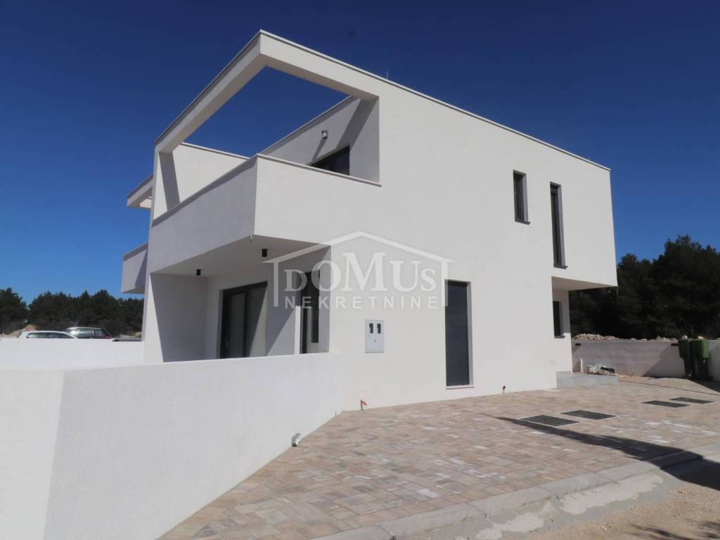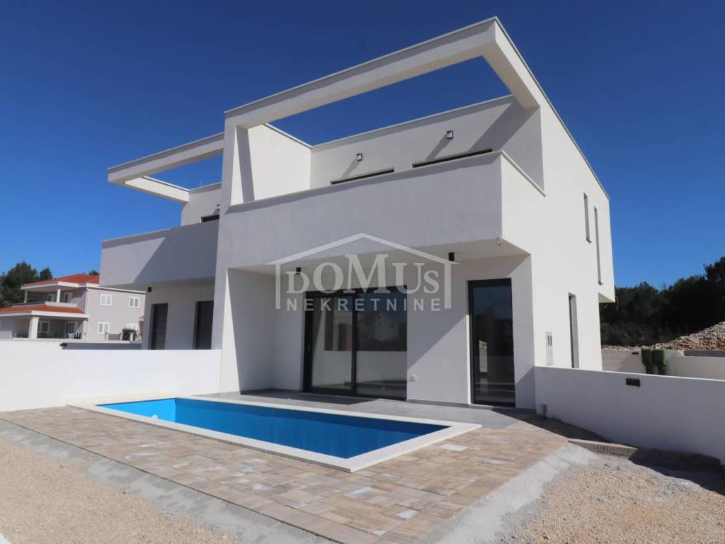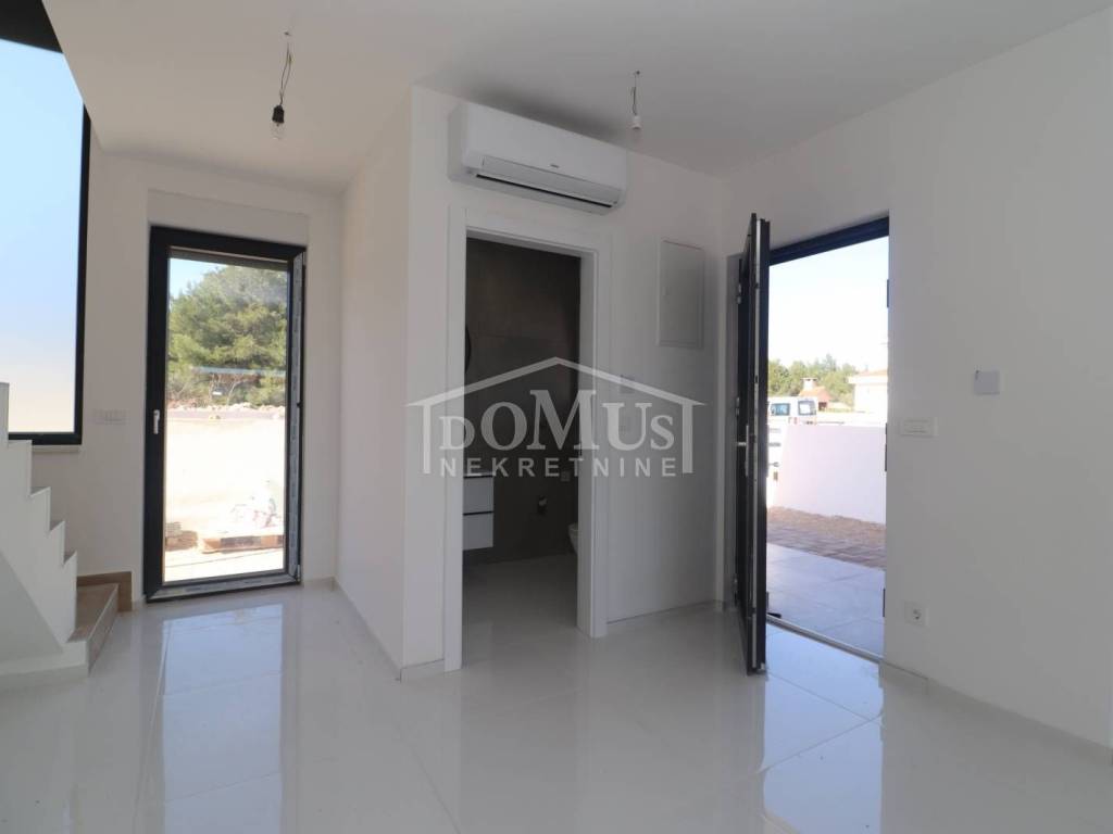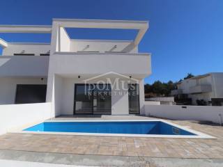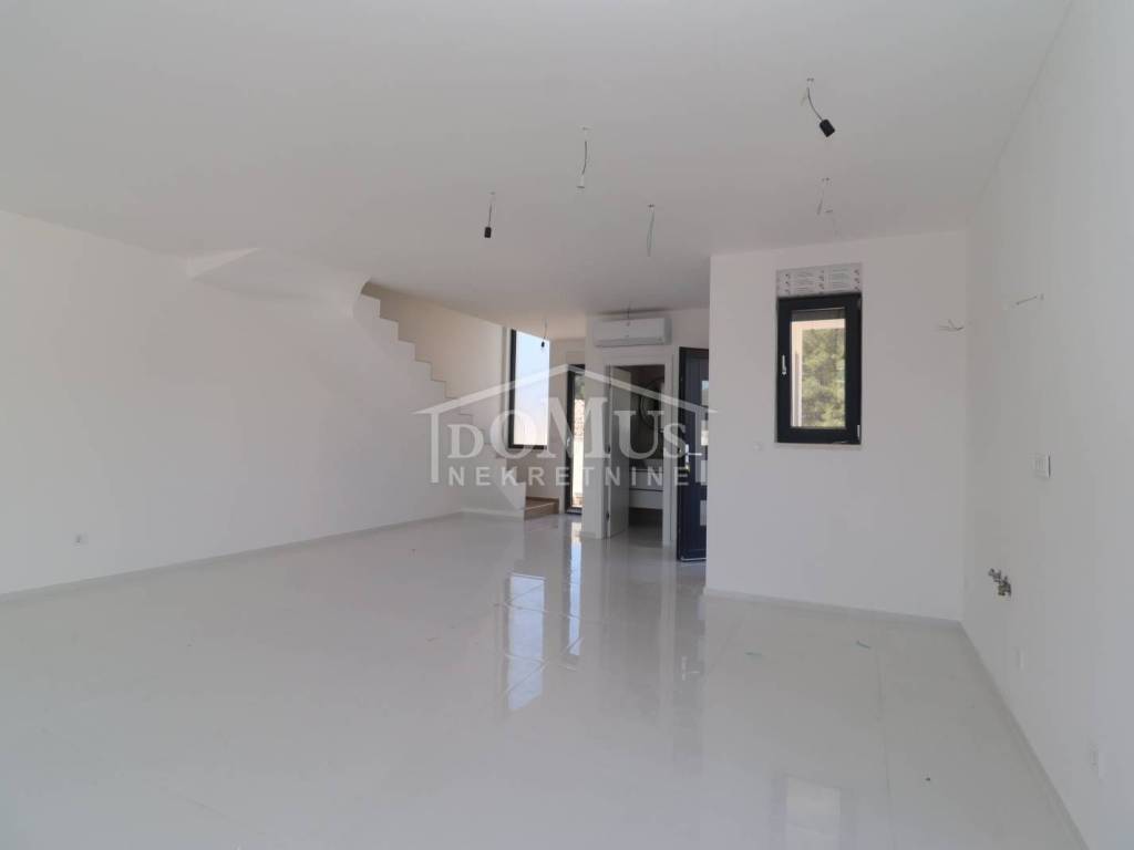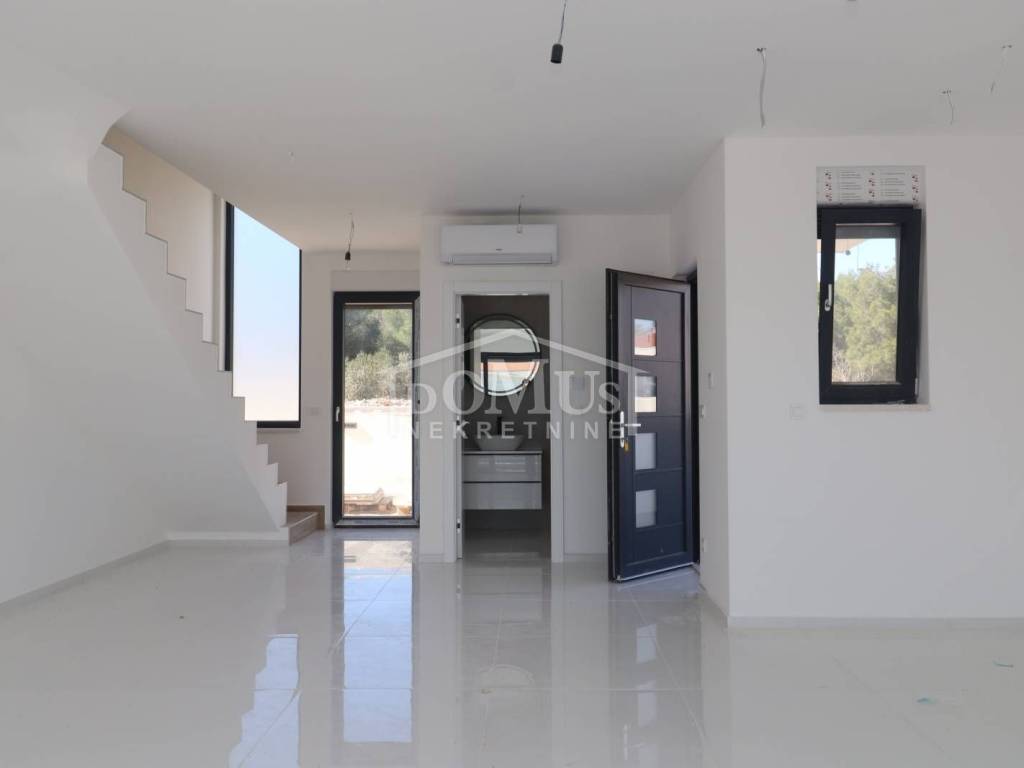 Family house in Srima, 550m from the pebble beach and the town center. The house is a two-story building, on two floors Ground floor + 1st floor with 117.57m2 of total usable area and 50m2 garden with a large terrace and a 12m2 pool. The ground floor of the house consists of a covered entrance, a guest toilet, a hallway, a large living room with a kitchen and a dining room with access to a covered terrace with a swimming pool and an adjoining yard. On the first floor of the house there are three bedrooms, two bathrooms, a hallway, a wardrobe and a large terrace of 14.89m2. The terrace is covered with a pergola. The house will be equipped with burglar-proof doors, ALU carpentry with electrically operated blinds, underfloor heating in the living room and bathrooms, each room with air conditioning, a 200l hot water boiler, video surveillance installations. The environment will be decorated with Mediterranean plants. Paved parking area.