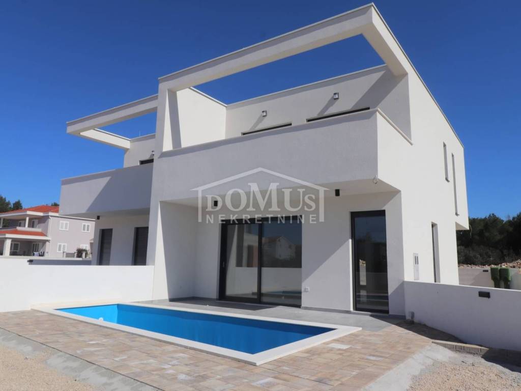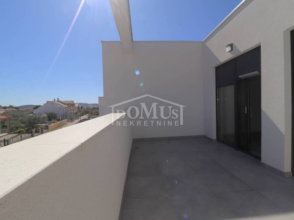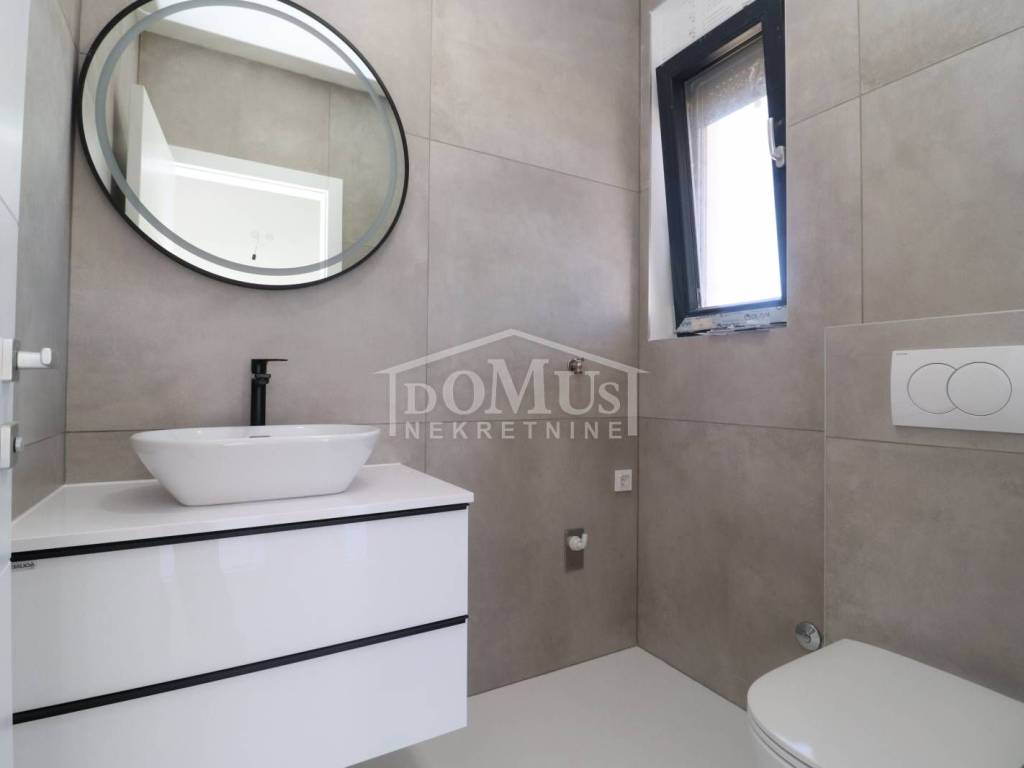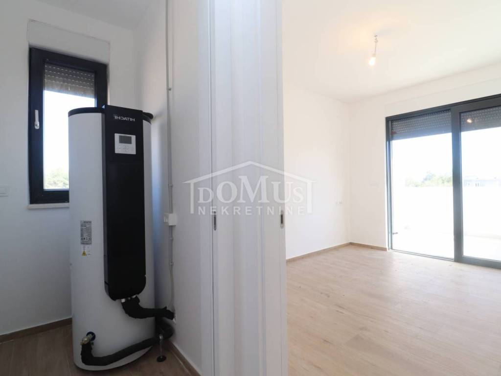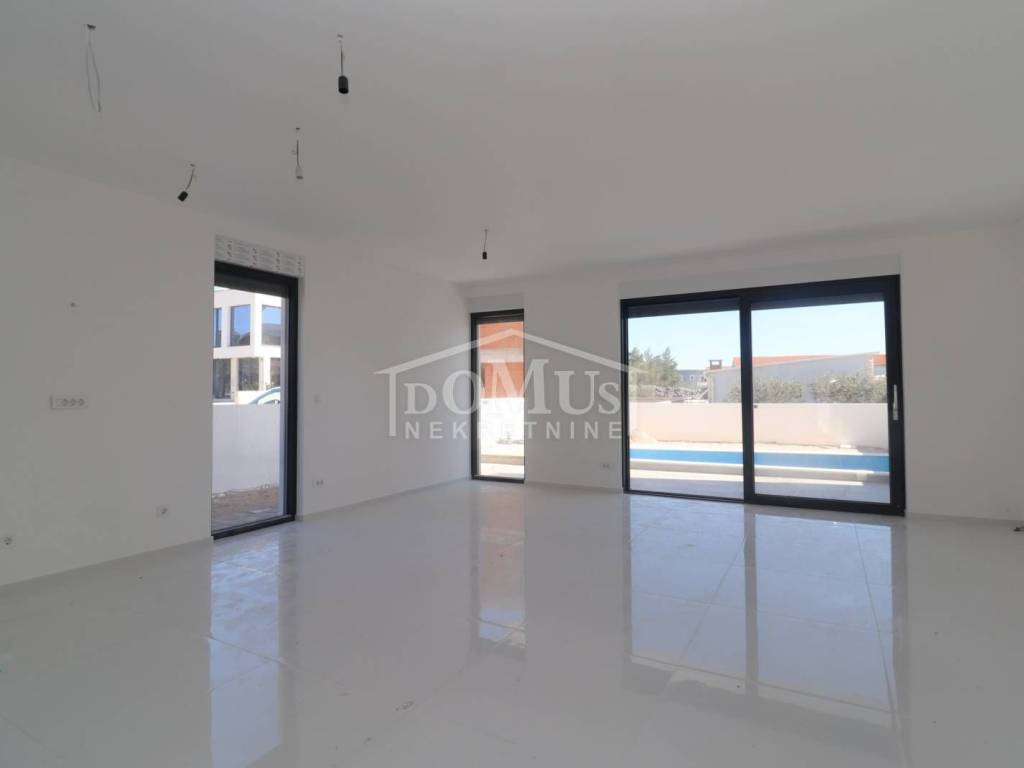 Family house in Srima, 550m from the pebble beach and the town center. The house is a two-story building, on two floors Ground floor + 1st floor with 117.57m2 of total usable area and 50m2 garden with a large terrace and a 12m2 pool. The ground floor of the house consists of a covered entrance, a guest toilet, a hallway, a large living room with a kitchen and a dining room with access to a covered terrace with a swimming pool and an adjoining yard. On the first floor of the house there are three bedrooms, two bathrooms, a hallway, a wardrobe and a large terrace of 14.89m2. The terrace is covered with a pergola. The house will be equipped with burglar-proof doors, ALU carpentry with electrically operated blinds, underfloor heating in the living room and bathrooms, each room with air conditioning, a 200l hot water boiler, video surveillance installations. The environment will be decorated with Mediterranean plants. Paved parking area.