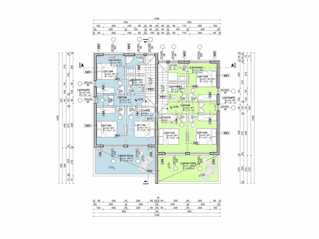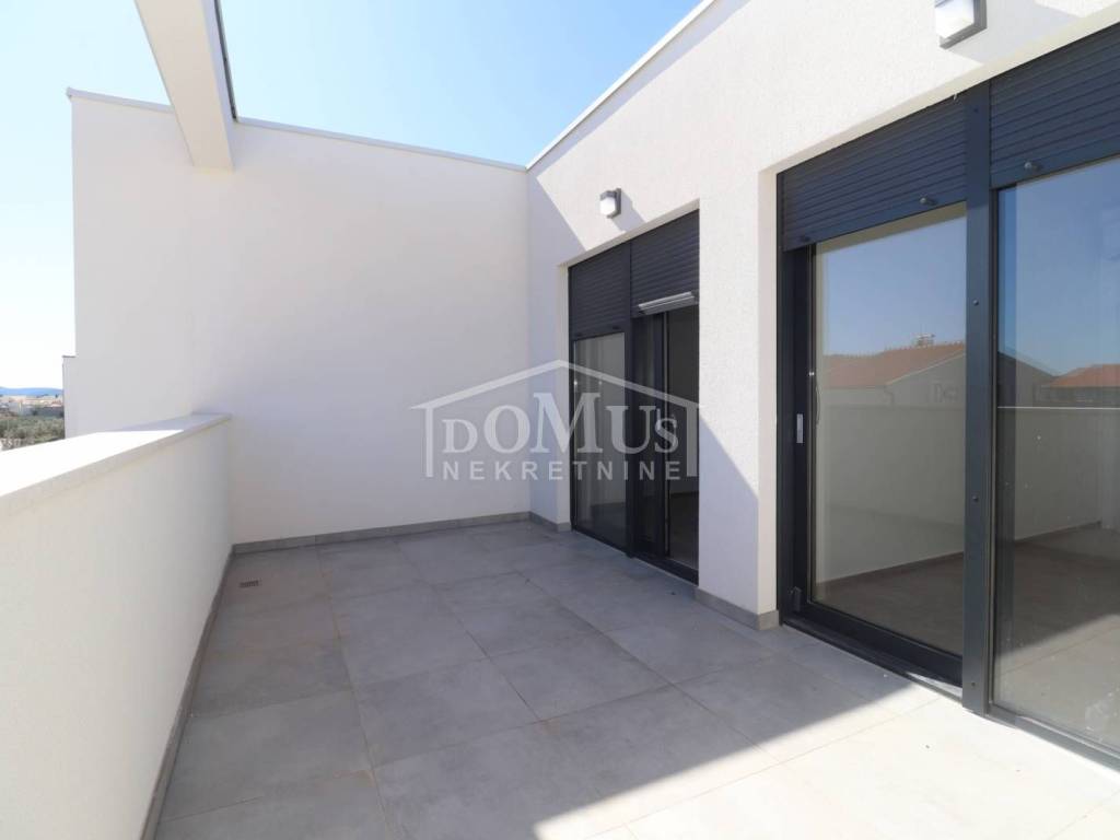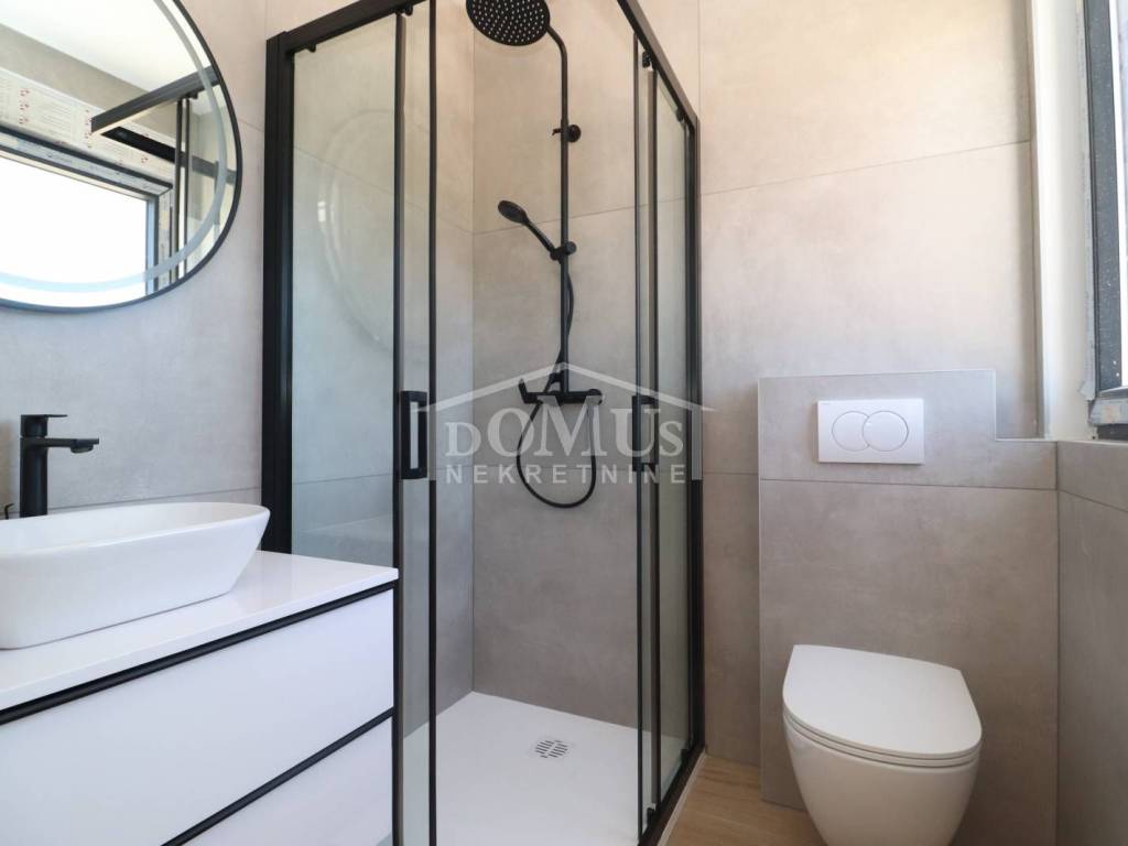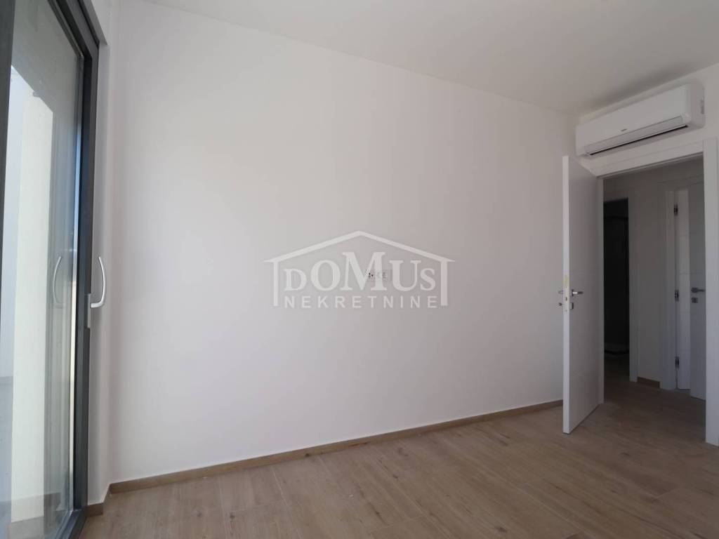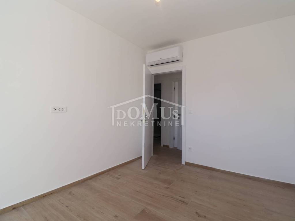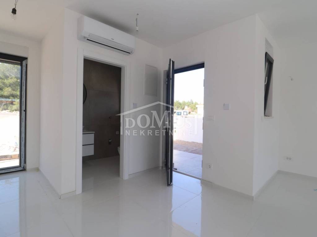 Family house in Srima, 550m from the pebble beach and the town center. The house is a two-story building, on two floors Ground floor + 1st floor with 117.57m2 of total usable area and 50m2 garden with a large terrace and a 12m2 pool. The ground floor of the house consists of a covered entrance, a guest toilet, a hallway, a large living room with a kitchen and a dining room with access to a covered terrace with a swimming pool and an adjoining yard. On the first floor of the house there are three bedrooms, two bathrooms, a hallway, a wardrobe and a large terrace of 14.89m2. The terrace is covered with a pergola. The house will be equipped with burglar-proof doors, ALU carpentry with electrically operated blinds, underfloor heating in the living room and bathrooms, each room with air conditioning, a 200l hot water boiler, video surveillance installations. The environment will be decorated with Mediterranean plants. Paved parking area.