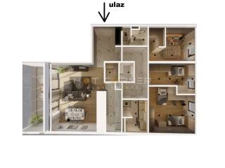 The apartment has a total area of 130 m² and consists of 3 bedrooms, 2 bathrooms, 1 WC, 2 hallways, storage room, a spacious open-plan area with kitchen, dining room and living room, and a large loggia. The apartment also includes a storage room of approx. 15 m² located next to the parking space.