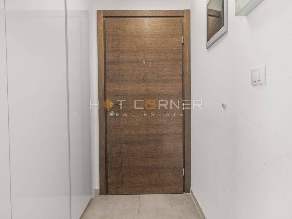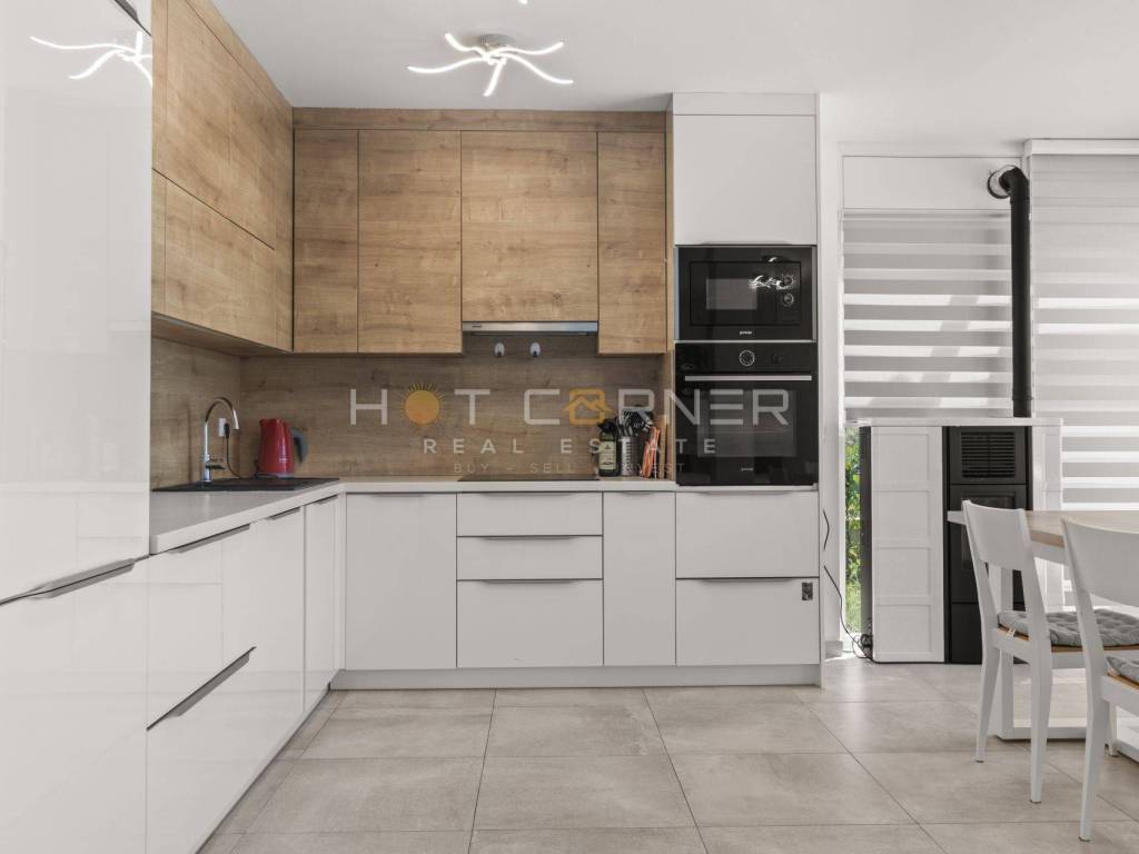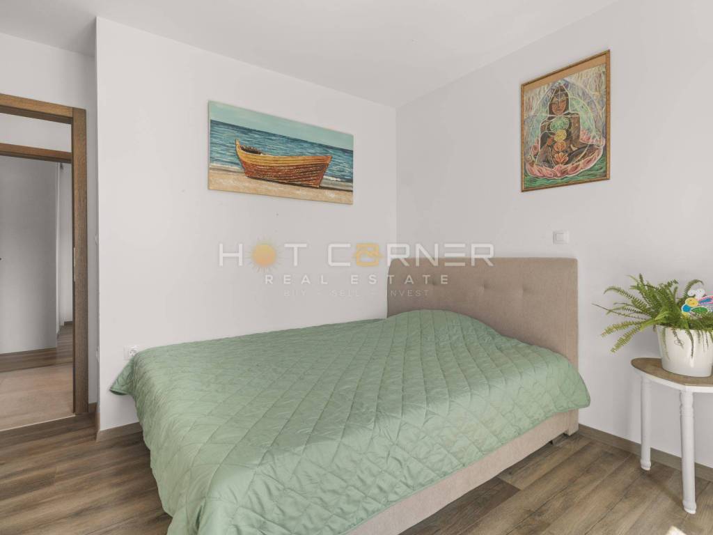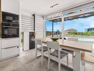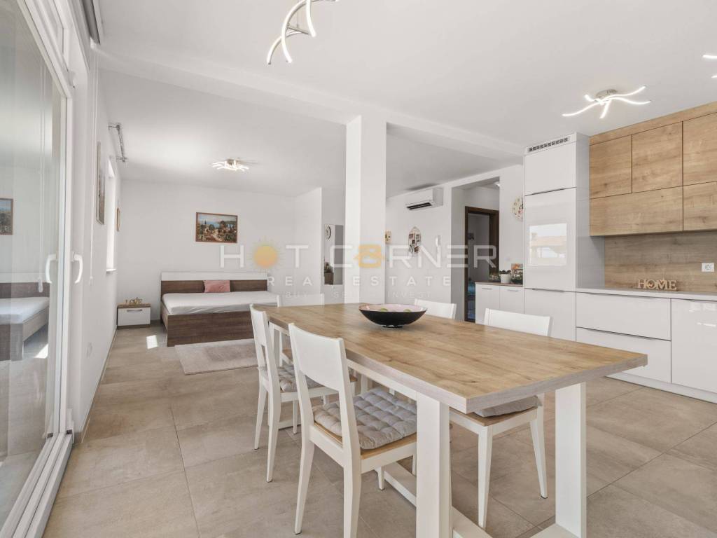 The apartment consists of a very spacious living room with a new, fully equipped custom-made modern kitchen. From the living room, large panoramic sliding doors lead to the terrace by the pool.