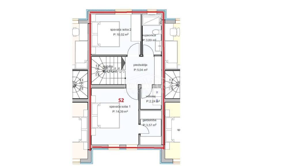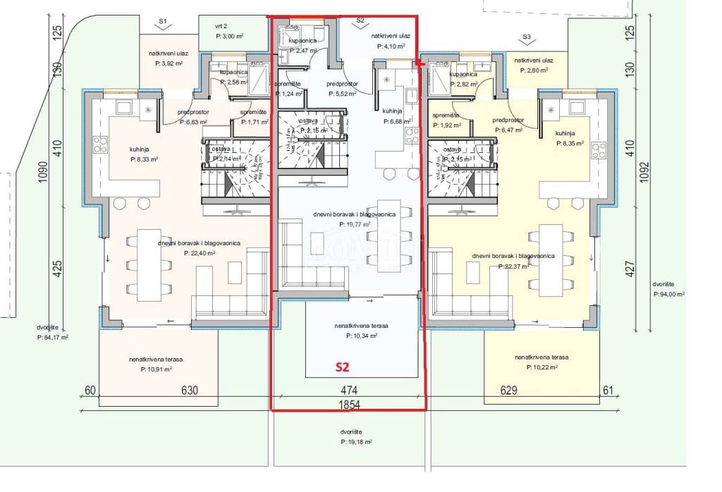 House S2 is part of a triplex building, spread over two floors (ground floor + first floor), with a total usable area of 90.77 m², a garden of 19.18 m², and one parking space.