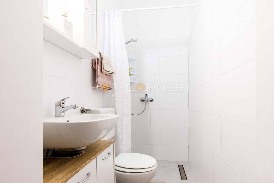 The apartment has a total surface area of 45.48 m² and consists of an entrance hallway, living room, kitchen, bathroom, and one bedroom. An additional advantage is a separate room belonging to the apartment, used as a laundry and drying room, which is particularly convenient for tourist rental purposes. The apartment also includes two basement storage rooms.