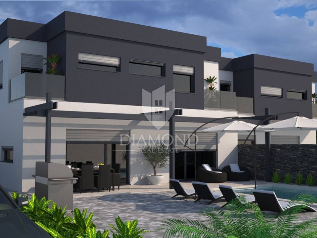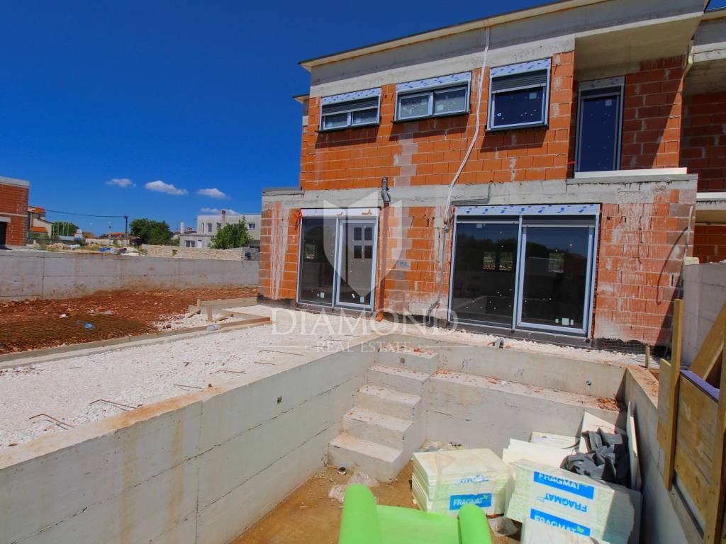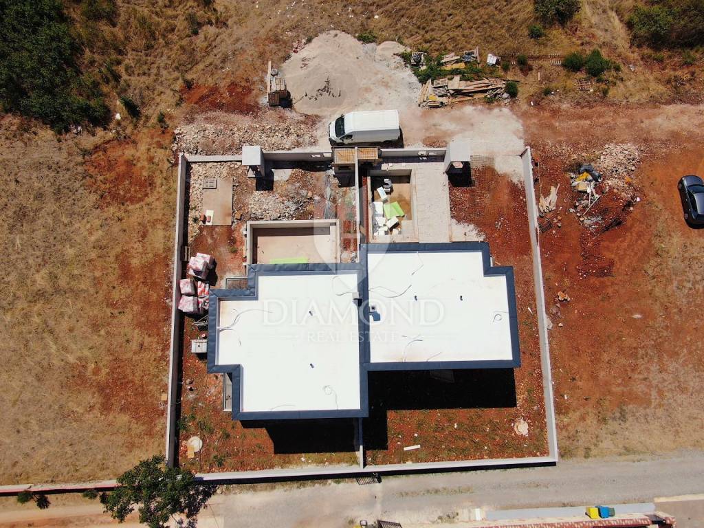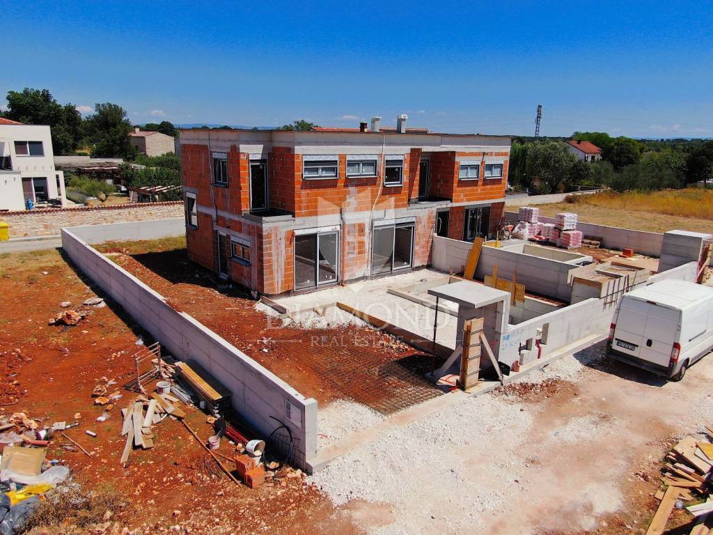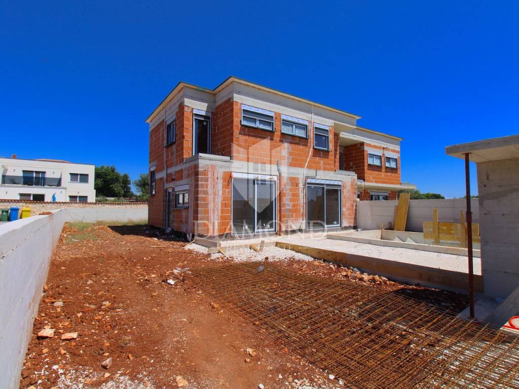 In the vicinity of Ližnjan, we are selling a modern duplex house under construction. The house is a two-story building with a total area of 145 m2 and consists on the ground floor of a kitchen and dining room with access to the pool beach, a living room, two bedrooms and a bathroom. Upstairs there is another bedroom with its own bathroom and balcony, and two bedrooms with a shared bathroom and access to the balcony. Air conditioners will be installed in every room, and electric underfloor heating is installed throughout the house. The property is currently under construction and is being sold completely finished with furniture, a finished pool and a landscaped garden. The planned completion of the property is May 2023. The yard is completely fenced with an automatic gate at the entrance, and it covers 360 m2. There is a parking lot, beautiful green areas, and an arranged sunbathing area and a 24 m2 swimming pool. The location is also excellent, only 3 km to the first beach and the sea, and within walking distance to shops, restaurants and cafes. It is surrounded by holiday homes in the newly built part of the village. Medulin is 5 kilometers away and the city of Pula is 8 kilometers away. The property is ideal for tourist rental needs, close to all essential facilities, but also as your own holiday home on the sea.