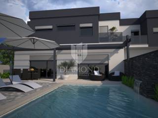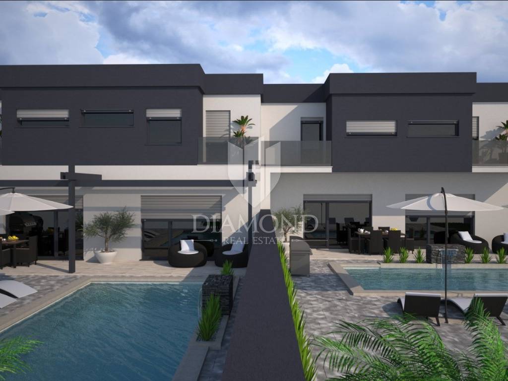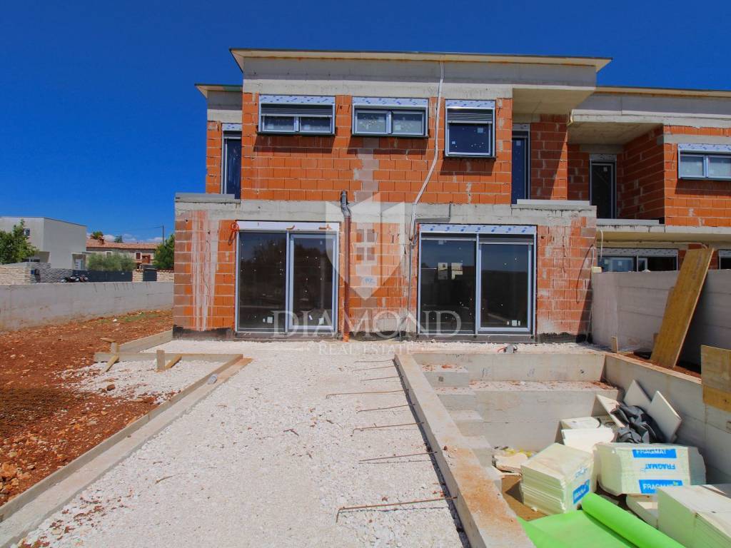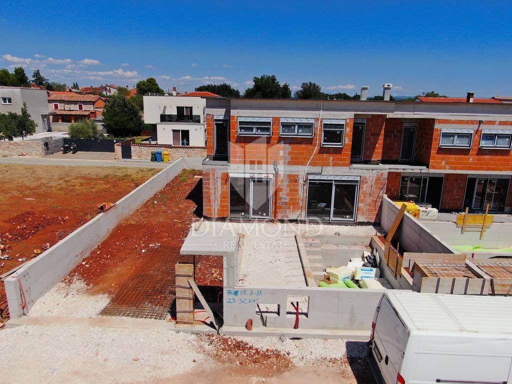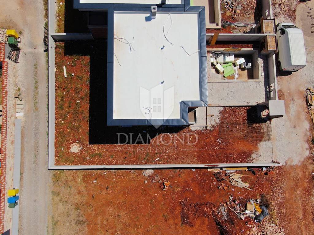 In the vicinity of Ližnjan, we are selling a modern duplex house under construction. The house is a two-story building with a total area of 145 m2 and consists on the ground floor of a kitchen and dining room with access to the pool beach, a living room, two bedrooms and a bathroom. Upstairs there is another bedroom with its own bathroom and balcony, and two bedrooms with a shared bathroom and access to the balcony. Air conditioners will be installed in every room, and electric underfloor heating is installed throughout the house. The property is currently under construction and is being sold completely finished with furniture, a finished pool and a landscaped garden. The planned completion of the property is May 2023. The yard is completely fenced with an automatic gate at the entrance, and it covers 360 m2. There is a parking lot, beautiful green areas, and an arranged sunbathing area and a 24 m2 swimming pool. The location is also excellent, only 3 km to the first beach and the sea, and within walking distance to shops, restaurants and cafes. It is surrounded by holiday homes in the newly built part of the village. Medulin is 5 kilometers away and the city of Pula is 8 kilometers away. The property is ideal for tourist rental needs, close to all essential facilities, but also as your own holiday home on the sea.