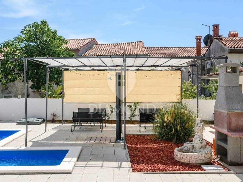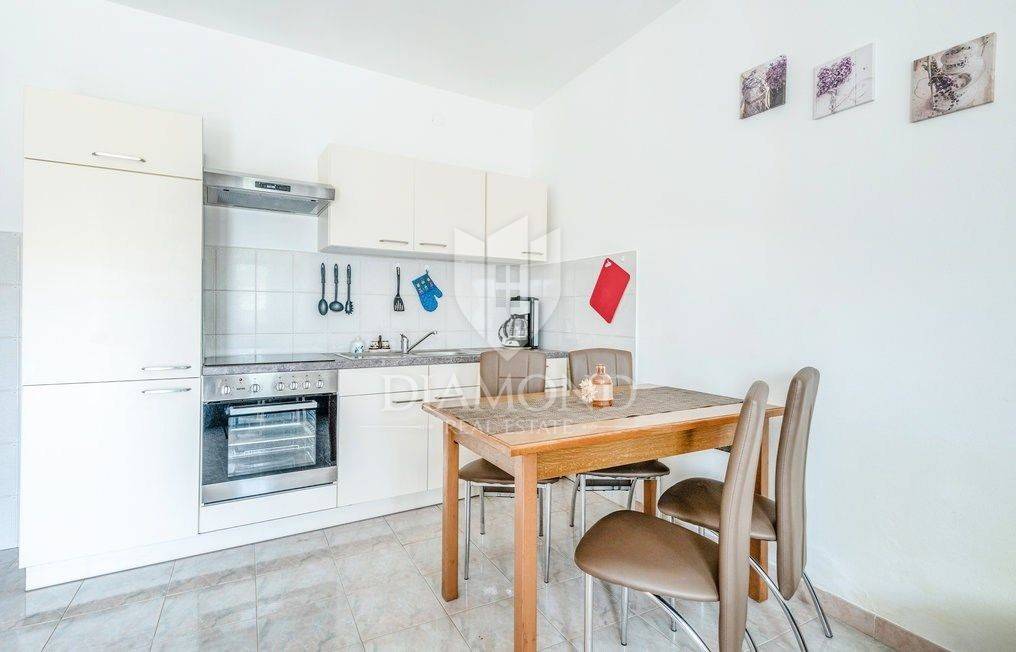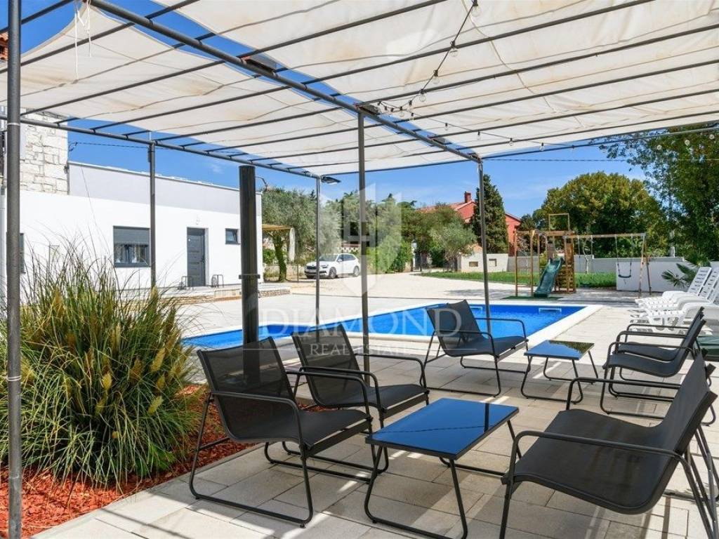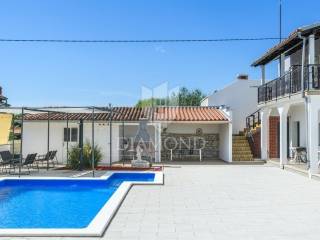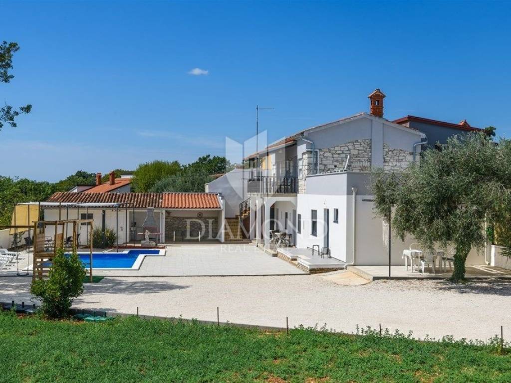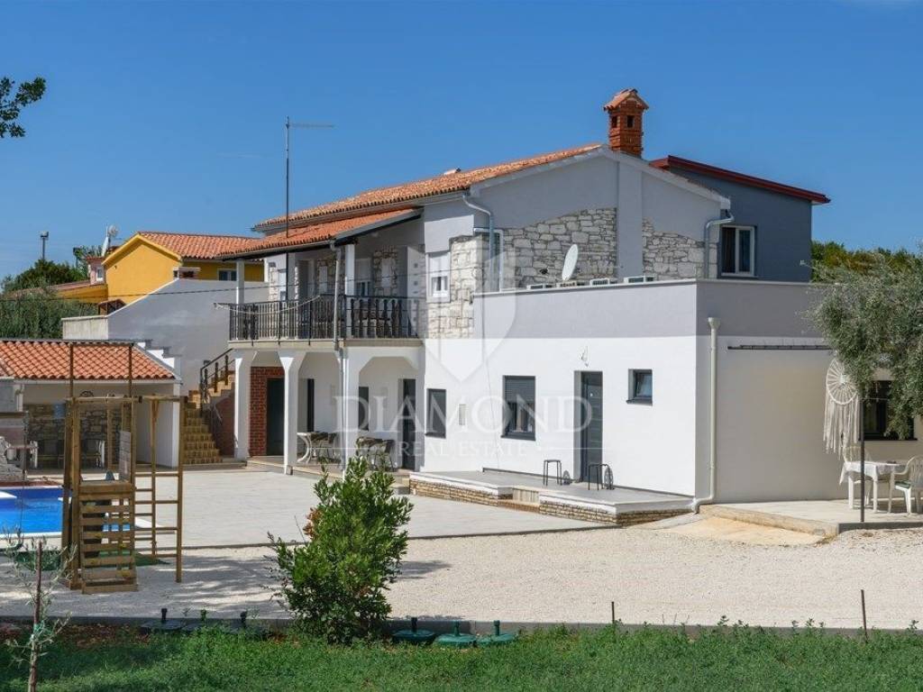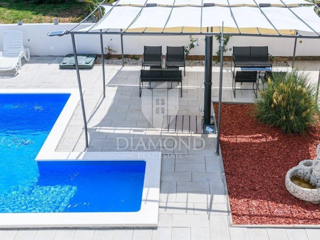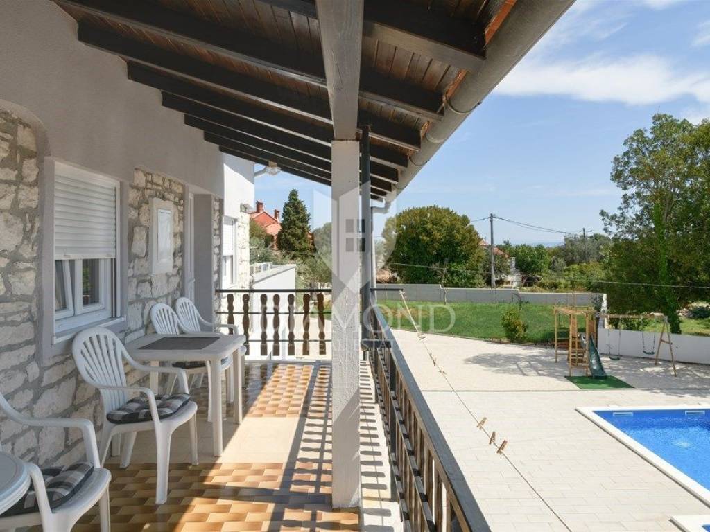We are selling a newly renovated vacation home with a swimming pool in a quiet location, in the immediate vicinity of Duga Uvala, only 2.2 kilometers from beautiful beaches and the clean Adriatic Sea. This traditional holiday house with a beautiful swimming pool is located on a spacious garden of 1066 m2. The house has a special concept, with four separate studio apartments and the main part includes a total of 256 m2 of living space. On the first floor there is one studio apartment with a bedroom, bathroom, kitchen and living room and one en suite bedroom with a separate entrance. The ground floor includes two separate studio apartments of a similar concept. Each apartment has one bedroom, bathroom and kitchen. The main part in the additional, upgraded part of the house includes a pleasant living room with a fireplace, a kitchen and a dining room, as well as one bedroom and one bathroom. Each bedroom has air conditioning and satellite TV. The spacious garden ensures perfect privacy and peace. There is parking for 4-5 cars, beautiful green areas, covered terraces and lounge areas, a small children's playground and a beautiful swimming pool of 32 m2. There is also an auxiliary building, which includes an additional storage space and an outdoor toilet. Below is a covered area with a large dining table where a summer kitchen is also planned. The property is certainly worthy of attention as a tourist property in a beautiful location with a lot of capacity. Location-wise, it is perfectly located, only 2.2 km from the first organized beach and attractive tourist location, Duga Uvala, yet in a beautiful and peaceful location away from the summer crowds and noise. The first store is within walking distance, and restaurants and cafes are within 1.5 kilometers. The airport is 15 kilometers away.