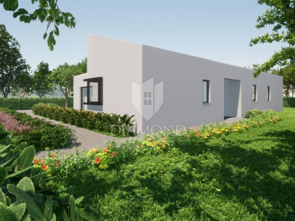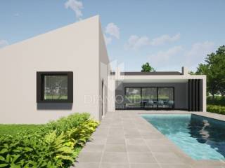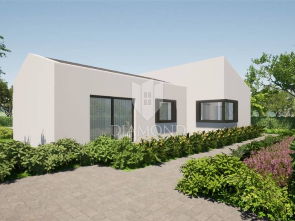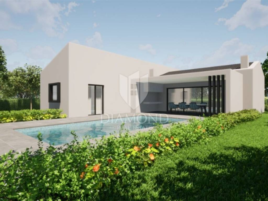 In a beautiful location with an open view of the beautiful Učka mountain, this beautiful one-story house under construction is located. This beautifully designed house has a total area of 120.10 m2 and consists of two bedrooms with their own bathrooms and an open living area that combines the kitchen, dining room and living room with access to a covered terrace where there is a summer kitchen and a dining area with a view of swimming pool and garden. There is also a technical room and a guest toilet. The living room and bedrooms are air-conditioned, while the bathrooms have electric underfloor heating.