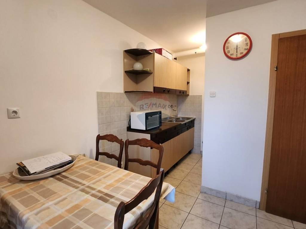 The apartment on the first floor has a separate entrance through a large covered terrace of 35 m2 where there is a barbecue for socializing and enjoying the natural environment. The apartment consists of a living room with access to a small terrace, kitchen with dining area, hallway and bathroom. On the floor above, which is accessed by an internal staircase, and in nature is a high attic, there are two bedrooms, one of which has access to the terrace and toilet.