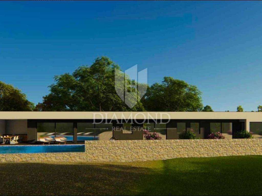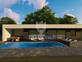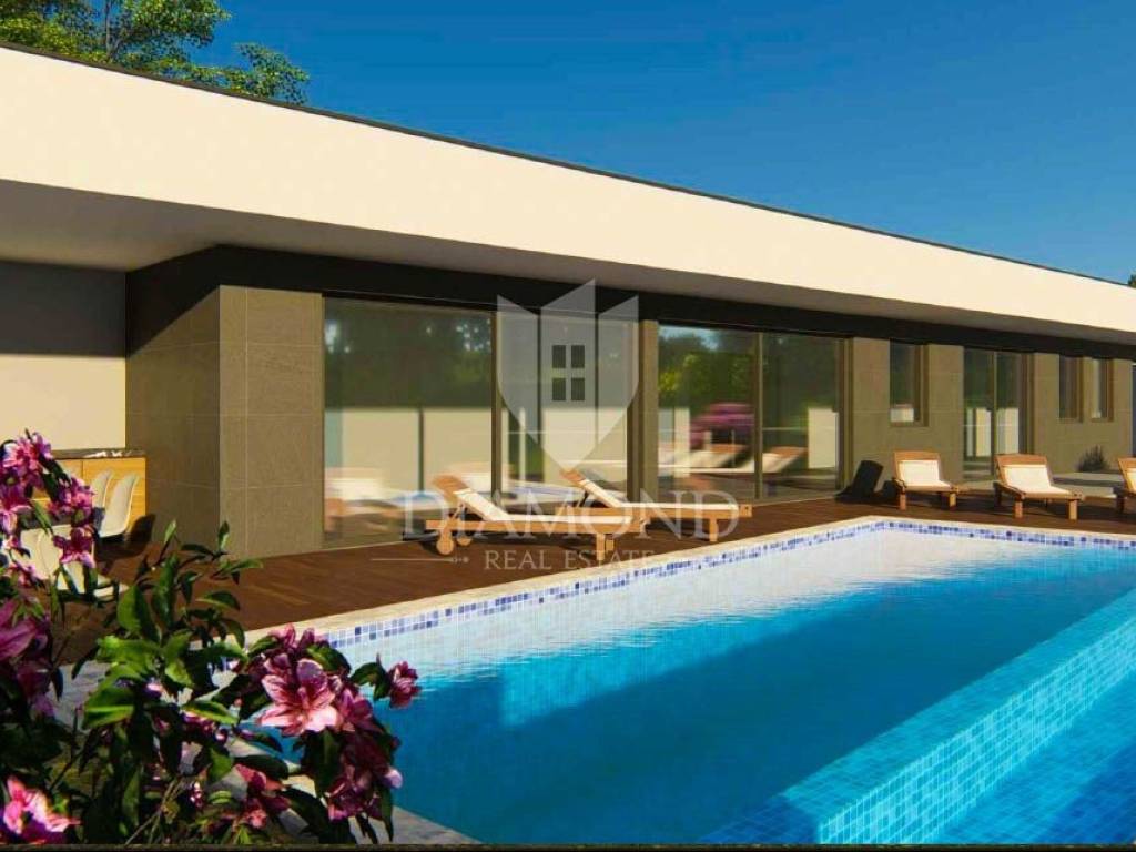 This house covers 176.90 m2 of gross surface area, of which even 50 m2 is a large terrace that stretches along the entire length of the house, and from every room there is access to it and the garden. In nature, this house has a modern floor plan where the largest room in terms of the open space concept is the living room, kitchen and dining room. Daylight and a beautiful view of nature can be seen through a large glass wall that leads to the terrace and garden, where there is also an overflow pool of 32m2. In the continuation of this modern one-story house, there is a guest toilet and three more bedrooms with their own bathrooms.