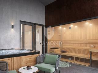 The villa will be located on a plot of 873m2 and its area will be 200m2. The ground floor of the villa will consist of a spacious kitchen with dining area, living room, toilet, storage room and boiler room. Glass walls will be placed throughout the living space, which will allow the space to receive a large amount of light. In the living room there will be a modern fireplace that will provide future owners in the winter days of additional atmosphere and warmth. Elegant staircase will lead to the first floor where there will be four bedrooms, one of which will have access to the terrace and sea view, three bathrooms, additional living room with access to a covered and partially enclosed terrace with jacuzzi and sauna from which a sea view will be provided. On the beautifully landscaped garden there is a heated pool of 56m2 with sun deck and a small summer kitchen. Heating of the house will be regulated by underfloor heating on a heat pump, and cooling will be via air conditioning. The villa is for sale unfurnished.