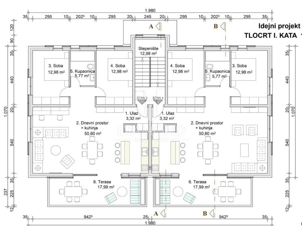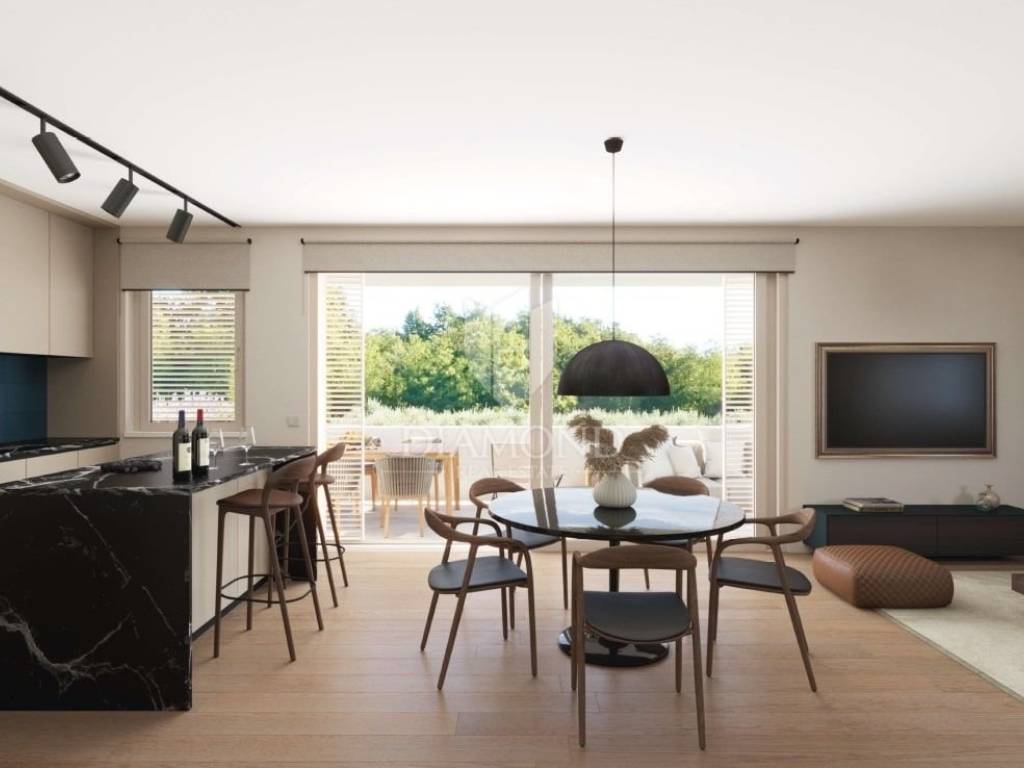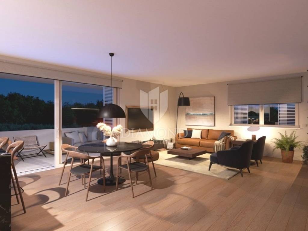 This modern residential building with a total of four apartments will be located in a settlement within the city of Poreč, only 3.5 km from the center and the beaches. There will be two apartments on the ground floor and two on the first floor. The total size of the apartment will be 106.64. The apartment on the first floor will consist of a spacious living room, dining room and kitchen according to the open space concept, two comfortable bedrooms and a well-equipped bathroom. Large glass walls have been installed throughout the living room and dining room, which allow a large influx of sunlight, which gives the space itself a large source of light. The living room leads directly to a covered terrace that offers a view of nature. The apartment will be heated by high-quality inverter air conditioners and floor heating with a heat pump. For each apartment, the first phase will be prepared on the roof for the installation of solar panels, which can be installed later.