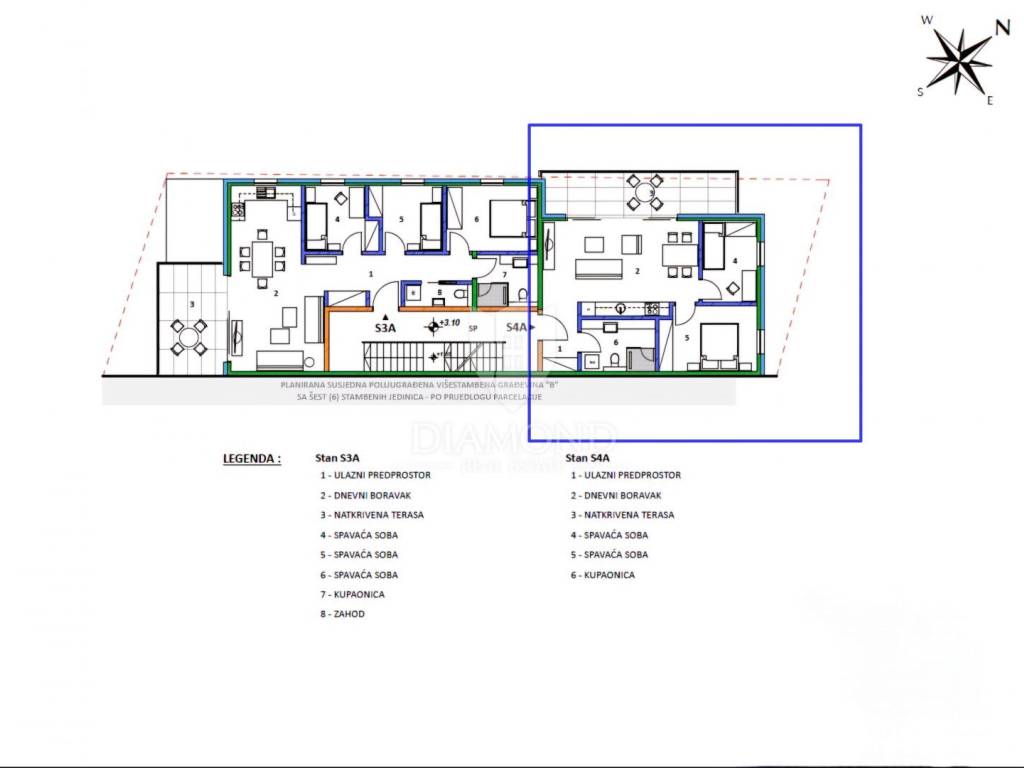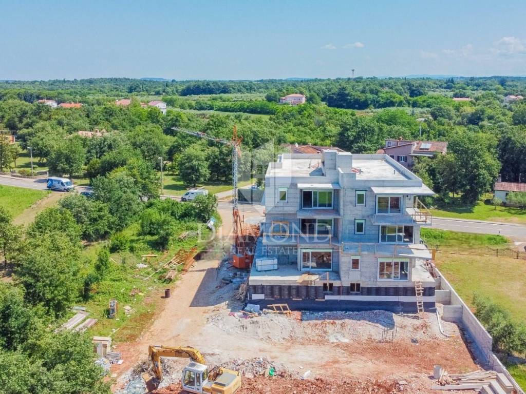 The apartment is located on the 1st floor of a modern new building with 12 apartments. The total area of the apartment is 63 m2. It consists of a living room with an open-plan kitchen and dining room, 2 bedrooms, a bathroom, and a hallway. The living room leads to a covered terrace. The apartment has a storage room and one parking space in the garage. The special feature of this apartment is the possibility of using a shared heated pool of 6 x 12 m, which will be located in front of the building.