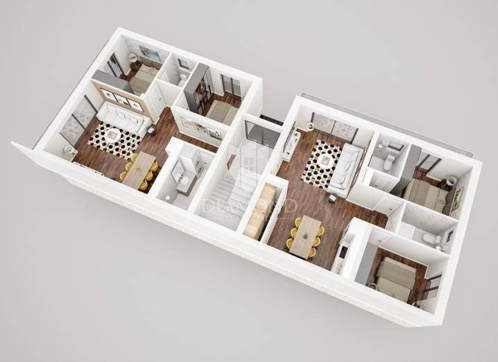 The apartment is located on the ground floor of a small building. The total area of the apartment is 73 m2. It consists of a living room with a dining room, a hallway, a bathroom and 2 bedrooms, one of which is a master bedroom with an en suite bathroom. The living room opens onto a terrace of 11 m2. The apartment is of modern construction with underfloor heating on direct current and cooling on air conditioning. The apartment also has a roof terrace of 38 m2, a storage room in the basement of the building and one parking space.