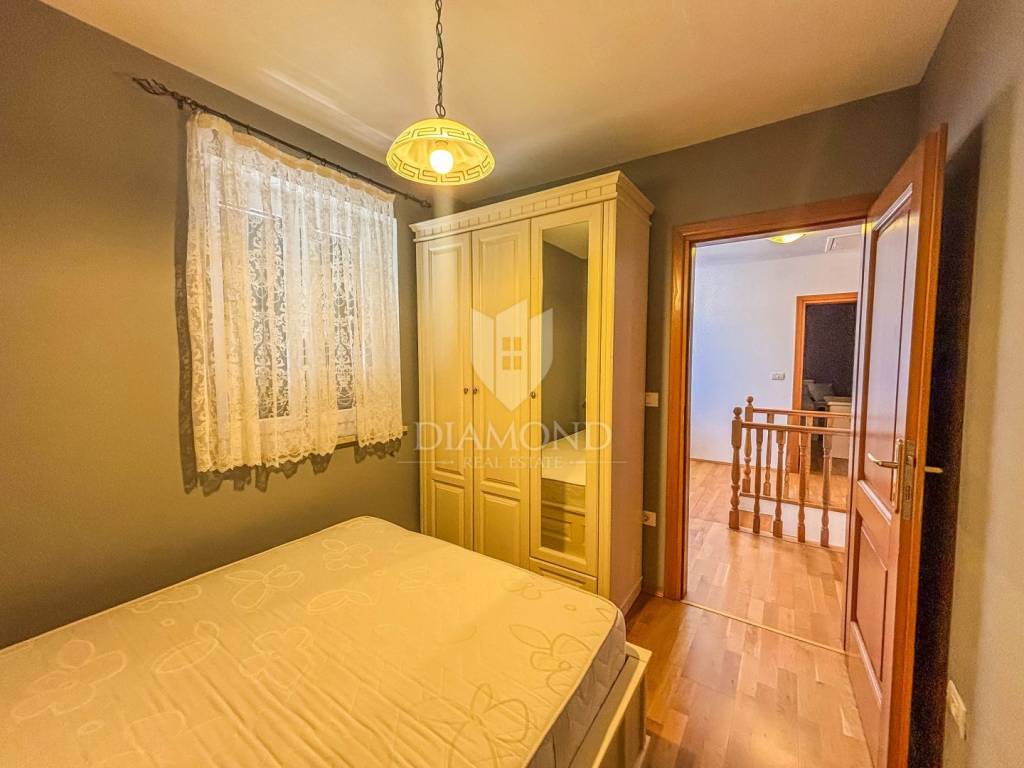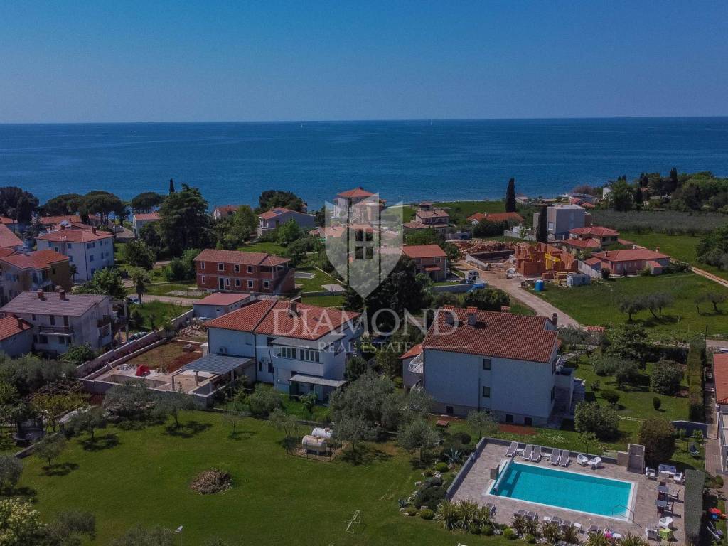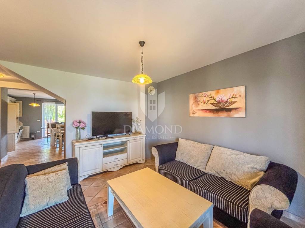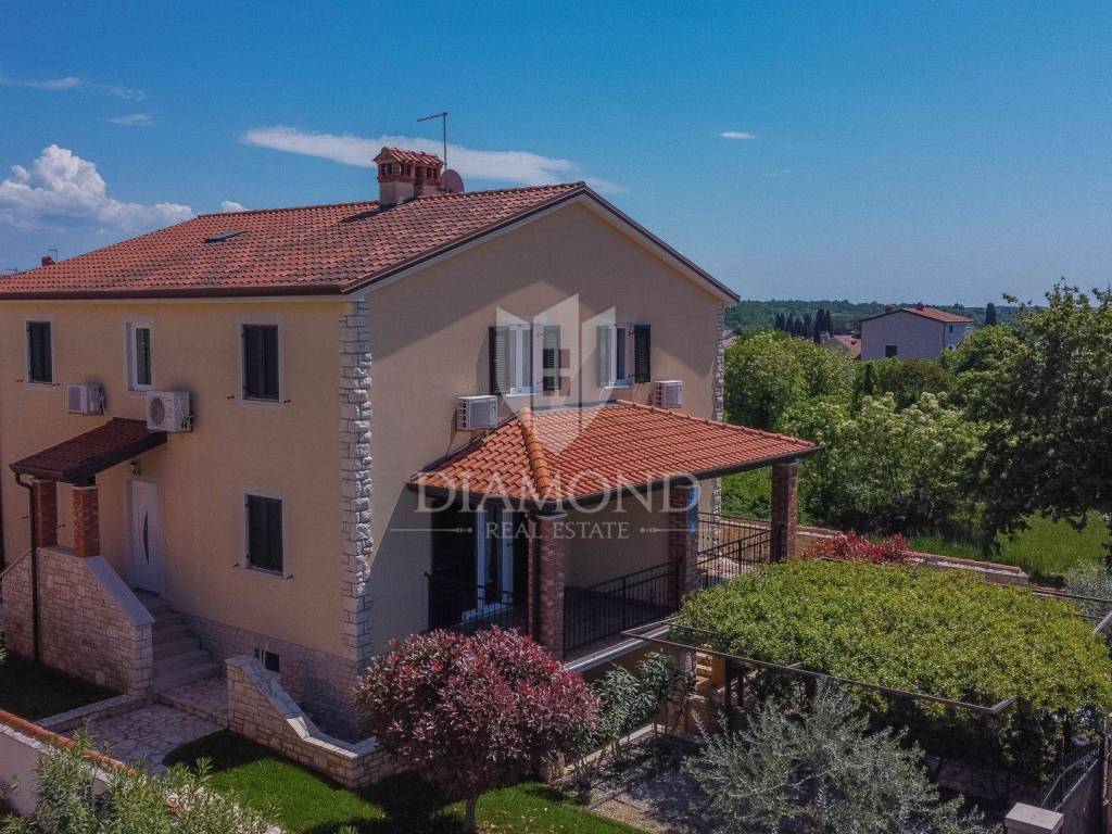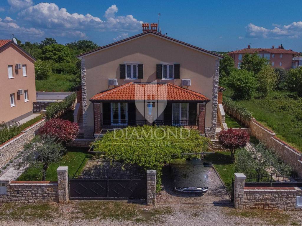 This beautiful semi-detached house is located in a small, quiet place in the vicinity of Umag, only 350 m from the beach and 7 km from the town of Umag, 10 km from Novigrad. The neighborhood is mostly family houses and private holiday homes. The house is located on the edge of the village in a quiet position and is surrounded by nature. On the ground floor there is an entrance hall, living room, separate kitchen with dining area, bathroom and storage room. On the ground floor there are two additional terraces, the smaller one is oriented towards the front of the house and is accessed through the living room, and the larger one is oriented towards the back of the house, where the pool is located, the larger terrace is accessed from the kitchen and offers a view of the sea. On the first floor there are three bedrooms and a second bathroom. The terrace and bedrooms offer a view of the sea. In the basement there is a spacious room that serves as a storage room. In front of the house there is a parking space for one vehicle, while behind the house there is a swimming pool with a sunbathing area, with a covered terrace and a fireplace. The rest of the garden is landscaped with lawn and ornamental plants, and the entire plot is fenced. The house is equipped with air conditioning for heating and cooling. Additionally, concealed pipes have been prepared for the installation of central heating, and the house also has a chimney that can be put into operation.