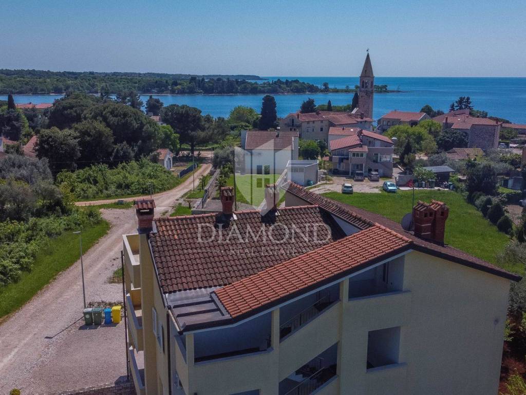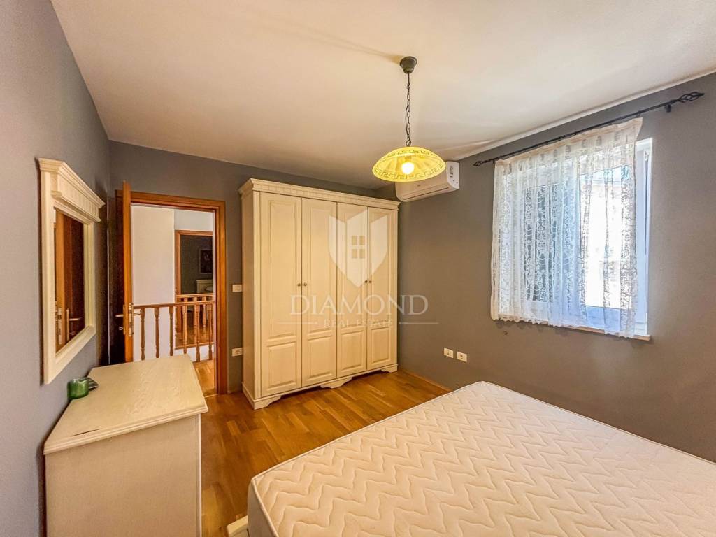 This beautiful semi-detached house is located in a small, quiet place in the vicinity of Umag, only 350 m from the beach and 7 km from the town of Umag, 10 km from Novigrad. The neighborhood is mostly family houses and private holiday homes. The house is located on the edge of the village in a quiet position and is surrounded by nature. On the ground floor there is an entrance hall, living room, separate kitchen with dining area, bathroom and storage room. On the ground floor there are two additional terraces, the smaller one is oriented towards the front of the house and is accessed through the living room, and the larger one is oriented towards the back of the house, where the pool is located, the larger terrace is accessed from the kitchen and offers a view of the sea. On the first floor there are three bedrooms and a second bathroom. The terrace and bedrooms offer a view of the sea. In the basement there is a spacious room that serves as a storage room. In front of the house there is a parking space for one vehicle, while behind the house there is a swimming pool with a sunbathing area, with a covered terrace and a fireplace. The rest of the garden is landscaped with lawn and ornamental plants, and the entire plot is fenced. The house is equipped with air conditioning for heating and cooling. Additionally, concealed pipes have been prepared for the installation of central heating, and the house also has a chimney that can be put into operation.