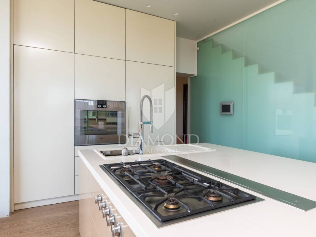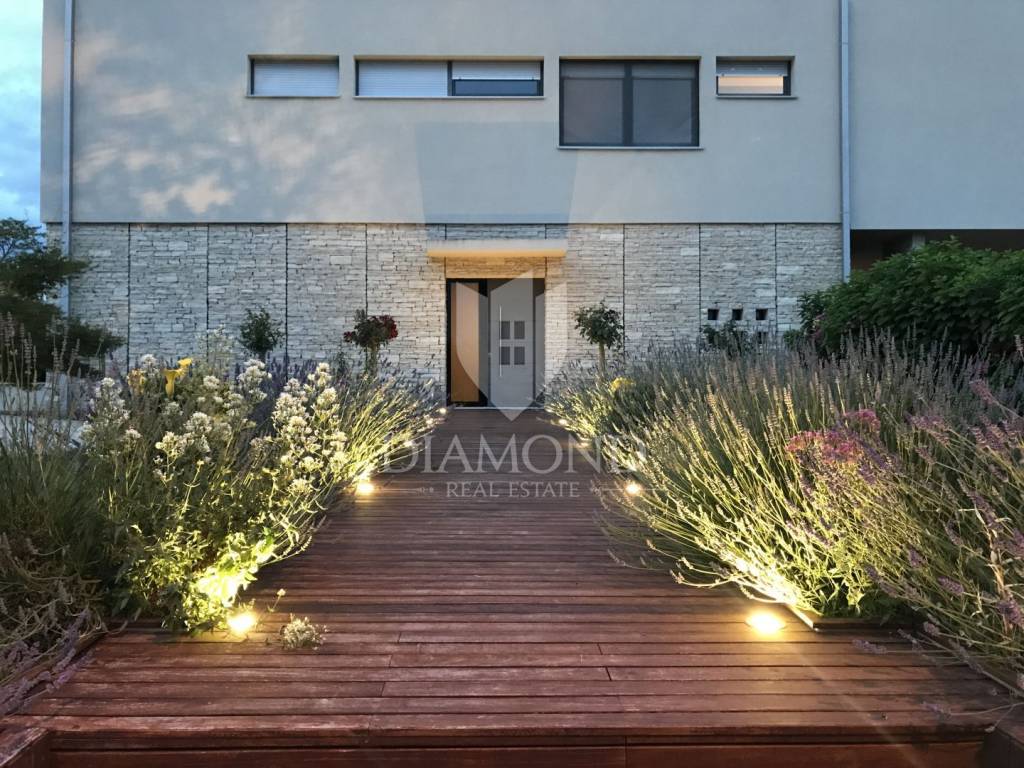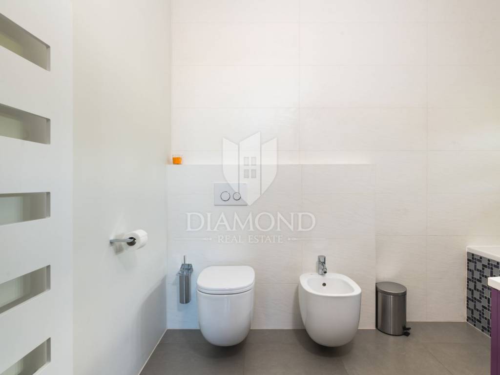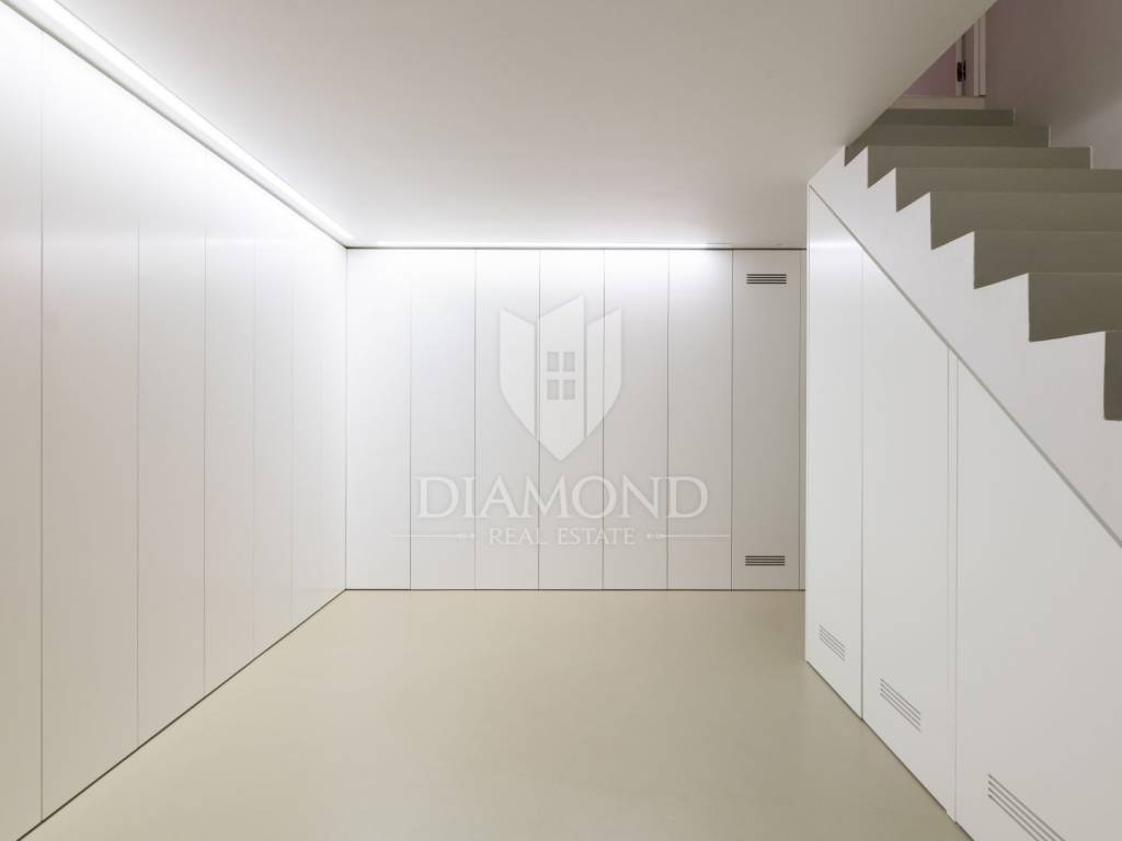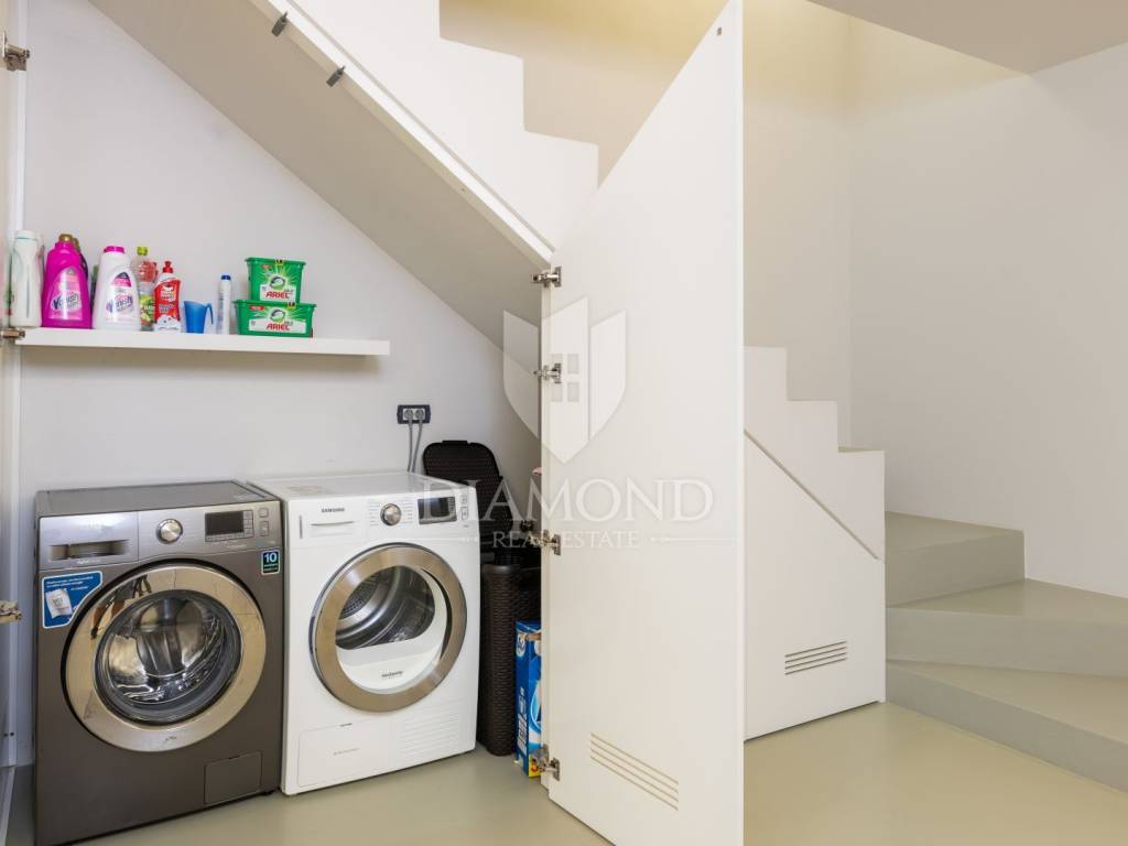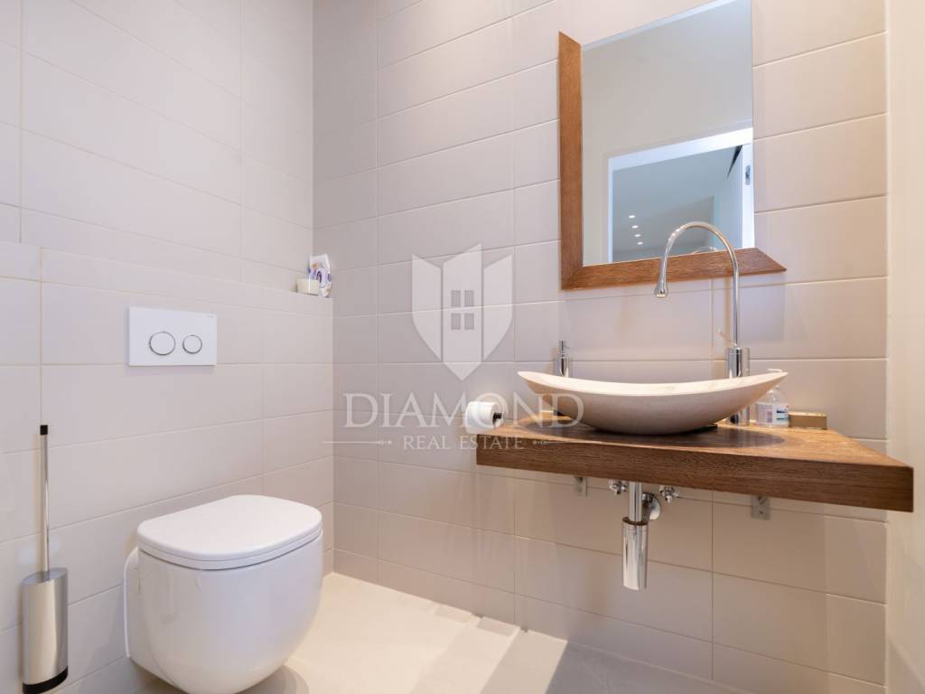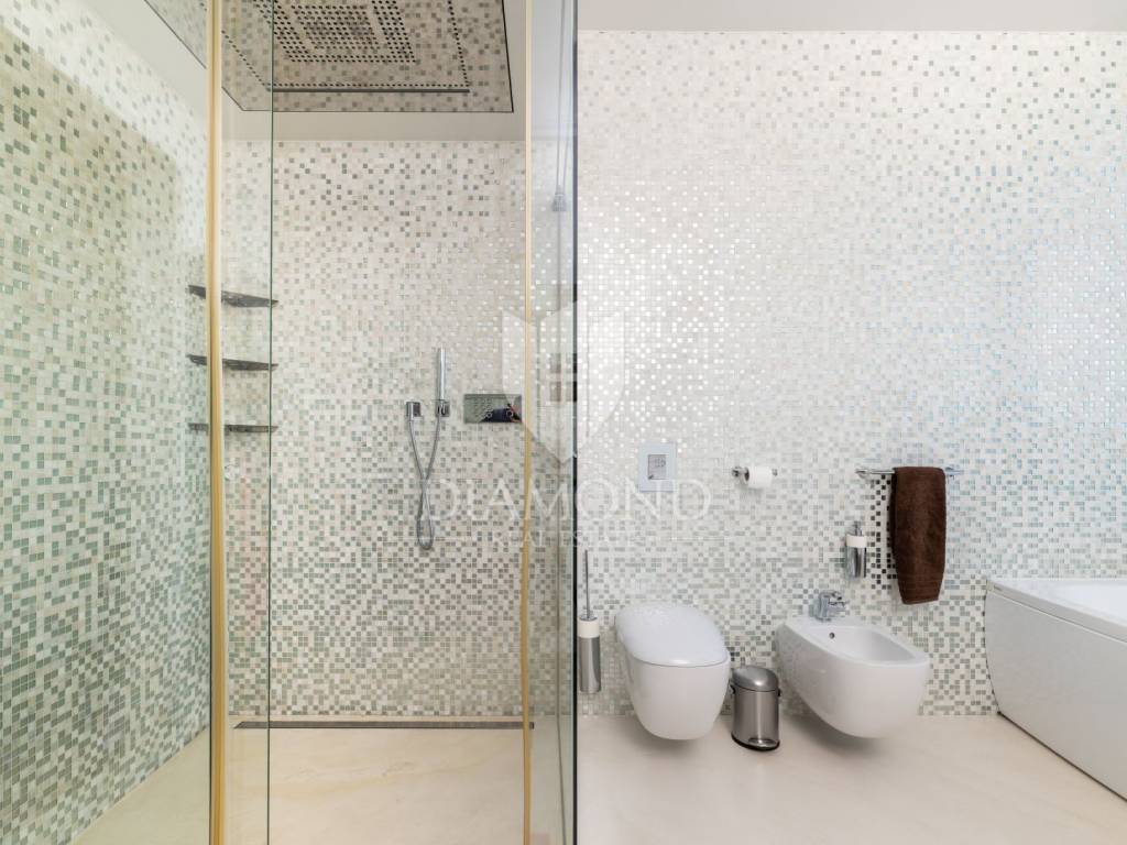 The villa has an area of 500m2 and spreads over the basement, ground floor and first floor. On the ground floor there is a spacious living room with a fireplace, well-equipped and openly designed kitchen and dining room, hallway, bedroom and bathroom. The dining room opens onto the pool next to which there is a covered terrace with a barbecue and is ideal for enjoying the summer months. The pool also has the possibility of heating. Stairs lead to the first floor, where there are 3 bedrooms, each with its own bathroom equipped with quality sanitary ware. Upstairs there is a spacious roof terrace with a beautiful sea view. On the roof terrace there is a possibility of installing a jacuzzi. In the basement there is a private cinema with a projector, screen and sound system and a space for socializing. In the basement there is a boiler room and a garage with space for several parking spaces. The villa also has a heat pump and is heated by underfloor heating, air conditioning and a fireplace. Underfloor heating can be controlled using a mobile app.