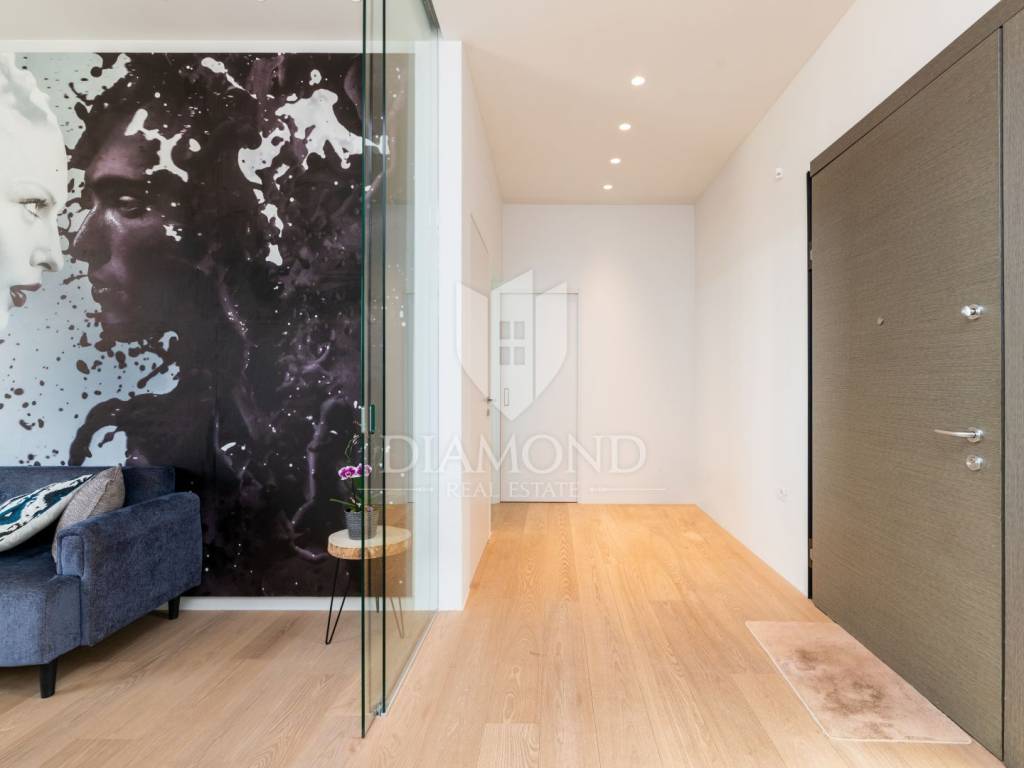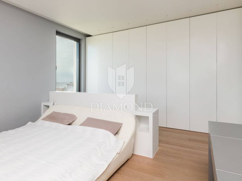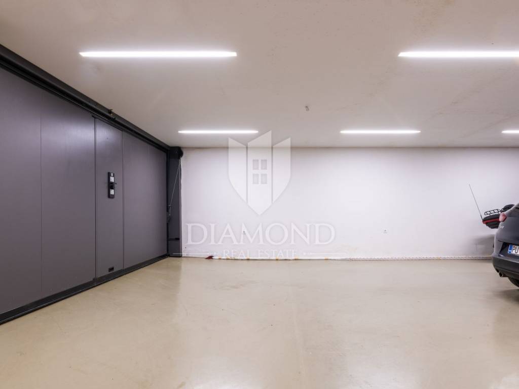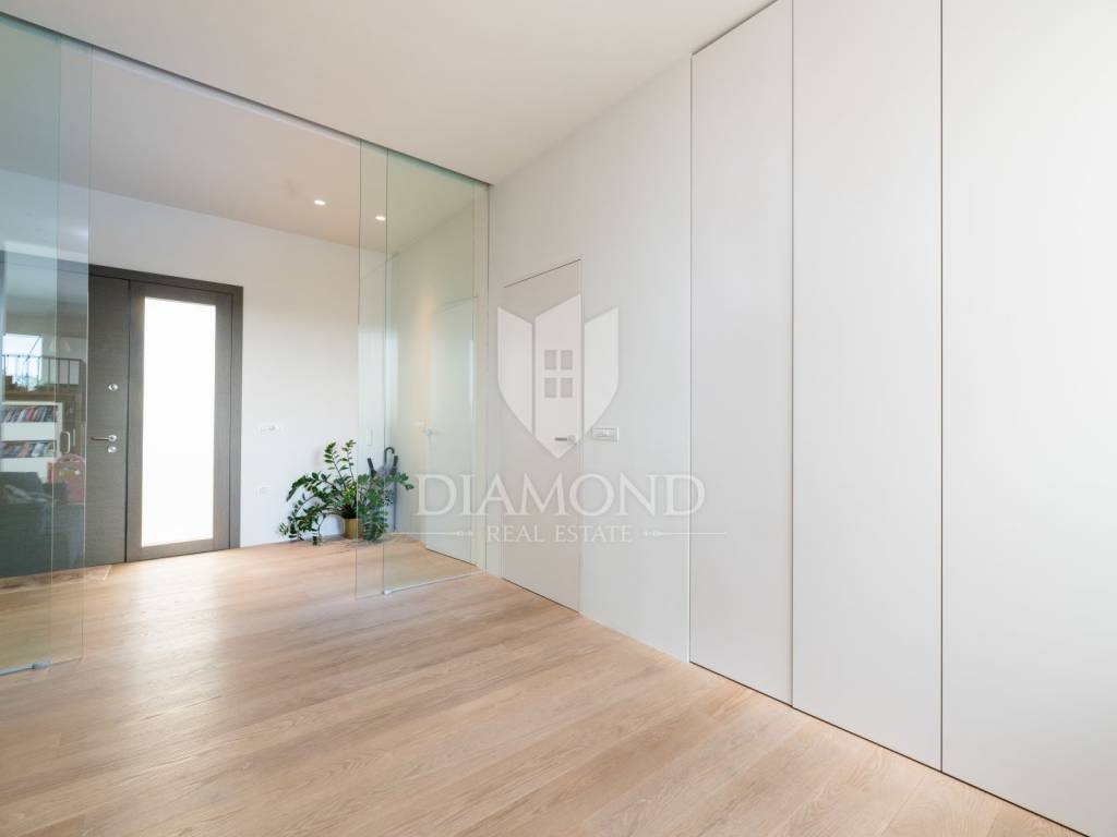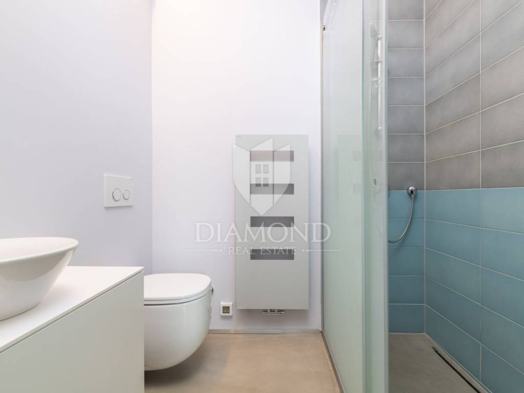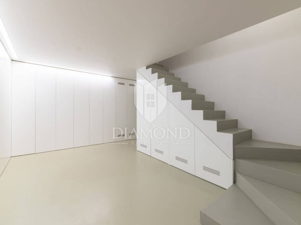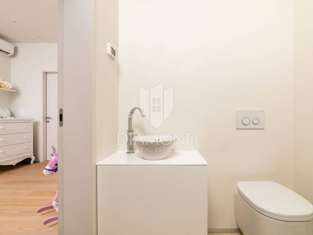 The villa has an area of 500m2 and spreads over the basement, ground floor and first floor. On the ground floor there is a spacious living room with a fireplace, well-equipped and openly designed kitchen and dining room, hallway, bedroom and bathroom. The dining room opens onto the pool next to which there is a covered terrace with a barbecue and is ideal for enjoying the summer months. The pool also has the possibility of heating. Stairs lead to the first floor, where there are 3 bedrooms, each with its own bathroom equipped with quality sanitary ware. Upstairs there is a spacious roof terrace with a beautiful sea view. On the roof terrace there is a possibility of installing a jacuzzi. In the basement there is a private cinema with a projector, screen and sound system and a space for socializing. In the basement there is a boiler room and a garage with space for several parking spaces. The villa also has a heat pump and is heated by underfloor heating, air conditioning and a fireplace. Underfloor heating can be controlled using a mobile app.