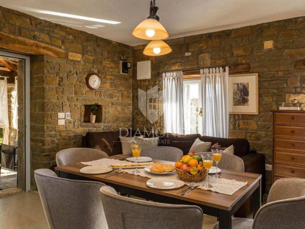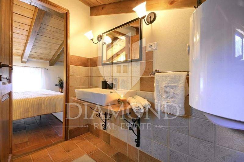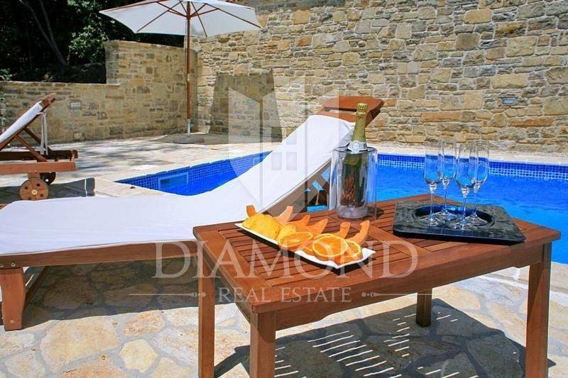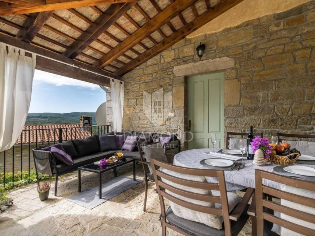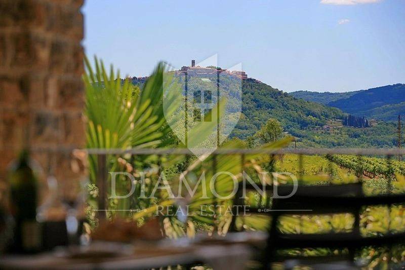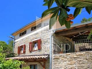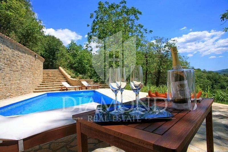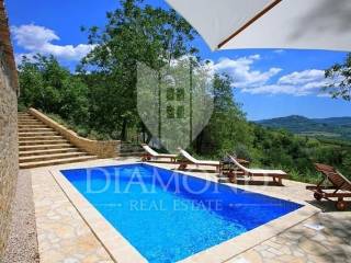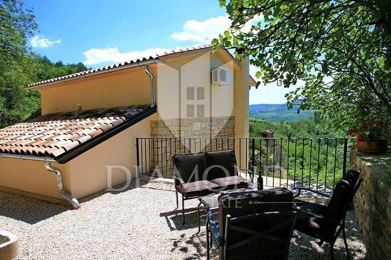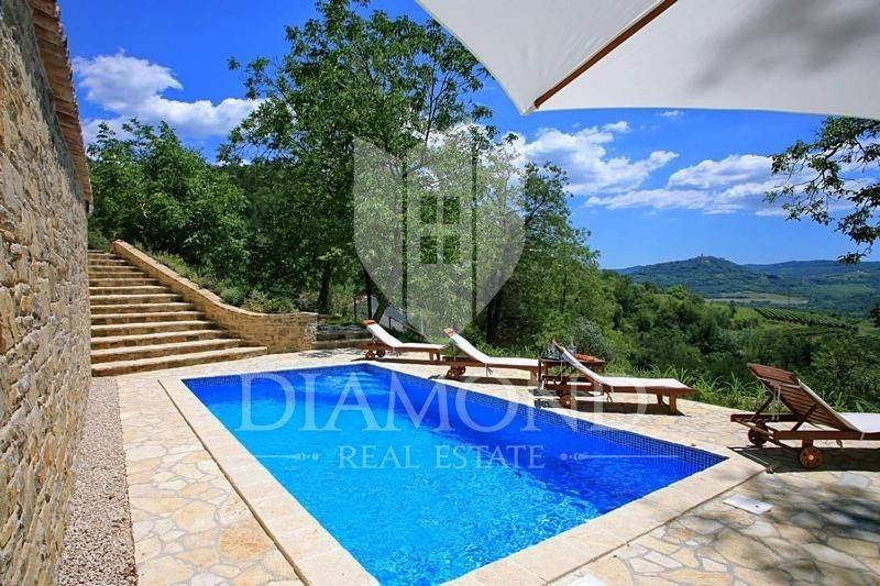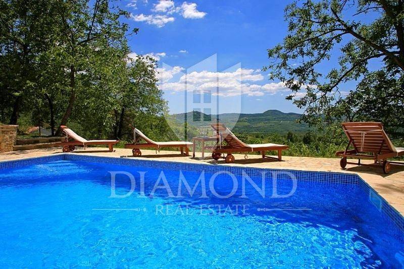 A villa with a swimming pool with a panoramic view is for sale in the vicinity of Oprtalj.