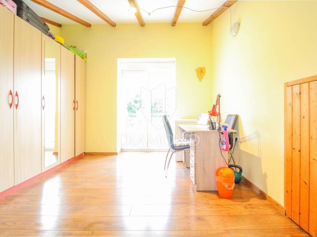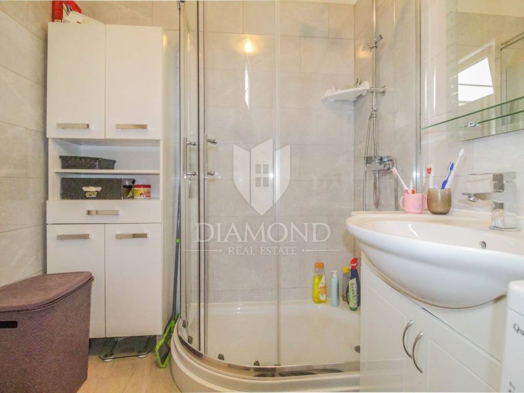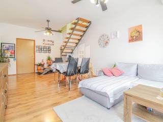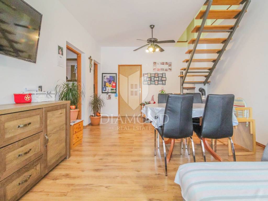 The apartment is located in a residential building and is located on the 1st floor and the attic. The area of the apartment is 90 m2. On the 1st floor there is a spacious living room with dining room, kitchen, 2 bedrooms, bathroom, hallway and a balcony ideal for socializing and enjoying. Internal stairs lead to the attic, where there is another room that can be arranged for multiple purposes and a balcony. In the attic, there are also relatively low storage rooms, the surface of which does not fit into the stated area of 90 m2. From the balcony there is a partial view even of the sea. The apartment is heated by air conditioning and a wood stove. The apartment also owns a storage room in the basement.