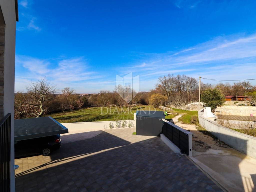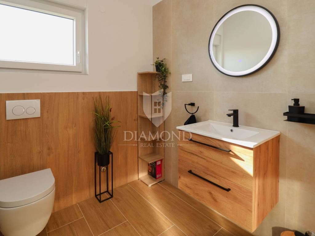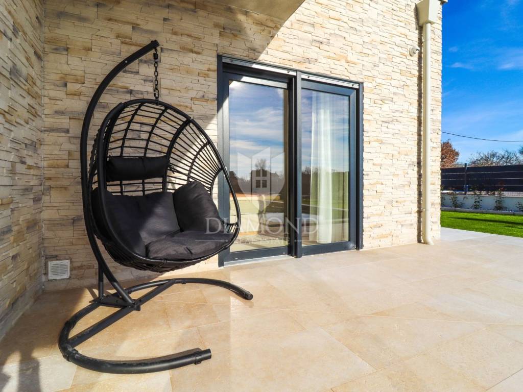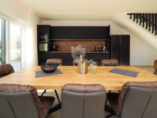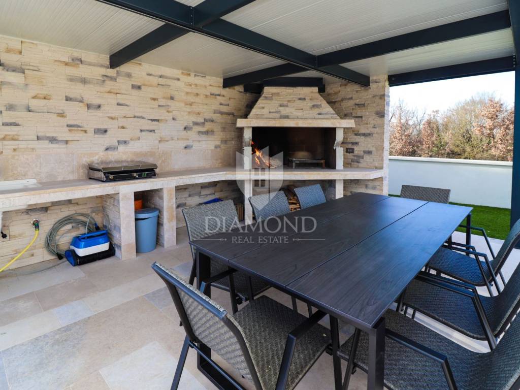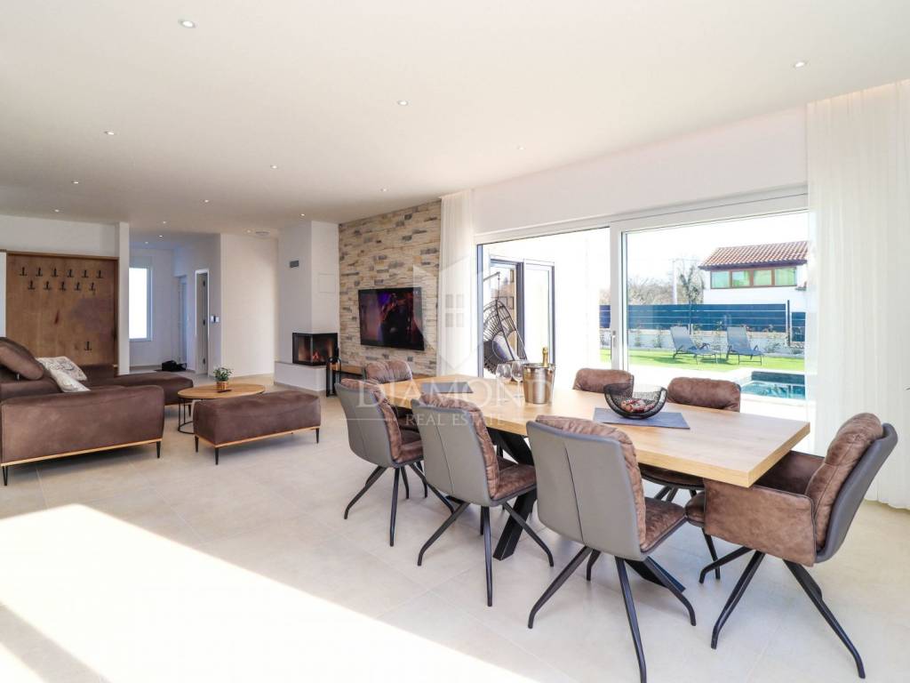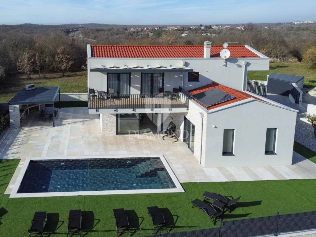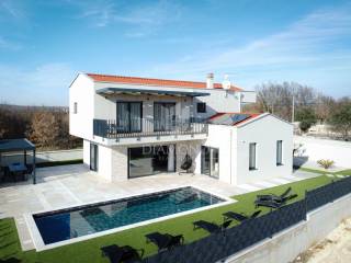 This imposing villa is located in a place known for the best-preserved medieval fortified towns in Istria. Its total area is 198.82 m2 and is spread over two floors. Upon entering the villa, we come to a spacious living room, dining room and kitchen, which have direct access to the terrace and sun deck with pool. On the ground floor there is one comfortable bedroom with a bathroom that is completely adapted for people with disabilities, another separate bathroom and a storage room. Large glass walls have been installed throughout the living room and dining room, which allow a large influx of sunlight, which gives the space itself a large source of light. The stone staircase leads to the first floor, where there are three bedrooms, each with its own bathroom and access to a spacious terrace. There will be a dining table and a summer kitchen with a wood-burning and gas fireplace on the terrace by the pool and sunbathing area, which will be partly closed and covered with solid panels. In addition to the summer kitchen, there will also be a children's park. The garden in front of the villa will be planted and decorated with Mediterranean plants. The heating of the villa is made possible by means of a heat pump as underfloor heating, air conditioners located in every room which are also used for cooling on hot summer days, through solar panels which will be used for complete heating of the villa and supply of hot water in the bathrooms. The bathrooms are connected to the depurator located in the boiler room, as well as other connections. The parking lot behind the villa will be covered for two parking spaces and uncovered parking for another two parking spaces. There will be one building in the yard as an outdoor storage room. The yard is completely fenced and has two entrances, one entrance is with an electric gate. The villa is located on the edge of the construction zone in a quiet place, only 15 km from the city of Poreč and its beautiful beaches. The villa is fully furnished with high-quality furniture. All facilities for life such as school, kindergarten, shop, catering facilities and post office are located just a few minutes away by car. The planned completion of construction is the winter of 2023. This fully furnished villa with full contents is an ideal investment for tourist rental.