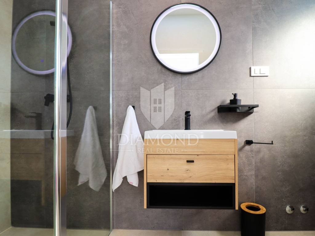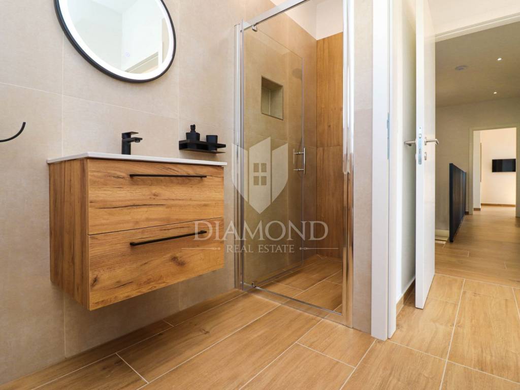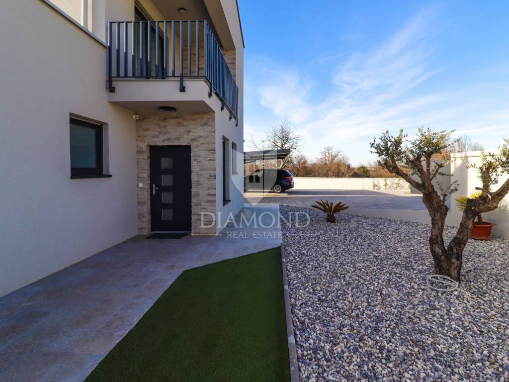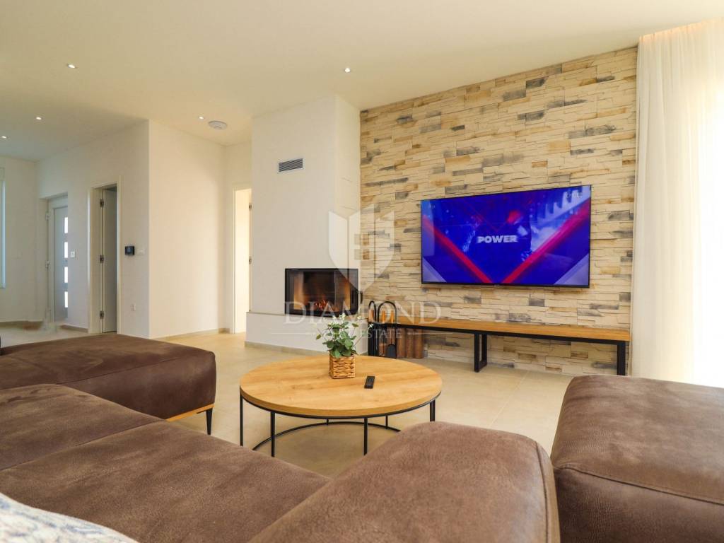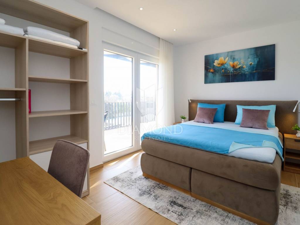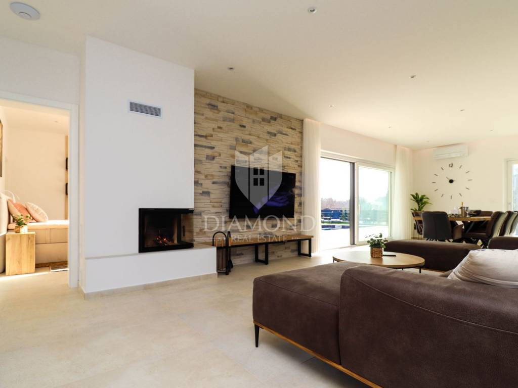 This imposing villa is located in a place known for the best-preserved medieval fortified towns in Istria. Its total area is 198.82 m2 and is spread over two floors. Upon entering the villa, we come to a spacious living room, dining room and kitchen, which have direct access to the terrace and sun deck with pool. On the ground floor there is one comfortable bedroom with a bathroom that is completely adapted for people with disabilities, another separate bathroom and a storage room. Large glass walls have been installed throughout the living room and dining room, which allow a large influx of sunlight, which gives the space itself a large source of light. The stone staircase leads to the first floor, where there are three bedrooms, each with its own bathroom and access to a spacious terrace. There will be a dining table and a summer kitchen with a wood-burning and gas fireplace on the terrace by the pool and sunbathing area, which will be partly closed and covered with solid panels. In addition to the summer kitchen, there will also be a children's park. The garden in front of the villa will be planted and decorated with Mediterranean plants. The heating of the villa is made possible by means of a heat pump as underfloor heating, air conditioners located in every room which are also used for cooling on hot summer days, through solar panels which will be used for complete heating of the villa and supply of hot water in the bathrooms. The bathrooms are connected to the depurator located in the boiler room, as well as other connections. The parking lot behind the villa will be covered for two parking spaces and uncovered parking for another two parking spaces. There will be one building in the yard as an outdoor storage room. The yard is completely fenced and has two entrances, one entrance is with an electric gate. The villa is located on the edge of the construction zone in a quiet place, only 15 km from the city of Poreč and its beautiful beaches. The villa is fully furnished with high-quality furniture. All facilities for life such as school, kindergarten, shop, catering facilities and post office are located just a few minutes away by car. The planned completion of construction is the winter of 2023. This fully furnished villa with full contents is an ideal investment for tourist rental.