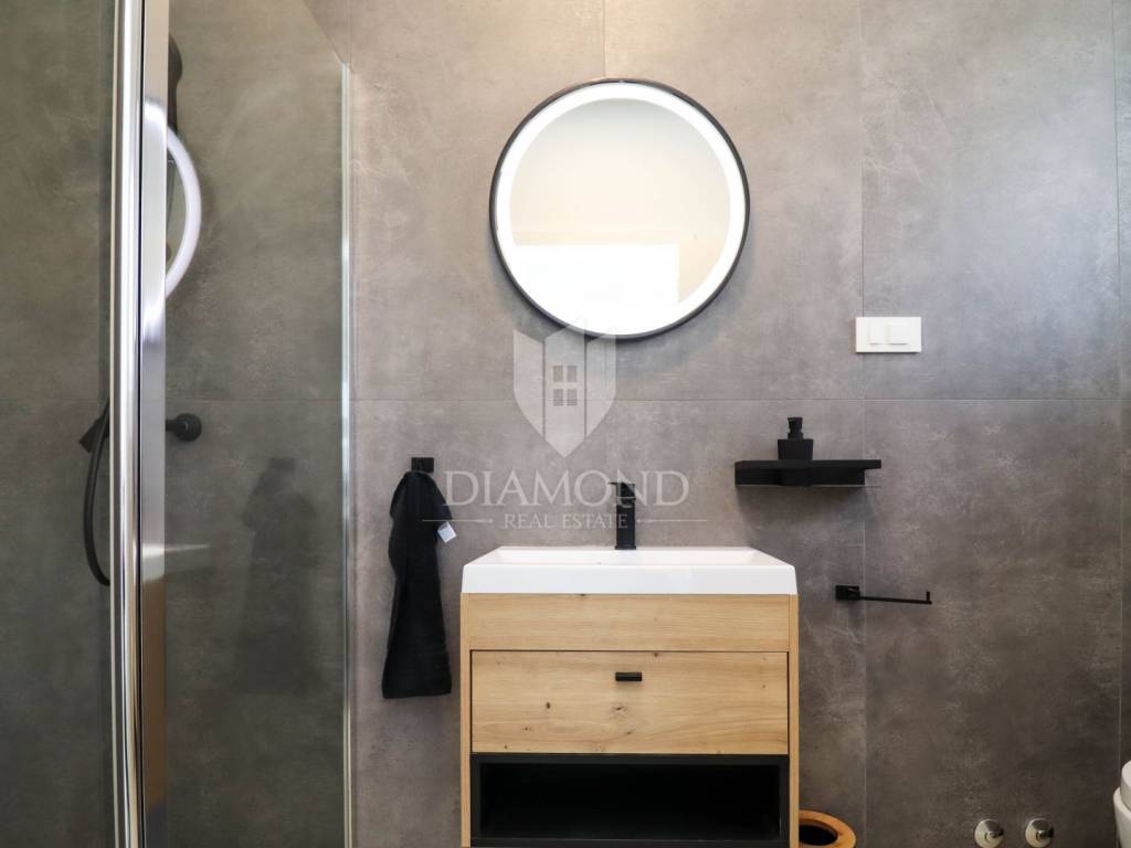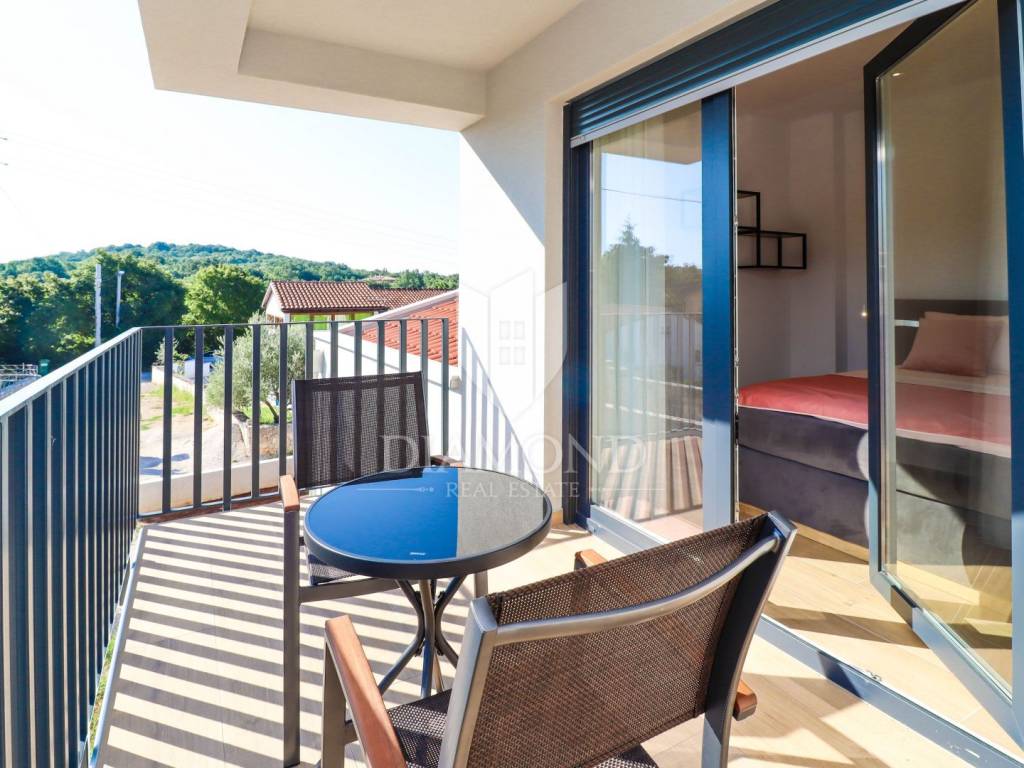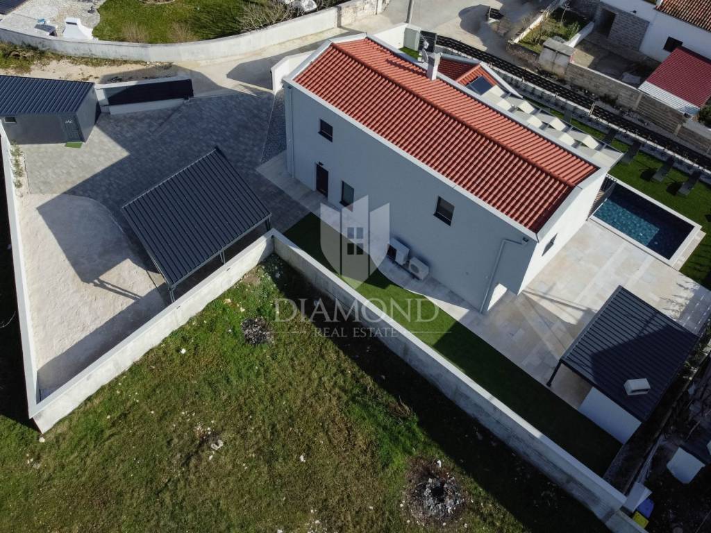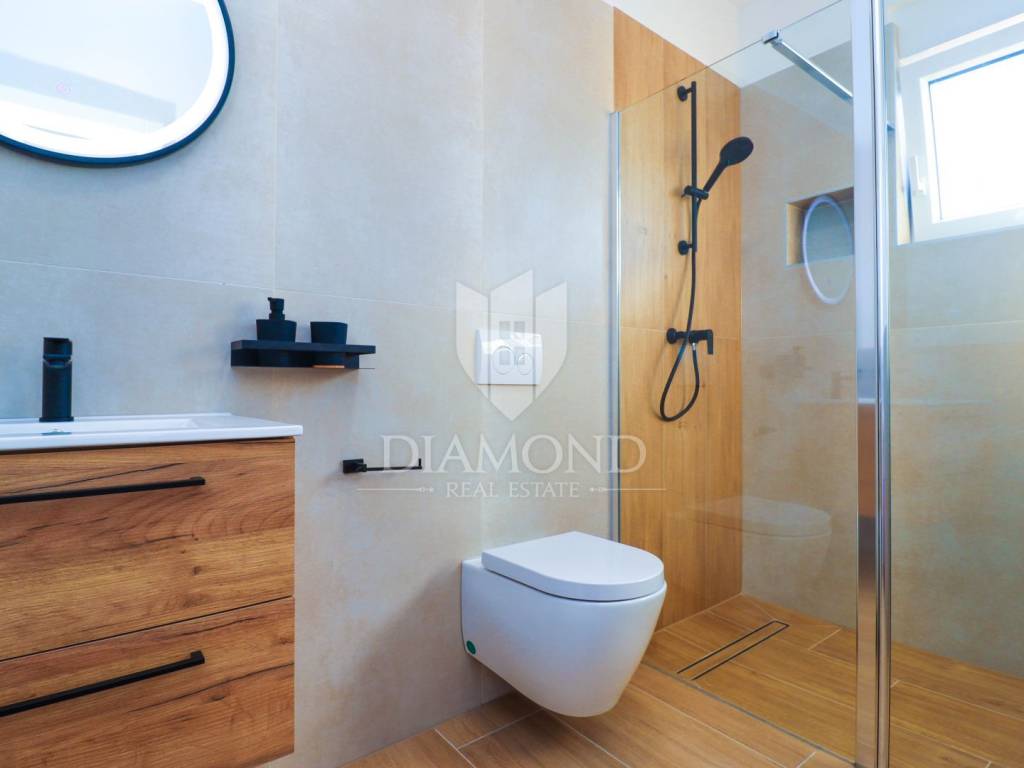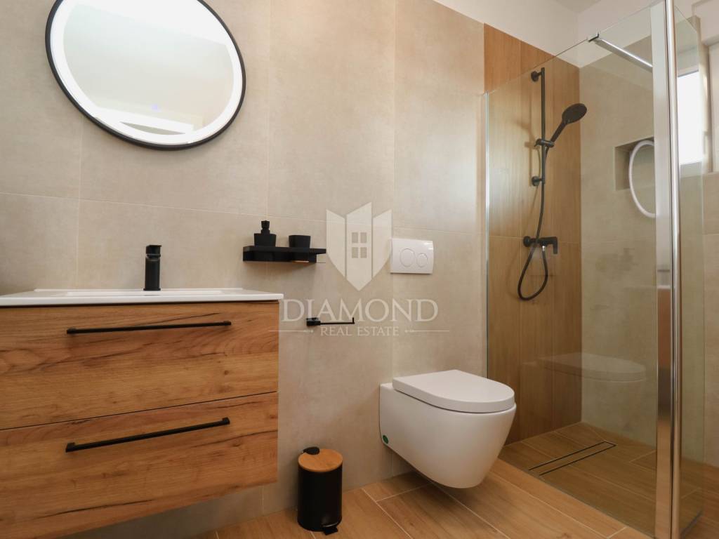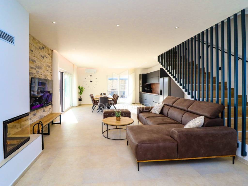 This imposing villa is located in a place known for the best-preserved medieval fortified towns in Istria. Its total area is 198.82 m2 and is spread over two floors. Upon entering the villa, we come to a spacious living room, dining room and kitchen, which have direct access to the terrace and sun deck with pool. On the ground floor there is one comfortable bedroom with a bathroom that is completely adapted for people with disabilities, another separate bathroom and a storage room. Large glass walls have been installed throughout the living room and dining room, which allow a large influx of sunlight, which gives the space itself a large source of light. The stone staircase leads to the first floor, where there are three bedrooms, each with its own bathroom and access to a spacious terrace. There will be a dining table and a summer kitchen with a wood-burning and gas fireplace on the terrace by the pool and sunbathing area, which will be partly closed and covered with solid panels. In addition to the summer kitchen, there will also be a children's park. The garden in front of the villa will be planted and decorated with Mediterranean plants. The heating of the villa is made possible by means of a heat pump as underfloor heating, air conditioners located in every room which are also used for cooling on hot summer days, through solar panels which will be used for complete heating of the villa and supply of hot water in the bathrooms. The bathrooms are connected to the depurator located in the boiler room, as well as other connections. The parking lot behind the villa will be covered for two parking spaces and uncovered parking for another two parking spaces. There will be one building in the yard as an outdoor storage room. The yard is completely fenced and has two entrances, one entrance is with an electric gate. The villa is located on the edge of the construction zone in a quiet place, only 15 km from the city of Poreč and its beautiful beaches. The villa is fully furnished with high-quality furniture. All facilities for life such as school, kindergarten, shop, catering facilities and post office are located just a few minutes away by car. The planned completion of construction is the winter of 2023. This fully furnished villa with full contents is an ideal investment for tourist rental.
