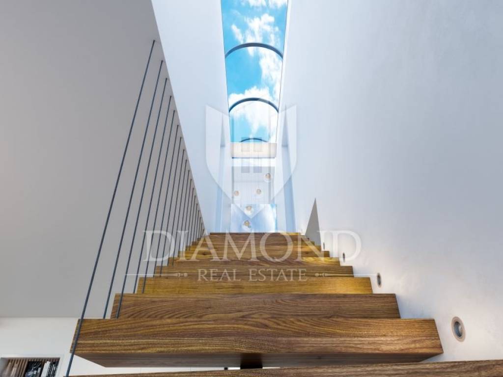 This impressive villa stands out for its unique modern design, enriched with authentic stone parts and wooden elements, resulting in a perfect blend of style and functionality, perfectly blending into the natural environment. Its modern lines and shapes blend elegantly with natural elements, creating harmony between tradition and innovation. Large glass walls allow abundant natural light to illuminate every corner of the space, creating a sense of spaciousness and harmony with the surrounding environment. Of particular note are the openings on the roof, which extend along the length above the stairs. In addition to contributing to natural lighting, openings in the roof create a unique opportunity to experience freedom and connection with the atmosphere and natural elements, allowing a view of the starry sky at night. The infinity pool is the central element of this modern villa, creating the impression of merging the water with the sky or the sea in the distance. One of the walls of the pool is made of transparent glass, creating a unique visual effect.