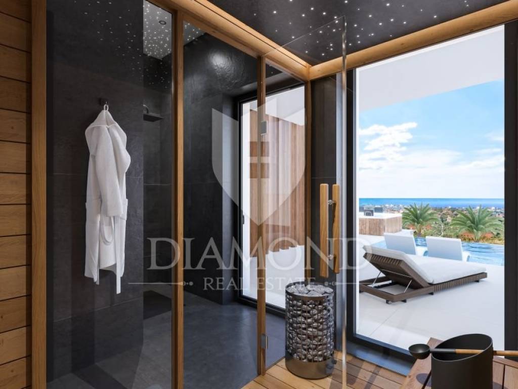 Right next to the pool, separated only by transparent glass, there is a fire pit, another enchanting addition that adds to the overall ambience of the villa. The fire pit, located at the pool level, provides warmth and a romantic atmosphere, making it an ideal place to socialize and relax. In the evening, the light of the flame reflects off the glass wall of the pool, creating a fascinating play of light. The villa also offers many luxurious facilities, including an elegant sauna with a starry sky and an outdoor jacuzzi. With four spacious bedrooms, each with its own en-suite bathroom and sea view, it provides perfect accommodation for family or guests. A large living room with an open space towards the dining room and kitchen creates a feeling of spaciousness and comfort. In addition, there is also a billiard room, a double staircase and many modern technical features such as underfloor heating and cooling with a heat pump, solar panels and a heated swimming pool with a heat pump.