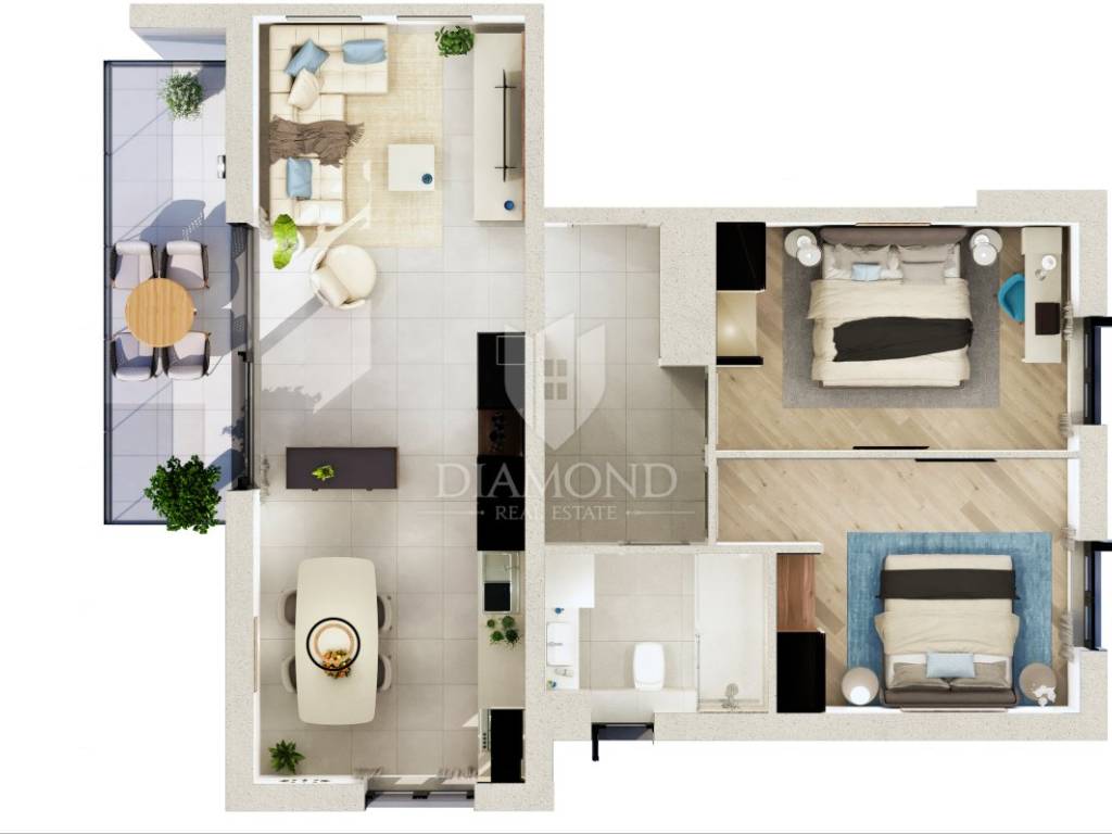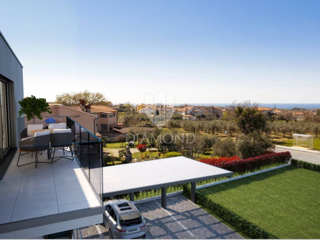 Poreč, two-bedroom apartment on the first floor with a sea view. A modern building with a total of eight apartments with a sea view is under construction in the suburbs of Poreč. An apartment for sale on the second floor of a total of 74.49 m2. The apartment consists of a living room, a dining room, a kitchen and two bedrooms, a bathroom and a storage room. The living room leads directly to the terrace with a beautiful view of the sea. Heating of the apartment is planned via an air conditioner, there will be underfloor heating in the bathroom. There is a covered parking lot in front of the building. Catering facilities, shops, post office, bank are located near the place. The beaches are only 6 km away. Construction will start in the spring, and the planned completion of construction would be in October 2025. The property is subject to VAT. The amount of the property includes VAT. This property is an ideal investment for tourist rental.